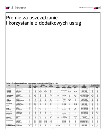8 finanse Wtorek | 9 lutego 2010 ! rp .pl Premie za oszcz!dzanie i korzystanie z dodatkowych us"ug Pakiety dla mikroprzedsi%biorstw proponowane przez wybrane banki (op# aty w z# ) Bank 1. Alior Bank 2. Bank BG! 3. Bank BPH 4. Bank BPS Pakiet Rachunek Zarabiaj!cy Firma Plan 1 Biznes Symetria Pakiet Biznes Pakiet e-Biznes 5. Bank Millennium Konto Biznes 6. Bank Pekao Mój Biznes Startowy Mój Biznes Net 7. BGK Rachunek 8. BO" Bank Konto Wyj!tkowe Firma 9. BZ WBK Biznes Pakiet 10. Citi Handlowy Przyst#pny Bia" y Dynamiczny Czerwony 11. GBW W" asny Biznes Ekspert 12. HSBC Rachunek 13. ING Bank Direct dla Ma" ych 14. Invest-Bank Pakiet Biznes Pakiet Biznes Plus 15. Kredyt Bank Ekstrabiznes Mikro 16. mBank mBiznes konto mBiznes max 17. MR Bank Biznes 18. Nordea Bank Rachunek 19. Raiffeisen Bank Pakiet Srebny Pakiet Z" oty Pakiet Platynowy 20. Toyota Bank Rachunek 21. Volkswagen Bank direct Plus Konto Biznes Oproc. w skali roku w proc. 0 0 0 0 0 0 0,01 0 0,2 0 0 0,01 0,01 0,35 0,35 0 0 0 0 0 0 1 0,5 0 0 0 0 0,25 – 1,75 0,1 Op# ata za prowadzenie mies. 0 12 20 20 39 0 – 25 19 0 40 9 0 – 150 0 – 20 0 – 40 35 30 0 0 40 60 12 0 0 25 9 0 – 18 0 – 38 0 – 78 10 0 Przelew internetowy do ZUS do US 0 1,5 od 1,75 1,9 1,9 0 0 1 1 0 1 – 3,5 0 0 — — 0–1 1 0 0 1 0–4 0–4 0,4 1 0 – 0,9 0 – 0,9 0 – 0,9 1 0 0 1,5 od 1,75 1,9 1,9 0 0 1 1 0 1,5 – 3,5 0 0 — — 0–1 1 0 0 1 0–4 0–4 0,5 1 0 – 0,9 0 – 0,9 0 – 0,9 3 0 Zlecenie sta# e zewn%trzne 1 1,5 1,5 1,5 1,5 0–2 1 1 b.d. 0,95 1,5 – 2,5 0,5 0,5 — — 1 1 0 0 1 0–2 0–2 0,5 1 0 – 0,9 0 – 0,9 0 – 0,9 0 0 Op# ata za wydanie u$ywanie wydanie u$ytkowanie karty karty karty karty kredytowej debetowej debetowej kredytowej rocznie 0 – jedna karta 15 z" w 2. roku 0 – jedna karta 0 – 40 0 150 – 400 rocznie — — 0 0 100 – 150 100 – 150 0 0 — — 0 0 — — 0 – 15 0 –2,99 mies. 75 0 – 75 0 0 0 98 0 23,88 rocznie 0 98 0 2,5 mies. 100–150 0 20 0 95 0 0 0 – 25 rocznie — — 0 2,5 – 5 mies. — 150 – 390 0 2,5 – 5 mies. — 150 – 390 25 0 — — 25 0 — — 0 0 0 49 0 0 – 3 mies. 0 0 – 50 0 0 — — 0 0 — — 0 48 rocznie — — 0 3,5 mies. 0 6 z" mies. 0 3,5 mies. 0 6 z" mies. 0 – 15 72 – 120 rocznie — — 0 0 0 100 0 0 – 3,5 mies. 49 49 0 0 – 3,5 mies. 49 49 0 0 – 3,5 mies. 49 49 40 0 200 0 50 z" za 2 lata 0 — — Jak mo$na skontaktowa& si%z bankiem Internet, telefon, SMS Internet, telefon Internet, telefon Internet, telefon, SMS Internet, telefon, SMS Internet, telefon, SMS, WAP Internet, telefon, SMS Internet, telefon, SMS Internet, telefon, Internet, telefon, SMS Internet, telefon, SMS, WAP Internet, telefon Internet, telefon Internet, telefon, SMS Internet, telefon, SMS Internet, telefon, chat Internet, telefon, SMS Internet, telefon, SMS Internet, telefon, SMS Internet, telefon, SMS Internet, telefon Internet, telefon Internet Internet, telefon, SMS, WAP Internet, telefon, WAP, IPT Internet, telefon, WAP, IPT Internet, telefon, WAP, IPT Internet, telefon Internet, telefon Mies. koszt prowadzenia rachunku pomocniczego z# otowego w walucie obcej 5 5 12 20 20 20 10 25 10 25 0 – 25 5 25 25 25 25 40 30 25 25 0 – 50 25 b.d. b.d. b.d. b.d. 35 15 30 15 0 0 0 19 15 6 – 12 15 6– 12 15 15 — — — — 25 17 9 9 10 10 5 5 0 0 — — 0 — r!do: banki