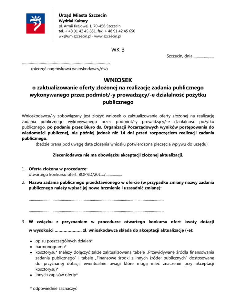 Urząd Miasta Szczecin Wydział Kultury pl. Armii Krajowej 1, 70-456 Szczecin tel. + 48 91 42 45 651, fax: + 48 91 42 45 650 [email protected] ∙ www.szczecin.pl WK-3 Szczecin, dnia ……………….. ................................................................................................ (pieczęć nagłówkowa wnioskodawcy/ów) WNIOSEK o zaktualizowanie oferty złożonej na realizację zadania publicznego wykonywanego przez podmiot/-y prowadzący/-e działalność pożytku publicznego Wnioskodawca/-y zobowiązany jest złożyć wniosek o zaktualizowanie oferty złożonej na realizację zadania publicznego wykonywanego przez podmiot/-y prowadzący/-e działalność pożytku publicznego, po podaniu przez Biuro ds. Organizacji Pozarządowych wyników postępowania do wiadomości publicznej, nie później jednak niż 14 dni przed rozpoczęciem realizacji zadania publicznego. (będzie brana pod uwagę data złożenia wniosku potwierdzona pieczęcią wpływu do urzędu) Zleceniodawca nie ma obowiązku akceptacji złożonej aktualizacji. 1. Oferta złożona w procedurze: otwartego konkursu ofert: BOP/ID/201…/……………. 2. Nazwa zadania publicznego przedstawionego w ofercie (w przypadku zmiany nazwy zadania publicznego należy wpisać jej nowe brzmienie i uzasadnić zmianę): ………………………………………………………………………………………………………………….. ………………………………………………………………………………………………………………….. 3. W związku z przyznaniem w procedurze otwartego konkursu ofert kwoty dotacji w wysokości ………………… zł, wnioskodawca składa do akceptacji aktualizację (-e): opisu poszczególnych działań* harmonogramu* kosztorysu* (należy dołączyć także zaktualizowaną tabelę „Przewidywane źródła finansowania zadania publicznego” i tabelę „Finansowe środki z innych źródeł publicznych” dostosowane do przyznanej dotacji, ewentualnie uwagi które mogą mieć znaczenie przy akceptacji kosztorysu)* innych zapisów oferty* * odpowiednie zaznaczyć *Uwaga: należy dołączyć w formie załącznika do niniejszego wniosku zaktualizowany: opis poszczególnych działań/harmonogram/kosztorys z w/w tabelami/inne zapisy oferty oraz Pakiet działań promocyjnych realizowanych w związku z otrzymanym dofinansowaniem. Uwaga! Wszystkie strony załączników składanych do niniejszego wniosku muszą być podpisane przez osobę/-y upoważnioną/-e do składania oświadczeń woli w imieniu wnioskodawcy/-ów. 4. Zmiany zakresu rzeczowego zadania publicznego: a) wydarzenia lub przedsięwzięcia, które nie zostaną zrealizowane (należy wpisać te działania, które były planowane w ofercie a zgodnie z aktualizacją nie będą realizowane): …………………………………………………………………………………………………………………………………………………… …………………………………………………………………………………………………………………………………………………… …………………………………………………………………………………………………………………………………………………… b) wydarzenia lub przedsięwzięcia lub ich elementy (data, miejsce realizacji), które uległy zmianie (należy wpisać te działania lub ich elementy, które były planowane w ofercie i uległy zmianie): ……………………………………………………………………………………………………………………………………………………. …………………………………………………………………………………………………………………………………………………… …………………………………………………………………………………………………………………………………………………… c) wydarzenia lub przedsięwzięcia, które zostaną zrealizowane dodatkowo (należy wpisać te działania, które nie były planowane w ofercie lecz zgodnie z aktualizacją będą realizowane): …………………………………………………………………………………………………………………………………………………… …………………………………………………………………………………………………………………………………………………….. ……………………………………………………………………………………………………………………………………………………. 5. Ilościowe zestawienie wydarzeń lub przedsięwzięć wynikające z powyższych różnic: Rodzaje wydarzeń lub przedsięwzięć, np.: koncerty, warsztaty itp. Oferta (ilość) Aktualizacja (ilość) 6. Oświadczam/-y, że aktualizacja oferty nie narusza zasady uczciwej konkurencji z art. 5 ust. 3 ustawy z dnia 24 kwietnia 2003 r. o działalności pożytku publicznego i o wolontariacie (t.j. Dz. U. 2014. 1118 ze zm.), np. nie powoduje istotnej zmiany treści oferty, która została wybrana. 7. Oświadczam/-y, że rzeczowy zakres zadania publicznego przedstawiony w niniejszym wniosku oraz dołączonych do niego załącznikach odpowiada różnicy pomiędzy wnioskowaną kwotą dotacji z oferty a kwotą dotacji otrzymaną zgodnie z Oświadczeniem Woli Prezydenta Miasta lub upoważnionego Zastępcy Prezydenta Miasta. Wszelkie wnioskowane zmiany nie wpływają na jakość realizowanego zadania publicznego. 8. Wnoszę/-my o przekazanie przyznanych środków finansowych w wysokości ………….…… zł w następujący sposób**: I transza w wysokości: ………… zł, na realizację części zadania w terminie: od daty zawarcia umowy do …………………… (należy podać datę)**, II transza w wysokości: …