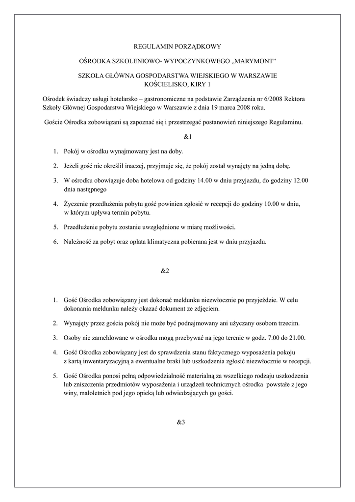 REGULAMIN PORZĄDKOWY OŚRODKA SZKOLENIOWO- WYPOCZYNKOWEGO „MARYMONT” SZKOŁA GŁÓWNA GOSPODARSTWA WIEJSKIEGO W WARSZAWIE KOŚCIELISKO, KIRY 1 Ośrodek świadczy usługi hotelarsko – gastronomiczne na podstawie Zarządzenia nr 6/2008 Rektora Szkoły Głównej Gospodarstwa Wiejskiego w Warszawie z dnia 19 marca 2008 roku. Goście Ośrodka zobowiązani są zapoznać się i przestrzegać postanowień niniejszego Regulaminu. &1 1. Pokój w ośrodku wynajmowany jest na doby. 2. JeŜeli gość nie określił inaczej, przyjmuje się, Ŝe pokój został wynajęty na jedną dobę. 3. W ośrodku obowiązuje doba hotelowa od godziny 14.00 w dniu przyjazdu, do godziny 12.00 dnia następnego 4. śyczenie przedłuŜenia pobytu gość powinien zgłosić w recepcji do godziny 10.00 w dniu, w którym upływa termin pobytu. 5. PrzedłuŜenie pobytu zostanie uwzględnione w miarę moŜliwości. 6. NaleŜność za pobyt oraz opłata klimatyczna pobierana jest w dniu przyjazdu. &2 1. Gość Ośrodka zobowiązany jest dokonać meldunku niezwłocznie po przyjeździe. W celu dokonania meldunku naleŜy okazać dokument ze zdjęciem. 2. Wynajęty przez gościa pokój nie moŜe być podnajmowany ani uŜyczany osobom trzecim. 3. Osoby nie zameldowane w ośrodku mogą przebywać na jego terenie w godz. 7.00 do 21.00. 4. Gość Ośrodka zobowiązany jest do sprawdzenia stanu faktycznego wyposaŜenia pokoju z kartą inwentaryzacyjną a ewentualne braki lub uszkodzenia zgłosić niezwłocznie w recepcji. 5. Gość Ośrodka ponosi pełną odpowiedzialność materialną za wszelkiego rodzaju uszkodzenia lub zniszczenia przedmiotów wyposaŜenia i urządzeń technicznych ośrodka powstałe z jego winy, małoletnich pod jego opieką lub odwiedzających go gości. &3 1. Wszelkie rzeczy wartościowe gość zobowiązany jest do przechowywania w sejfie ośrodka. Sejf znajduje się w recepcji. 2. Ośrodek nie ponosi odpowiedzialności za utratę lub uszkodzenie rzeczy wartościowych w przypadku nie zastosowania się do pkt.1 niniejszego paragrafu. &4 1. Cisza nocna obowiązuje od godziny 22.00 do godz. 7.00 dnia następnego. 2. Parkowanie pojazdów dozwolone jest wyłącznie na miejscach parkingowych. 3. Parking jest bezpłatny, monitorowany, niestrzeŜony. 4. Brama Ośrodka zamykana jest w godzinach ciszy nocnej. &5 1. W budynku obowiązuje całkowity zakaz palenia tytoniu i uŜywania ognia otwartego. Palenie tytoniu dozwolone jest na zewnątrz, wyłącznie w miejscach wyznaczonych. 2. Ze względu na przepisy przeciwpoŜarowe oraz mgłowy wysokociśnieniowy system tryskaczowy i hydrantowy zabezpieczający ośrodek a takŜe przepisy ogólnego bezpieczeństwa w pokojach zabronione jest uŜywanie grzałek, Ŝelazek i innych podobnych urządzeń elektrycznych nie stanowiących wyposaŜenia pokoju. 3. Na terenie Ośrodka zabrania się rozpalania ognisk, odpalania petard, rac itp. 4. W ośrodku ponadto zabronione jest: a) zakłócanie ciszy b) zachowanie powszechnie uznawane za nieprzyzwoite c) chodzenie w butach narciarskich i przechowywanie sprzętu narciarskiego w pokojach d) wieszanie na tryskaczach i ich przewodach rzeczy osobistych, sprzętu itp. oraz osłanianie i blokowanie ich główek. 5. Ośrodek nie przyjmuje zwierząt. &6 1. Opuszczając pokój gość zobowiązany jest kaŜdorazowo sprawdzić, czy zamknął drzwi. 2. Przedmioty osobiste pozostawione w pokoju przez wyjeŜdŜającego gościa będą wysłane na wskazany adres na jego koszt. W przypadku nie otrzymania takiej dyspozycji od gościa, ośrodek będzie przechowywał pozostawione przedmioty przez okres 3 miesięcy. &7 1. Standardowe sprzątanie pokojów odbywa się co trzy dni lub na Ŝyczenie gościa. 2. W przypadku zastrzeŜeń dotyczących jakości usług goście proszeni są o zgłaszanie ich w recepcji.