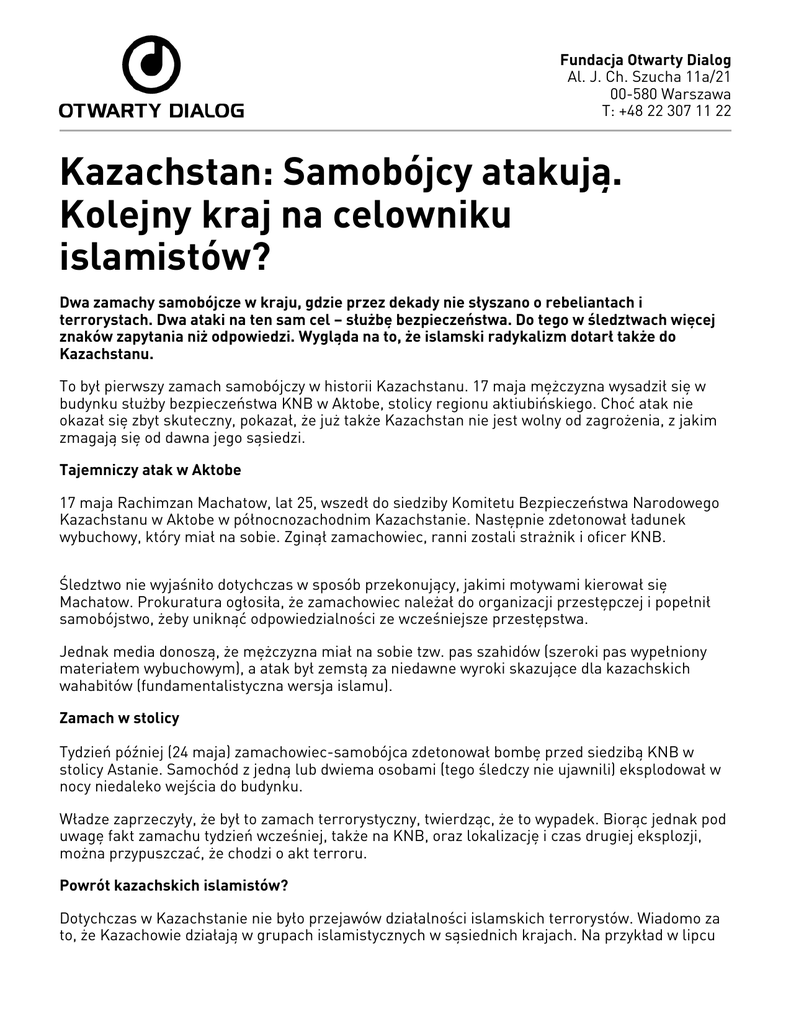Fundacja Otwarty Dialog Al. J. Ch. Szucha 11a/21 00-580 Warszawa T: +48 22 307 11 22 Kazachstan: Samobójcy atakują. Kolejny kraj na celowniku islamistów? Dwa zamachy samobójcze w kraju, gdzie przez dekady nie słyszano o rebeliantach i terrorystach. Dwa ataki na ten sam cel – służbę bezpieczeństwa. Do tego w śledztwach więcej znaków zapytania niż odpowiedzi. Wygląda na to, że islamski radykalizm dotarł także do Kazachstanu. To był pierwszy zamach samobójczy w historii Kazachstanu. 17 maja mężczyzna wysadził się w budynku służby bezpieczeństwa KNB w Aktobe, stolicy regionu aktiubińskiego. Choć atak nie okazał się zbyt skuteczny, pokazał, że już także Kazachstan nie jest wolny od zagrożenia, z jakim zmagają się od dawna jego sąsiedzi. Tajemniczy atak w Aktobe 17 maja Rachimzan Machatow, lat 25, wszedł do siedziby Komitetu Bezpieczeństwa Narodowego Kazachstanu w Aktobe w północnozachodnim Kazachstanie. Następnie zdetonował ładunek wybuchowy, który miał na sobie. Zginął zamachowiec, ranni zostali strażnik i oficer KNB. Śledztwo nie wyjaśniło dotychczas w sposób przekonujący, jakimi motywami kierował się Machatow. Prokuratura ogłosiła, że zamachowiec należał do organizacji przestępczej i popełnił samobójstwo, żeby uniknąć odpowiedzialności ze wcześniejsze przestępstwa. Jednak media donoszą, że mężczyzna miał na sobie tzw. pas szahidów (szeroki pas wypełniony materiałem wybuchowym), a atak był zemstą za niedawne wyroki skazujące dla kazachskich wahabitów (fundamentalistyczna wersja islamu). Zamach w stolicy Tydzień później (24 maja) zamachowiec-samobójca zdetonował bombę przed siedzibą KNB w stolicy Astanie. Samochód z jedną lub dwiema osobami (tego śledczy nie ujawnili) eksplodował w nocy niedaleko wejścia do budynku. Władze zaprzeczyły, że był to zamach terrorystyczny, twierdząc, że to wypadek. Biorąc jednak pod uwagę fakt zamachu tydzień wcześniej, także na KNB, oraz lokalizację i czas drugiej eksplozji, można przypuszczać, że chodzi o akt terroru. Powrót kazachskich islamistów? Dotychczas w Kazachstanie nie było przejawów działalności islamskich terrorystów. Wiadomo za to, że Kazachowie działają w grupach islamistycznych w sąsiednich krajach. Na przykład w lipcu 2010 Rosjanie zabili w Dagestanie 5 rebeliantów mających paszporty Kazachstanu. Na początku tego roku, również na Kaukazie Północnym, w ręce milicji oddało się 2 Kazachów islamistów. Teoretycznie więc, wracając do kraju, Kazachowie przywożą ze sobą umiejętność produkowania ładunków wybuchowych i są przeszkoleni w przeprowadzaniu zamachów bombowych. Koniec oazy spokoju Kazachstan do tej pory był uważany za najbezpieczniejszy kraj w byłym Związku Sowieckim (obok Białorusi, gdzie w końcu jednak też doszło do krwawego zamachu w metrze), mimo że wokół jest pełno ognisk zapalnych. Poczynając od niestabilnych i zanarchizowanych Kirgistanu i Tadżykistanu (gdzie na dodatek silne są wpływy islamistów), przez chińską prowincję Xinjiang zamieszkałą przez buntujących się muzułmańskich Ujgurów, po Afganistan. Wcześniej islamiści atakowali w sąsiednich Kirgistanie, Tadżykistanie i Uzbekistanie. Wydawało się, że w Kazachstanie nie ma podłoża społecznego dla ruchu islamistycznego. Zasoby ropy i gazu zapewniają wysokie dochody, mniejszości etniczne nie są prześladowane, a kazachscy muzułmanie są znani z umiarkowanych poglądów. Do tego władze w zarodku dusiły jakiekolwiek, nawet potencjalne źródła islamistycznego zagrożenia. Na przykład pod koniec kwietnia sąd skazał na więzienie grupę mężczyzn za to, że posiadali i oglądali wystąpienia audio i wideo islamistycznych liderów z Północnego Kaukazu. Cios w bezpiekę ostrzeżeniem dla Nazarbajewa? Teraz mamy jednak do czynienia ze spektakularnym atakiem na świecki rząd prezydenta Nursułtana Nazarbajewa poprzez uderzenie w główne narzędzie dyktatury – KNB, czyli republikańskiego spadkobiercę KGB. Czas przyniesie odpowiedź, czy w Kazachstanie działa większa siatka terrorystyczna. Czy zamachy to atak na świecki charakter państwa, czy może zemsta za wysłanie żołnierzy do Afganistanu? Grzegorz Kuczyński http://www.tvn24.pl/ facebook.com/OpenDialogFoundation | [email protected] | www.odfoundation.eu