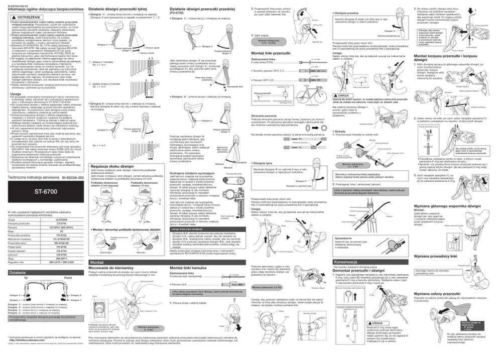 SI-6SC0A-002-03 Informacje ogólne dotyczące bezpieczeństwa Działanie dźwigni przerzutki tylnej Działanie dźwigni przerzutki przedniej • Dźwignia A : zmiana tylnej koronki z mniejszej na większą. Dźwignia A jest wyposażona w zapadki w położeniach 1 i 2. OSTRZEŻENIE • Przed zamontowaniem części należy uważnie przeczytać niniejszą instrukcję. Poluzowane, zużyte lub uszkodzone części mogą doprowadzić do wywrócenia roweru, co może spowodować poważne obrażenia. Zalecamy stosowanie jedynie oryginalnych części zamiennych Shimano. • Przed zamontowaniem części należy uważnie przeczytać niniejszą instrukcję. Jeżeli komponenty nie zostaną prawidłowo wyregulowane, łańcuch może spadać, co prowadzi do upadku z roweru i poważnych obrażeń. • Elementy ST-6700/6703, BL-TT79 należy stosować z hamulcem BR-6700. Nie należy używać hamulca BR-6700 w połączeniu z poprzednimi dźwigniami STI do jazdy szosowej ani dźwigniami hamulca BL-R770/BL-R550 do płaskiej kierownicy, gdyż siła hamowania będzie zbyt duża. • Ze względu na właściwości włókna węglowego nie wolno modyfikować dźwigni, gdyż może to spowodować jej pęknięcie, a w rezultacie brak możliwości korzystania z hamulców. • Przed rozpoczęciem jazdy na rowerze sprawdź, czy nie występują uszkodzenia, takie jak pęknięcia czy łuszczenie włókna węglowego. Jeżeli występują uszkodzenia, należy natychmiast wymienić uszkodzony element na nowy, nie podejmując prób naprawy. W przeciwnym razie może nastąpić pęknięcie dźwigni, a w rezultacie brak możliwości korzystania z hamulców. • Należy dokładnie przeczytać niniejszą techniczną instrukcję serwisową i zachować ją na przyszłość. 2. Przeprowadź linkę przez uchwyt 2. Do otworu sztyftu dźwigni włóż klucz w sposób pokazany na rysunku, po czym załóż bębenek linki. (FD-6700) imbusowy lub podobne narzędzie i delikatnie uderz młotkiem plastikowym, aby wypchnąć sztyft. Po wyjęciu sztyftu dźwigni można rozmontować korpus przerzutki i dźwigni. • Dźwignia przednia • Dźwignia a : zmiana tarczy z mniejszej na większą. Naciśnij dźwignię b jeden lub kilka razy w celu ustawienia dźwigni w niskim położeniu. Pancerz Uchwyt linki Korpus przerzutki Dźwignia b 3. Załóż kołpak. Naciśnij przynajmniej raz Moment dokręcania: 0,15 - 0,2 Nm Dźwignia A Pozycja wyjściowa dźwigni A Pozycja wyjściowa dźwigni a 1 Kliknięcie zapadki 4 3 1 : zmiana o 1 koronkę Np. z 3. na 4. 5 Bębenek linki Dźwignia a 2 Kliknięcie zapadki Montaż linki przerzutki Należy włożyć linkę tak, aby jej bębenek wsunął się maksymalnie daleko w zwijarkę. 1,2 mm • Linka (linka PTFE) ................................... czym zmontuj korpus przerzutki i korpus dźwigni. Następnie włóż koniec sprężyny odwrotnej do wycięcia. (1) 4 mm • Pancerz SP41 (2) ................................... 2 : szybka zmiana o 2 koronki Np. z 3. na 5. Rzeczywisty skok Montaż korpusu przerzutki i korpusu dźwigni 1. Włóż dźwignię łączącą do głównego wspornika dźwigni, po 4 mm • Szczelny pancerz SP41 (1) ................... Pełny skok zmiany przełożenia 3 Sztyft dźwigni Korpus dźwigni Uwaga: Zastosowana linka Jeśli naciśnięcie dźwigni a nie powoduje pełnego skoku zmiany przełożenia tarczy, należy ponownie użyć dźwigni a i przesunąć ją (odległość X'), aby wykonać pełny skok zmiany przełożenia (X). Przeprowadź linkę przez otwór linki. Pancerz może być poprowadzony na dwa sposoby: przez prowadnicę linki (1) (wewnętrzną) lub przez prowadnicę linki 2 (zewnętrzną). Pamiętaj, aby zawsze wyjmować sztyft dźwigni w tym kierunku. Jeżeli zostanie on usunięty w przeciwnym kierunku, może uszkodzić korpus przerzutki. SP41 (2) końcówka 4 mm Dźwignia łącząca Osłona linki przerzutki Główny wspornik dźwigni Strona przerzutki Uwaga • W przypadku stosowania trzyrzędowych tarczy mechanizmu korbowego należy zapoznać się z instrukcjami serwisowymi wraz z instrukcjami serwisowymi ST-6703 i FD-6703. • Do czyszczenia dźwigni z włókna węglowego należy stosować miękką tkaninę, nasączając ją przed użyciem neutralnym detergentem. W przeciwnym razie dźwignia może zostać uszkodzona i osłabiona zostanie jej wytrzymałość. • Unikaj pozostawiania dźwigni z włókna węglowego w miejscach, w których mogą być narażone na działanie wysokich temperatur. Trzymaj je również z dala od ognia. • Obsługa dźwigni związana ze zmianą biegów powinna być wykonywana jedynie, kiedy obraca się mechanizm korbowy. • W celu zapewnienia płynnej pracy stosować odpowiedni pancerz i ślizgi. • Przed użyciem nasmarować linkę oraz wnętrze pancerza, aby zapewnić swobodne ślizganie się linki. • Z uwagi na to, że duży opór linki w ramie z wewnętrznym prowadzeniem linki wpłynie na funkcje SIS, ten typ ramy nie powinien być używany. • Do smarowania linki przerzutki stosowany jest smar specjalny (SIS-SP41). Nie należy stosować smaru DURA-ACE ani innych środków smarnych. W przeciwnym razie może dojść do pogorszenia sprawności roboczej przerzutki. • Gwarancja nie obejmuje normalnego zużycia ani pogorszenia działania wynikających z normalnego użytkowania. • Wszelkie pytania dotyczące sposobu montażu, regulacji, konserwacji lub obsługi prosimy kierować do profesjonalnego sprzedawcy rowerów. Techniczna instrukcja serwisowa SI-6SC0A-002 • Dźwignia b : zmienia tarczę z większej na mniejszą. Końcówka aluminiowa • Dźwignia B: zmiana tylnej koronki z większej na mniejszą. Naciśnij dźwignię B jeden raz, aby zmienić koronkę z większej na mniejszą. Pozycja wyjściowa dźwigni B Dźwignia B 4 3 Np. z 4. na 3. Regulacja skoku dźwigni Podkładka dystansowa okładzin 10 mm 20 FD-6700 FC-6700/6750 Przerzutka tylna Piasta tylna • Montaż i demontaż podkładki dystansowej okładzin Podkładka dystansowa okładzin RD