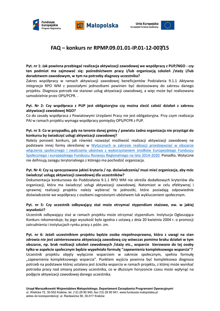 FAQ – konkurs nr RPMP.09.01.01-IP.01-12-007/15 Pyt. nr 1: Jak powinna przebiegać realizacja aktywizacji zawodowej we współpracy z PUP/NGO - czy ten podmiot ma zajmować się: pośrednictwem pracy i/lub organizacją szkoleń /staży i/lub doradztwem zawodowym, w tym na potrzeby diagnozy uczestnika? Zakres współpracy w ramach aktywizacji zawodowej beneficjentów Podziałania 9.1.1 Aktywna integracja RPO WM z pozostałymi jednostkami powinien być dostosowany do zakresu danego projektu. Diagnoza potrzeb nie stanowi usług aktywizacji zawodowej, a więc może być realizowana samodzielnie przez OPS/PCPR. . Pyt. Nr 2: Czy współpraca z PUP jest obligatoryjna czy można zlecić całość działań z zakresu aktywizacji zawodowej NGO? Co do zasady współpraca z Powiatowymi Urzędami Pracy nie jest obligatoryjna. Przy czym realizacja PAI w ramach projektu wymaga współpracy pomiędzy OPS/PCPR z PUP. Pyt. nr 3: Co w przypadku, gdy na terenie danej gminy / powiatu żadna organizacja nie przystąpi do konkursu by świadczyć usługi aktywizacji zawodowej? Należy ponowić konkurs, jak również rozważyć możliwość realizacji aktywizacji zawodowej na podstawie innej formy określonej w Wytycznych w zakresie realizacji przedsięwzięć w obszarze włączenia społecznego i zwalczania ubóstwa z wykorzystaniem środków Europejskiego Funduszu Społecznego i europejskiego Funduszu Rozwoju Regionalnego na lata 2014-2020. Ponadto, Wytyczne nie definiują zasięgu terytorialnego z którego ma pochodzić organizacja. Pyt. Nr 4: Czy są sprecyzowane jakieś kryteria / np. doświadczenia/ musi mieć organizacja, aby móc świadczyć usługę aktywizacji zawodowej dla uczestników? Dokumentacja konkursowa do Poddziałania 9.1.1 RPO WM nie określa dodatkowych kryteriów dla organizacji, która ma świadczyć usługi aktywizacji zawodowej. Natomiast w celu efektywnej i sprawnej realizacji projektu należy wybierać te jednostki, które posiadają odpowiednie doświadczenie we współpracy z osobami zagrożonymi ubóstwem lub wykluczeniem społecznym. Pyt. nr 5: Czy uczestnik odbywający staż może otrzymać stypendium stażowe, ew. w jakiej wysokości? Uczestnik odbywający staż w ramach projektu może otrzymać stypendium. Instytucja Ogłaszająca Konkurs rekomenduje, by jego wysokość była zgodna z ustawą z dnia 20 kwietnia 2004 r. o promocji zatrudnienia i instytucjach rynku pracy z późn. zm. Pyt. nr 6: Jeżeli uczestnikiem projektu będzie osoba niepełnosprawna, która z uwagi na stan zdrowia nie jest zainteresowana aktywizacją zawodową czy wówczas pomimo braku działań w tym obszarze, np. brak realizacji szkoleń zawodowych /staży etc., wsparcie kierowane do tej osoby tylko w aspekcie społecznym będzie wypełniało formułę "zapewnienia kompleksowego wsparcia"? Uczestnik projektu objęty wyłącznie wsparciem w zakresie społecznym, spełnia formułę „zapewnienia kompleksowego wsparcia”. Punktem wyjścia powinna być kompleksowa diagnoza potrzeb na podstawie której ustalana jest ścieżka wsparcia w ramach projektu, z której może wynikać potrzeba pracy nad zmianą postawy uczestnika, co w dłuższym horyzoncie czasu może wpłynąć na podjęcie aktywizacji zawodowej danego uczestnika. Urząd Marszałkowski Województwa Małopolskiego, Departament Zarządzania Programami Operacyjnymi ul. Wielicka 72, 30-552 Kraków, tel. (12) 29 90 940, fax (12) 29 90 941, www.fundusze.malopolska.pl adres do korespondencji: ul. Racławicka 56, 30-017 Kraków Pyt. nr 7: W regulaminie jest zapis, że projekty nie mogą trwać dłużej niż 36 miesięcy, czy zatem beneficjent który przygotuje projekt np. 2-letni będzie się mógł starać o kolejne środki po zakończeniu swojego projektu w taki sposób aby zapewnić ciągłość zatrudnienia pracowników?(innymi słowy: czy nabory będą ogłaszane corocznie?) Beneficjenci ubiegający się o środki w obecnym konkursie w ramach Poddziałania 9.1.1 RPO WM mogą ubiegać się o wsparcie również w kolejnych konkursach. Harmonogram naboru wniosków o dofinansowanie konkursów jest dostępny na stronie rpo.malopolska.pl. Wstępnie kolejny nabór dla 9.1.1 jest planowany na rok 2017. Pyt. nr 8: Czy zasiłek wypłacany opiekunowi prawnemu na rzecz dziecka, które jest uczestnikiem projektu jest kwalifikowany jako wkład własny? Zasiłek wypłacany opiekunowi prawnemu na rzecz uczestnika projektu może stanowić wkład własny w projekcie. Pyt. nr 9: W ramach wskaźnika efektywność społeczno-zatrudnieniowa należy wykazywać: „osoby lub środowiska zagrożone ubóstwem lub wykluczeniem społecznym” oraz osobno „osoby o znacznym stopniu niepełnosprawności, osoby z niepełnosprawnością intelektualną oraz osoby z niepełnosprawnościami sprzężonymi”. Czy osoby niepełnosprawne należy wykazać dodatkowo jako osoby wykluczone? Efektywność zatrudnieniowa jest mierzona rozłącznie w odniesieniu do osób zagrożonych ubóstwem lub wykluczeniem społecznym oraz w odniesieniu do osób o znacznym stopniu niepełnosprawności, osób z niepełnosprawnością intelektualną oraz osób z niepełnosprawnościami sprzężonym, które zakończyły udział w projekcie. Przykład 1: Na etapie wniosku o dofinansowanie Wnioskodawca informuje, że udział w projekcie zgodnie ze ścieżką zakończy 100 osób z czego: 60 osób zagrożonych ubóstwem lub wykluczeniem społecznym oraz 40 osób o znacznym stopniu niepełnosprawności, osób z niepełnosprawnością intelektualną oraz osób z niepełnosprawnościami sprzężonym. W takim przypadku wskaźnik efektywności zatrudnieniowej dla 60 osób zagrożonych ubóstwem lub wykluczeniem społecznym musi zostać osiągnięty na poziomie 22%, natomiast dla 40 osób o znacznym stopniu niepełnosprawności, osób z niepełnosprawnością intelektualną oraz osób z niepełnosprawnościami sprzężonym na poziomie 12%. Pyt. nr 10: Grupą docelowa w projektach maja być m.in. osoby doświadczając