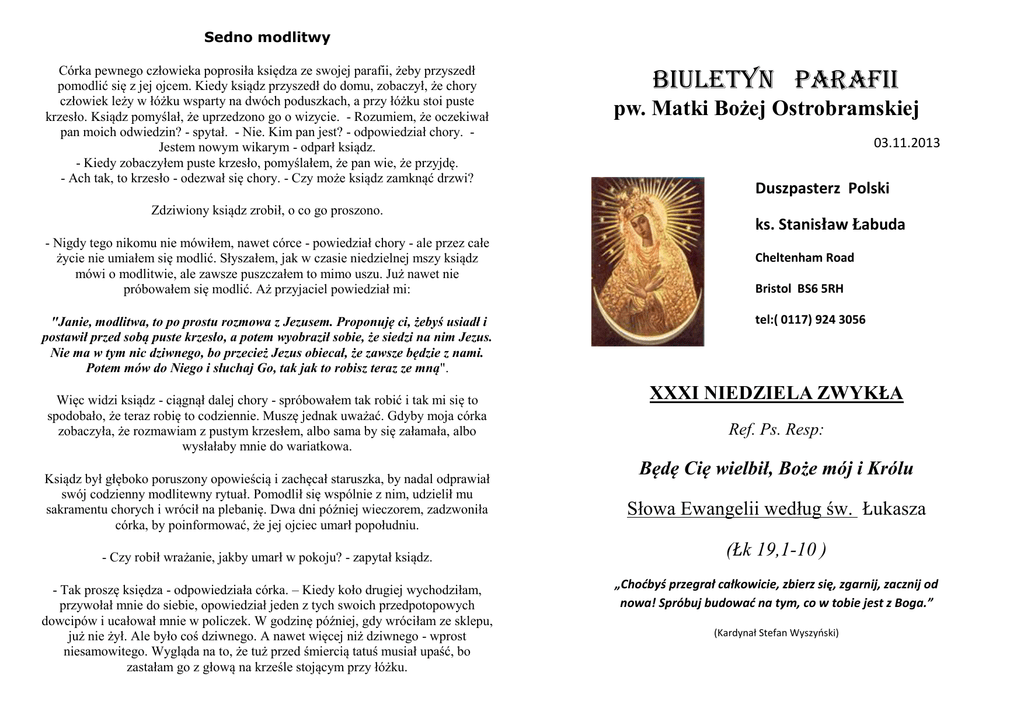 Sedno modlitwy Córka pewnego człowieka poprosiła księdza ze swojej parafii, żeby przyszedł pomodlić się z jej ojcem. Kiedy ksiądz przyszedł do domu, zobaczył, że chory człowiek leży w łóżku wsparty na dwóch poduszkach, a przy łóżku stoi puste krzesło. Ksiądz pomyślał, że uprzedzono go o wizycie. - Rozumiem, że oczekiwał pan moich odwiedzin? - spytał. - Nie. Kim pan jest? - odpowiedział chory. Jestem nowym wikarym - odparł ksiądz. - Kiedy zobaczyłem puste krzesło, pomyślałem, że pan wie, że przyjdę. - Ach tak, to krzesło - odezwał się chory. - Czy może ksiądz zamknąć drzwi? Zdziwiony ksiądz zrobił, o co go proszono. - Nigdy tego nikomu nie mówiłem, nawet córce - powiedział chory - ale przez całe życie nie umiałem się modlić. Słyszałem, jak w czasie niedzielnej mszy ksiądz mówi o modlitwie, ale zawsze puszczałem to mimo uszu. Już nawet nie próbowałem się modlić. Aż przyjaciel powiedział mi: "Janie, modlitwa, to po prostu rozmowa z Jezusem. Proponuję ci, żebyś usiadł i postawił przed sobą puste krzesło, a potem wyobraził sobie, że siedzi na nim Jezus. Nie ma w tym nic dziwnego, bo przecież Jezus obiecał, że zawsze będzie z nami. Potem mów do Niego i słuchaj Go, tak jak to robisz teraz ze mną". Więc widzi ksiądz - ciągnął dalej chory - spróbowałem tak robić i tak mi się to spodobało, że teraz robię to codziennie. Muszę jednak uważać. Gdyby moja córka zobaczyła, że rozmawiam z pustym krzesłem, albo sama by się załamała, albo wysłałaby mnie do wariatkowa. BIULETYN PARAFII pw. Matki Bożej Ostrobramskiej 03.11.2013 Duszpasterz Polski ks. Stanisław Łabuda Cheltenham Road Bristol BS6 5RH tel:( 0117) 924 3056 XXXI NIEDZIELA ZWYKŁA Ref. Ps. Resp: Będę Cię wielbił, Boże mój i Królu Ksiądz był głęboko poruszony opowieścią i zachęcał staruszka, by nadal odprawiał swój codzienny modlitewny rytuał. Pomodlił się wspólnie z nim, udzielił mu sakramentu chorych i wrócił na plebanię. Dwa dni później wieczorem, zadzwoniła córka, by poinformować, że jej ojciec umarł popołudniu. Słowa Ewangelii według św. Łukasza - Czy robił wrażanie, jakby umarł w pokoju? - zapytał ksiądz. (Łk 19,1-10 ) - Tak proszę księdza - odpowiedziała córka. – Kiedy koło drugiej wychodziłam, przywołał mnie do siebie, opowiedział jeden z tych swoich przedpotopowych dowcipów i ucałował mnie w policzek. W godzinę później, gdy wróciłam ze sklepu, już nie żył. Ale było coś dziwnego. A nawet więcej niż dziwnego - wprost niesamowitego. Wygląda na to, że tuż przed śmiercią tatuś musiał upaść, bo zastałam go z głową na krześle stojącym przy łóżku. „Choćbyś przegrał całkowicie, zbierz się, zgarnij, zacznij od nowa! Spróbuj budować na tym, co w tobie jest z Boga.” (Kardynał Stefan Wyszyński) Porządek Mszy św. W liturgii tego tygodnia będziemy wspominać: Poniedziałek Wspomnienie św. Karola Boromeusza, biskupa. Sobota Święto rocznicy poświęcenia Bazyliki Laterańskiej. Jak co roku będzie dzisiaj procesja i modlitwa na cmentarzach o godz. 14.00 i godz. 15.15. W takim porządku jak w poprzednich latach ************************************************* W naszym Kościele przez cały miesiąc listopad będzie odmawiany Różaniec za zmarłych polecanych w wypominkach. Codziennie o godz. 18.30 Serdecznie zapraszamy. Niedziela 03. 11. 2013. Od dzisiejszej niedzieli 3 Listopada 2013, Msze św. dla dzieci o godzinie 12.00 będą odprawiane w naszym kościele w każdą niedzielę. Natomiast Msza się w Dursley, zostałą przesunięta na godz. 15.00 17 listopada 2013 roku o godz. 1300 odbędzie się kolejne spotkanie Oazy Rodzin, znanej również pod nazwą Oaza Domowego Kościoła. Gość Niedzielny: Ich dzieci żyją w niebie. Jak uporać się z bólem po stracie dziecka. Jak pomóc osieroconym rodzicom. Po Mszy św. o godz. 10.00 zapraszamy do salki obok kościoła na kawę, herbatkę i ciasto. 12.00 19.00 Poniedziałek Wtorek Środa Czwartek Ofiary, złożone w ostatnią niedzielę wyniosły– £ 567, 43 Piątek Na Papieskie dzieła Misyjne - £ 119. 33 Sobota W naszym nowo wyremontowanym Domu Parafialnym im. Jana Pawła II, są do wynajęcia pokoje. Wszystkich zainteresowanych prosimy o kontakt z p. Krzysztofem Lus - 07918161681 10.00 Niedziela 10. 11. 2013. 19.00 19.00 19.00 19.00 19.00 19.00 10.00 Wypominki za zmarłych - z tyłu kościoła można zabrać karteczki na wypominki listopadowe. Po wypisaniu swoich zmarłych, proszę składać je w kancelarii parafialnej. Przez cały listopad będzie odmawiany różaniec w intencji zmarłych polecanych w wypominkach, czytane będą również nazwiska tych zmarłych, którzy zostaną wypisani. Bóg zapłać za wszelkie ofiary składane przy tej okazji.. 12.00 19.00 Jako uwielbienie Ducha św. 1) Jan Dymiańczuk (z int. żony Władysławy) 2) O szczęśliwą operację dla Henryka (z int. chrześnicy) 3) + Roman Bojski (z int. żony Zofii i synów) 4) + Aleksandry i Eugeniusza Pietraszewskich Za zmarłych polecanych w wypominkach + Antoniego Łabuda + Zofię Harnik Za zmarłych polecanych w wypominkach + Jan Bąk w rocz. śm. Za zmarłych polecanych w wypominkach + Mariana (w rocz. urodz.) i Heleny Markowskich (z int. córki) Za zmarłych polecanych w wypominkach Za zmarłych polecanych w wypominkach + Marian Gronowicz w 2 rocz. śm (z int. żony i córki z rodz.) Za zmarłych polecanych w wypominkach O bł. Boże i zdrowie dla Małgorzaty i Grzegorza Dombek w 18 rocz. ślubu. oraz o Bożą opiekę dla ich dzieci. 1) Za Ojczyznę z int. SPK 2) Józefy Dubiel w 7 rocz. śm. (z int. syna Tomasza z żoną Eweliną) 2)+ Henryk Janiak (z int. żony i rodziny) O powrót do pełni zdrowia dla Agnieszki i Roberta Dyba oraz Aliny Domagała + Leonard Glimasiński, + Barbary i Henryka Gozdyra (z int. rodziny)