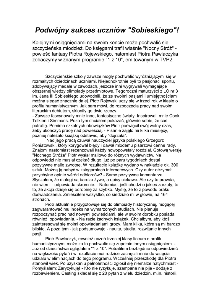 Podwójny sukces uczniów "Sobieskiego"! Kolejnymi osiągnięciami na swoim koncie może pochwalić się szczycieńska młodzież. Do księgarni trafił właśnie "Nocny Stróż" powieść fantasy Piotra Rojewskiego, natomiast Piotra Pawlaczyka zobaczymy w znanym programie "1 z 10", emitowanym w TVP2. Szczycieńskie szkoły zawsze mogły pochwalić wyróżniającymi się w rozmaitych dziedzinach uczniami. Niejednokrotnie byli to pasjonaci sportu, zdobywający medale w zawodach, jeszcze inni wygrywali wymagające obszernej wiedzy olimpiady przedmiotowe. Tegoroczni maturzyści z LO nr 3 im. Jana III Sobieskiego udowodnili, że ze swoimi pasjami i umiejętnościami można sięgać znacznie dalej. Piotr Rojewski uczy się w trzeci rok w klasie o profilu humanistycznym. Jak sam mówi, do rozpoczęcia pracy nad swoim literackim debiutem, skłoniły go dwie rzeczy. - Zawsze fascynowały mnie inne, fantastyczne światy. Inspirowali mnie Cook, Tolkien i Simmons. Poza tym chciałem pokazać, głównie sobie, że coś potrafię. Pomimo szkolnych obowiązków Piotr poświęcił swój wolny czas, żeby ukończyć pracę nad powieścią. - Pisanie zajęło mi kilka miesięcy, później należało książkę odstawić, aby "dojrzała". Nad jego pracą czuwał nauczyciel języka polskiego Grzegorz Poniatowski, który korygował błędy i dawał młodemu pisarzowi cenne rady. Znajomi nastomiast recenzowali każdy nowopowstały rozdział. Gotową wersję "Nocnego Stróża" Piotr wysłał mailowo do różnych wydawnictw. Na odpowiedzi nie musiał czekać długo, już po paru tygodniach dostał pozytywne maile zwrotne. W rezultacie książkę wydano w nakładzie ok. 300 sztuk. Możną ją nabyć w księgarniach internetowych. Czy autor otrzymał przychylne opinie wśród odbiorców? - Same pozytywne komentarze. Słyszałem, że dialogi są bardzo żywe, a opisy ciekawe. Ale czy to prawda, nie wiem. - odpowiada skromnie. - Natomiast jeśli chodzi o jakieś zarzuty, to to, że akcja dzieje się odrobinę za szybko. Myślę, że to z powodu braku doświadczenia. Zmieściłem wszystko, co siedziało mi w głowie, na 164 stronach. Piotr aktualnie przygotowuje się do olimpiady historycznej, mogącej zagwarantować mu indeks na wymarzonych studiach. Nie planuje rozpoczynać prac nad nowymi powieściami, ale w swoim dorobku posiada również opowiadania. - Na razie żadnych książek. Chciałbym, aby ktoś zainteresował się moimi opowiadaniami grozy. Mam kilka, które są mi bardzo bliskie. A poza tym - jak podsumowuje - nauka, studia, rozwijanie innych pasji. Piotr Pawlaczyk, również uczeń trzeciej klasy liceum o profilu humanistycznym, może za to pochwalić się zupełnie innym osiągnięciem. Już od dzieciństwa oglądałem "1 z 10". Potrafiłem bezbłędnie odpowiedzieć na większość pytań i w rezultacie moi rodzice zachęcili mnie do wzięcia udziału w eliminacjach do tego programu. Wcześniej przeszkodę dla Piotra stanowił wiek. Po uzyskaniu pełnoletności zgłosił się niemalże natychmiast Pomyślałem: Zaryzykuję! - Kto nie ryzykuje, szampana nie pije - dodaje z rozbawieniem. Casting składał się z 20 pytań z wielu dziedzin, m.in. historii, geografii i sportu. Żeby przejść dalej trzeba było odpowiedzieć prawidłowo na 15 z nich. Piotr pokazał, że posiada naprawdę wszechstronną wiedzę, ponieważ popełnił tylko 3 błędy. - Byłem bardzo podekscytowany i jednocześnie zastanawiałem się, jak to się potoczy dalej. - Oczekując na rozpoczęcie nagrania byłem zestresowany, lecz wchodząc do studia stres odszedł. Działo się to głównie za sprawą bardzo miłych uczestników, prowadzącego i wsparciu mojego brata, który był tam razem ze mną. Sukces Piotra odbił się pozytywnym echem wśród społeczności szkolnej. Gratulowali mu nie tylko znajomi, ale także dyrekcja i nauczyciele. Potyczki Piotra Pawlaczyka w programie "1 z 10" będzie można obejrzeć już w marcu w telewizyjnej dwójce. Tymczasem on sam na razie skupia się na jak najlepszym przygotowaniu do egzaminu dojrzałości. Jego celem jest dostanie się na studia prawnicze na Uniwersytecie Warszawskiem. Maria Kaliszewska