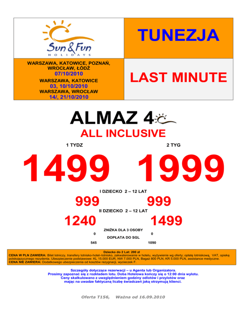 TUNEZJA WARSZAWA, KATOWICE, POZNAŃ, WROCŁAW, ŁÓDŹ 07/10/2010 WARSZAWA, KATOWICE 03, 10/10/2010 LAST MINUTE WARSZAWA, WROCŁAW 14/, 21/10/2010 ALMAZ 4 ALL INCLUSIVE 1 TYDZ 2 TYG 1499 1999 999 1240 I DZIECKO 2 – 12 LAT 999 1499 II DZIECKO 2 – 12 LAT 0 ZNIŻKA DLA 3 OSOBY 0 DOPŁATA DO SGL 545 1090 Dziecko do 2 Lat: 200 zł CENA W PLN ZAWIERA: Bilet lotniczy, transfery lotnisko-hotel–lotnisko, zakwaterowanie w hotelu, wyżywienie wg oferty; opłatę lotniskową, VAT, opiekę polskojęzycznego rezydenta. Ubezpieczenie podstawowe: KL 15.000 EUR, NW 7.000 PLN, Bagaż 800 PLN, KR 5.000 PLN, assistance medyczne. CENA NIE ZAWIERA: Dodatkowego ubezpieczenia od kosztów rezygnacji, wycieczek F. Szczegóły dotyczące rezerwacji – u Agenta lub Organizatora. Prosimy zapoznać się z rozkładem lotu. Doba Hotelowa kończy się o 12:00 dnia wylotu. Ceny skalkulowano z uwzględnieniem godziny odlotów i przylotów oraz mając na uwadze faktyczną liczbę świadczeń jaką otrzymują klienci. Oferta T156, Ważna od 16.09.2010