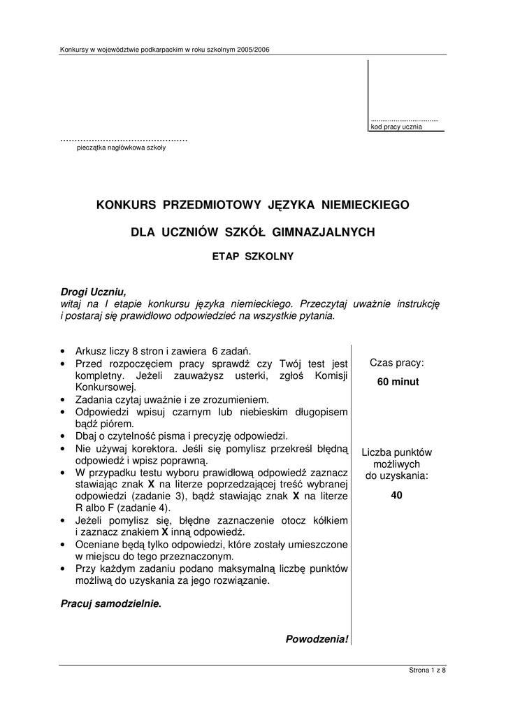 Konkursy w województwie podkarpackim w roku szkolnym 2005/2006 .................................... kod pracy ucznia ............................................. pieczątka nagłówkowa szkoły KONKURS PRZEDMIOTOWY JĘZYKA NIEMIECKIEGO DLA UCZNIÓW SZKÓŁ GIMNAZJALNYCH ETAP SZKOLNY Drogi Uczniu, witaj na I etapie konkursu języka niemieckiego. Przeczytaj uważnie instrukcję i postaraj się prawidłowo odpowiedzieć na wszystkie pytania. • • • • • • • • • • Arkusz liczy 8 stron i zawiera 6 zadań. Przed rozpoczęciem pracy sprawdź czy Twój test jest kompletny. Jeżeli zauważysz usterki, zgłoś Komisji Konkursowej. Zadania czytaj uważnie i ze zrozumieniem. Odpowiedzi wpisuj czarnym lub niebieskim długopisem bądź piórem. Dbaj o czytelność pisma i precyzję odpowiedzi. Nie używaj korektora. Jeśli się pomylisz przekreśl błędną odpowiedź i wpisz poprawną. W przypadku testu wyboru prawidłową odpowiedź zaznacz stawiając znak X na literze poprzedzającej treść wybranej odpowiedzi (zadanie 3), bądź stawiając znak X na literze R albo F (zadanie 4). Jeżeli pomylisz się, błędne zaznaczenie otocz kółkiem i zaznacz znakiem X inną odpowiedź. Oceniane będą tylko odpowiedzi, które zostały umieszczone w miejscu do tego przeznaczonym. Przy każdym zadaniu podano maksymalną liczbę punktów możliwą do uzyskania za jego rozwiązanie. Czas pracy: 60 minut Liczba punktów możliwych do uzyskania: 40 Pracuj samodzielnie. Powodzenia! Strona 1 z 8 Konkursy w województwie podkarpackim w roku szkolnym 2005/2006 Zadanie 1. (0-8 pkt.) Przeczytaj uważnie tekst. Pod nim podane są ponumerowane czynności. Tak jak w przykładzie (0) utwórz dla podanych osób tryb rozkazujący i wpisz go w wykropkowane miejsca. Die Bachs haben Familie Fuchs zu einer Grillparty eingeladen. Darum hat jetzt Frau Bach viel zu tun. Sie braucht Hilfe von der ganzen Familie. Sie sagt zu Michael, ihrem Mann: „Fahr in die Stadt (0) und ............................................................................................ ......................................! (1). Hier, auf der Liste steht alles, was ich brauche. Und ...................................... das Fleisch nicht! “ (2) Dann sagt sie zu Katrin, ihrer Tochter:„ ...................... mir bitte ............................ ! (3) „Jochen,..................................................................................................................!“ (4) und ...........................................................! (5) Nach einer Stunde kommt Herr Bach zurück. Seine Frau hat wieder eine Bitte an ihn: „...................................................................................!“ (6) Dann hört sie lautes Schreien, die Kinder streiten sich. Sie ruft: „Kinder, ............................................! (7) Und plötzlich klingelt es. Frau Bach geht an die Tür und macht sie auf. Da steht schon Familie Fuchs. Sie begrüßt sie und sagt: „Ich freue mich, dass ich Sie sehe. ......................................... bitte ......................!“ (8) 0 – in die Stadt fahren 1 – im Supermarkt Lebensmittel und Getränke einkaufen 2 – vergessen 3 – beim Backen helfen 4 – den Grill aus dem Keller herausholen 5 – ihn saubermachen 6 – den Müll wegbringen 7 – ruhig sein 8 – hereinkommen Strona 2 z 8 Konkursy w województwie podkarpackim w roku szkolnym 2005/2006 Zadanie 2. (0-7 pkt.) Do podkreślonych części zdań ułóż odpowiednie pytanie i wpisz w wykropkowane miejsca. 1. Das Auto meines Vaters steht vor der Garage. ........................................................................................................... 2. Seine Freunde sind gestern mit dem Auto nach Kraków gefahren. ........................................................................................................... 3. Dreimal in der Woche gehe ich zum Fußballtraining. ............................................................................................................ 4. Das Geschäft ist nur bis 16 Uhr geöffnet. ............................................................................................................ 5. Das neue Album von Nena gefällt ihren Fans gut. ........................................................................................................... 6. Die blaue Bluse kostet nur 25 Euro. ............................................................................................................ 7. Das ist eine schöne Geschichte. ............................................................................................................ Strona 3 z 8 Konkursy w województwie podkarpackim w roku szkolnym 2005/2006 Zadanie 3. (0-7 pkt.) Przeczytaj list Martina, który opisuje swój kraj. Tekst zawiera luki, które należy uzupełnić wybierając prawdziwą informację (z podanych poniżej tego listu). Zaznacz ją stawiając znak X, na literze A, B, albo C. Wien, den 15.10.2005 Liebe Anna, danke für deinen netten Brief. Jetzt weiß ich etwas mehr über dich und deine Heimat – Polen. Du hast mich nach meinem Land gefragt, ich bin also jetzt dran. Republik Österreich liegt ................................... (1) Europas und hat über ................................ (2) Millionen Einwohner. Fast 99 % der Menschen sprechen hier Deutsch. Das Land ist vor allem durch die Alpen bekannt. Der höchste Berg heißt ........................................ (3). Der berühmteste und der längste Fluss ist ............................................ (4). Sicher weißt du, dass die Hauptstadt Osterreichs ........................................ (5) ist. Aber es gibt auch noch viele andere schöne Städte wie z. B. die Mozartstadt ........................................ (6) oder Innsbruck - die Stadt der olympischen Winterspiele. Was noch? Unsere Hymne beginnt mit den Worten „Land der Berge, Land am Strome, Land der Äcker, Land der Dome,..“, dazu hat man die sc