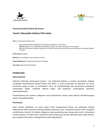 Scenariusz lekcji historii dla liceum Temat: Niezwykłe kobiety XVII wieku Cele: po zakończeniu lekcji uczeń: − − − zna przykłady kobiet wybijających się ponad przeciętność w XVII wieku, potrafi wyjaśnić, wraz z podaniem przykładów, pojęcia roli społecznej kobiet i emancypacji, wie, jaki był wzorzec zachowań kobiecych w kulturze sarmackiej, jakie były pierwsze przejawy emancypacji kobiet w Polsce. Forma pracy: grupowa Metody: burza mózgów, praca z tekstem, drama Środki dydaktyczne: materiały pomocnicze z tekstami Czas zajęć: jedna jednostka lekcyjna Przebieg zajęć: Wprowadzenie Zebranie informacji dotyczących pozycji i roli społecznej kobiety w czasach sarmackich, podanie przykładów (wymienienie znanych kobiet XVII wieku, w czym przejawiała się typowość ich życia). Zwrócenie uwagi na fakt, że zachowania różne od standardowego były pierwszymi przejawami emancypacji kobiet. Ustalenie definicji pojęć: rola społeczna, emancypacja, feminizm, równouprawnienie. Przedstawienie celu zadania: odegranie sceny (pantomima, drama, żywe obrazy) charakteryzującej postać niezwykłej kobiety. Rozwinięcie Klasa zostaje podzielona na cztery grupy, które przygotowują dramę. Na podstawie krótkiej biograficznej notki uczniowie stawiają hipotezy dotyczące cech i zachowań postaci, które następnie przedstawią w dramie. Po każdym odegraniu sceny pozostałe grupy notują, jakie cechy i zachowania zostały ukazane. Po zakończeniu wszystkich dram każda grupa dostaje pełniejszy opis swojej postaci, aby uzupełnić informacje z faktograficznej notki biograficznej. 1 Grupa I – Teofila Chmielecka (materiał pomocniczy nr 1, 1a) Grupa II – Maria Ludwika Gonzaga (materiał pomocniczy nr 2, 2a) Grupa III – Anna Stanisławska-Zbąska (materiał pomocniczy nr 3, 3a) Grupa IV – Regina Salomea Rusiecka (materiał pomocniczy nr 4, 4a) Zakończenie Zebranie opisów cech, zachowań i postaw niezwykłych kobiet, które wynikały z dramy. Porównanie z informacjami zawartymi w tekstach. Jak bardzo różniły się dramy od szczegółowego opisu (na ile łatwo dało się odgadnąć pewne cechy postaci na podstawie tylko krótkiej notki)? Dlaczego pewne zachowania/cechy tych postaci nie przyszły wam do głowy? Czy któreś cechy/zachowania omawianych postaci do dziś są oceniane jako wychodzące poza przyjęte normy? Czy współcześnie mają konotację pozytywną, czy negatywną? Jakie zachowania kobiet dzisiaj zapewniłyby im miejsce w historii pod hasłem: niezwykłe? W jakim sensie każda z postaci jest prekursorką feminizmu? Jakie są dzisiejsze postulaty feminizmu? Czy jest możliwe, że za 300 lat Magdalena Środa, Kinga Dunin, Kazimiera Szczuka czy Agnieszka Graff będą postrzegane jako nieśmiałe prekursorki trendów, które w roku 2309 będą normą? Praca domowa: Opisz świat, w którym postulaty feministyczne uważane dziś za zbyt radykalne są normą. (Uwaga! Należy jasno wytłumaczyć, ze chodzi o opis jak najbardziej serio, a nie w konwencji Seksmisji) Materiał pomocniczy nr 1 Teofila Chmielecka nazywana wilczycą kresową była bardzo odważna i prowadziła spartański tryb życia, przez co stała się wzorem żony kresowego żołnierza. Nie pragnęła pałaców ani przepychu, wraz z mężem zarządzała majątkiem, angażowała się także w sprawy związane z wojnami. Miała dwóch synów: Łukasza i Adama. Po śmierci Chmieleckiego wyszła za mąż za Marcina Tulibowskiego. Materiał pomocniczy nr 2 Ludwika Maria Gonzaga de Nevers. Portret (Wilanów, nr inw. Wil 1286). Królowa była bardzo energiczna, czynnie uczestniczyła w polityce i sprawowaniu władzy. Samodzielnie potrafiła prowadzić wojska. Miała ambitne plany gospodarcze i polityczne. Postulowała wzmocnienie władzy króla i senatu, zmianę systemu głosowania w sejmie oraz elekcję vivente rege. Przewyższała inteligencją męża. Błyskotliwa, oczytana i ambitna, prowadziła pierwszy polski salon literacki, w którym bywał m.in. Jan Andrzej Morsztyn. Sprowadziła do Polski trzy zakony: księży misjonarzy w 1651 r., sióstr miłosierdzia w 1652 r. oraz wizytek w 1654 r. Założyła w 1661 r. pierwszą polską gazetę „Merkuriusz Polski”. Szlachta za nią nie przepadała, na jej temat pisano ostre paszkwile. 2 Materiał pomocniczy nr 3 Anna Stanisławska-Zbąska. Portret (Wilanów, nr inw. MP 4310 MNW). Gdy miała 16 lat, ojciec wydał ją za mąż za Jana Warszyckiego. Mąż był majętny, lecz chory umysłowo, ze skłonnościami do sadyzmu (jak dowodzi żona w swym poemacie). W rozwiązaniu małżeństwa dopomógł król Jan III Sobieski. Jej drugi mąż zmarł na cholerę w 1674 r. Trzecim jej mężem został w 1677 r. Jan Bogusław Zbąski. Ich związek był szczęśliwy, ale podczas odsieczy wiedeńskiej (1683) Zbąski został ranny, a wkrótce zmarł wskutek zakażenia krwi. W 1685 r. wydała poemat Transakcyja abo opisanie całego życia jednej sieroty. Jest to poetycka autobiografia, w której autorka przedstawia własne życie jako pasmo nieszczęść, nazywając się w podtytule sierotą prześladowaną przez los i mężczyzn. Jest to tekst bezcenny jako świadectwo osobiste, przykład barokowego psychologizmu. Materiał pomocniczy nr 4 Regina Salomea Pilsztynowa, z domu Rusiecka, primo voto Halpirowa (ur./zm. XVIII w.) – pierwsza w dziejach Polski kobieta lekarka. Nie posiadała dyplomu lekarza, nie studiowała medycyny. Podstawy wiedzy medycznej poznała od swojego pierwszego męża Jakuba Halpira – lekarza okulisty, który praktykował m.in. w Stambule. Po śmierci męża Regina Salomea prowadziła tam z sukcesami własną praktykę medyczną; była nadwornym medykiem haremu sułtana Imperium Osmańskiego. Uczyła się tajników medycyny u lekarzy podczas podróży po Europie. W leczeniu kładła nacisk na higienę i zdrowy sposób odżywiania. Jej drugim mężem był Józef Pilsztyn – austriacki oficer. Przez pewien czas była w nieformalnym zwi