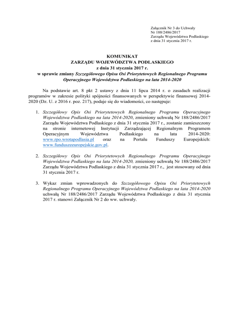 Załącznik Nr 3 do Uchwały Nr 188/2486/2017 Zarządu Województwa Podlaskiego z dnia 31 stycznia 2017 r. KOMUNIKAT ZARZĄDU WOJEWÓDZTWA PODLASKIEGO z dnia 31 stycznia 2017 r. w sprawie zmiany Szczegółowego Opisu Osi Priorytetowych Regionalnego Programu Operacyjnego Województwa Podlaskiego na lata 2014-2020 Na podstawie art. 8 pkt 2 ustawy z dnia 11 lipca 2014 r. o zasadach realizacji programów w zakresie polityki spójności finansowanych w perspektywie finansowej 20142020 (Dz. U. z 2016 r. poz. 217), podaje się do wiadomości, co następuje: 1. Szczegółowy Opis Osi Priorytetowych Regionalnego Programu Operacyjnego Województwa Podlaskiego na lata 2014-2020, zmieniony uchwałą Nr 188/2486/2017 Zarządu Województwa Podlaskiego z dnia 31 stycznia 2017 r., zostanie zamieszczony na stronie internetowej Instytucji Zarządzającej Regionalnym Programem Operacyjnym Województwa Podlaskiego na lata 2014-2020: www.rpo.wrotapodlasia.pl oraz na Portalu Funduszy Europejskich: www.funduszeeuropejskie.gov.pl. 2. Szczegółowy Opis Osi Priorytetowych Regionalnego Programu Operacyjnego Województwa Podlaskiego na lata 2014-2020, zmieniony uchwałą Nr 188/2486/2017 Zarządu Województwa Podlaskiego z dnia 31 stycznia 2017 r., jest stosowany od dnia 31 stycznia 2017 r. 3. Wykaz zmian wprowadzonych do Szczegółowego Opisu Osi Priorytetowych Regionalnego Programu Operacyjnego Województwa Podlaskiego na lata 2014-2020 uchwałą Nr 188/2486/2017 Zarządu Województwa Podlaskiego z dnia 31 stycznia 2017 r. stanowi Załącznik Nr 2 do ww. uchwały.