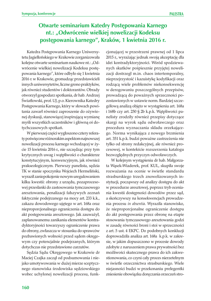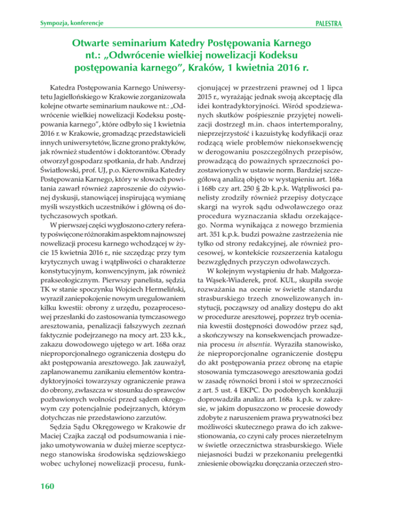 PALESTRA Sympozja, konferencje Otwarte seminarium Katedry Postępowania Karnego nt.: „Odwrócenie wielkiej nowelizacji Kodeksu postępowania karnego”, Kraków, 1 kwietnia 2016 r. Katedra Postępowania Karnego Uniwersytetu Jagiellońskiego w Krakowie zorganizowała kolejne otwarte seminarium naukowe nt.: „Odwrócenie wielkiej nowelizacji Kodeksu postępowania karnego”, które odbyło się 1 kwietnia 2016 r. w Krakowie, gromadząc przedstawicieli innych uniwersytetów, liczne grono praktyków, jak również studentów i doktorantów. Obrady otworzył gospodarz spotkania, dr hab. Andrzej Światłowski, prof. UJ, p.o. Kierownika Katedry Postępowania Karnego, który w słowach powitania zawarł również zaproszenie do ożywionej dyskusji, stanowiącej inspirującą wymianę myśli wszystkich uczestników i główną oś dotychczasowych spotkań. W pierwszej części wygłoszono cztery referaty poświęcone różnorakim aspektom najnowszej nowelizacji procesu karnego wchodzącej w życie 15 kwietnia 2016 r., nie szczędząc przy tym krytycznych uwag i wątpliwości o charakterze konstytucyjnym, konwencyjnym, jak również prakseologicznym. Pierwszy panelista, sędzia TK w stanie spoczynku Wojciech Hermeliński, wyraził zaniepokojenie nowym uregulowaniem kilku kwestii: obrony z urzędu, pozaprocesowej przesłanki do zastosowania tymczasowego aresztowania, penalizacji fałszywych zeznań faktycznie podejrzanego na mocy art. 233 k.k., zakazu dowodowego ujętego w art. 168a oraz nieproporcjonalnego ograniczenia dostępu do akt postępowania aresztowego. Jak zauważył, zaplanowanemu zanikaniu elementów kontradyktoryjności towarzyszy ograniczenie prawa do obrony, zwłaszcza w stosunku do sprawców pozbawionych wolności przed sądem okręgowym czy potencjalnie podejrzanych, którym dotychczas nie przedstawiono zarzutów. Sędzia Sądu Okręgowego w Krakowie dr Maciej Czajka zaczął od podsumowania i niejako umotywowania w dużej mierze sceptycznego stanowiska środowiska sędziowskiego wobec uchylonej nowelizacji procesu, funk- 160 cjonującej w przestrzeni prawnej od 1 lipca 2015 r., wyrażając jednak swoją akceptację dla idei kontradyktoryjności. Wśród spodziewanych skutków pośpiesznie przyjętej nowelizacji dostrzegł m.in. chaos intertemporalny, nieprzejrzystość i kazuistykę kodyfikacji oraz rodzącą wiele problemów niekonsekwencję w derogowaniu poszczególnych przepisów, prowadzącą do poważnych sprzeczności pozostawionych w ustawie norm. Bardziej szczegółową analizą objęto w wystąpieniu art. 168a i 168b czy art. 250 § 2b k.p.k. Wątpliwości panelisty zrodziły również przepisy dotyczące skargi na wyrok sądu odwoławczego oraz procedura wyznaczania składu orzekającego. Norma wynikająca z nowego brzmienia art. 351 k.p.k. budzi poważne zastrzeżenia nie tylko od strony redakcyjnej, ale również procesowej, w kontekście rozszerzenia katalogu bezwzględnych przyczyn odwoławczych. W kolejnym wystąpieniu dr hab. Małgorzata Wąsek-Wiaderek, prof. KUL, skupiła swoje rozważania na ocenie w świetle standardu strasburskiego trzech znowelizowanych instytucji, począwszy od analizy dostępu do akt w procedurze aresztowej, poprzez tryb oceniania kwestii dostępności dowodów przez sąd, a skończywszy na konsekwencjach prowadzenia procesu in absentia. Wyraziła stanowisko, że nieproporcjonalne ograniczenie dostępu do akt postępowania przez obronę na etapie stosowania tymczasowego aresztowania godzi w zasadę równości broni i stoi w sprzeczności z art. 5 ust. 4 EKPC. Do podobnych konkluzji doprowadziła analiza art. 168a k.p.k. w zakresie, w jakim dopuszczono w procesie dowody zdobyte z naruszeniem prawa prywatności bez możliwości skutecznego prawa do ich zakwestionowania, co czyni cały proces nierzetelnym w świetle orzecznictwa strasburskiego. Wiele niejasności budzi w przekonaniu prelegentki zniesienie obowiązku doręczania orzeczeń stro- 6/2016 nom nieobecnym na ogłoszeniu wyroku przez pryzmat ich prawa do zaskarżenia orzeczenia, gdy jednocześnie rozbudowaniu ulega prowadzenie procesu pod nieobecność oskarżonego. W ostatnim referacie – prokuratora b. Prokuratury Apelacyjnej w Krakowie Janusza Śliwy, a jednocześnie b. członka Komisji Kodyfikacyjnej Prawa Karnego, nie zabrakło odniesień do formy i trybu zniesienia poprzedniej reformy, w tym m.in. niezwykle krótkiego vacatio legis, który kłóci się z tym, co rozumiemy przez legislację godziwą. Obok apriorycznego założenia przez ustawodawcę wadliwości przepisów wprowadzonych w ubiegłym roku prelegent zauważył rozbieżność pomiędzy tym, co powszechnie krytykowano w postępowaniu przygotowawczym, a tym, do czego faktycznie odniesiono się w treści nowej reformy. Nie uszła uwagi panelisty również forma zredagowania art. 168a k.p.k., niebezpiecznie ograniczająca sferę uprawnień sądu, czy brak określenia w art. 168b k.p.k. niezbędnych przesłanek legitymizujących decyzję prokuratora w przedmiocie tzw. zgody następczej na wykorzystanie materiałów kontroli operacyjnej w postępowaniu karnym. Wystąpienie zakończyły refleksje o zmianach ustrojowych w prokuraturze i towarzyszącym im zjawisku o skutkach nieodwracalnych – rozformowaniu jednostek prokuratury i odejściu rzeszy doświadczonych prokuratorów w stan spoczynku. Po interesujących wystąpieniach ekspertów drugą część seminarium otworzyła długa i pogłębiona dyskusja, w której głos zajęli głównie sędziowie i prokuratorzy, w tym m.in. J. Biederman, W. Domański, T. Duski, W. Dziuban, E. Klimowicz-Gajlikowska, J. Krok, a także wszyscy wygłaszający referaty paneliści. Wypada jednak w tym miejscu zwrócić uwagę, że debata przebiegała w sposób odmienny, niż zdążyły nas przyzwyczaić poprzednie seminaria. Choć dotychczasowe dyskusje zawsze charakteryzował silny element sporności wśród dyskutantów, niejako wpisujący się w ducha prowadzonych rozważań nad zwięks