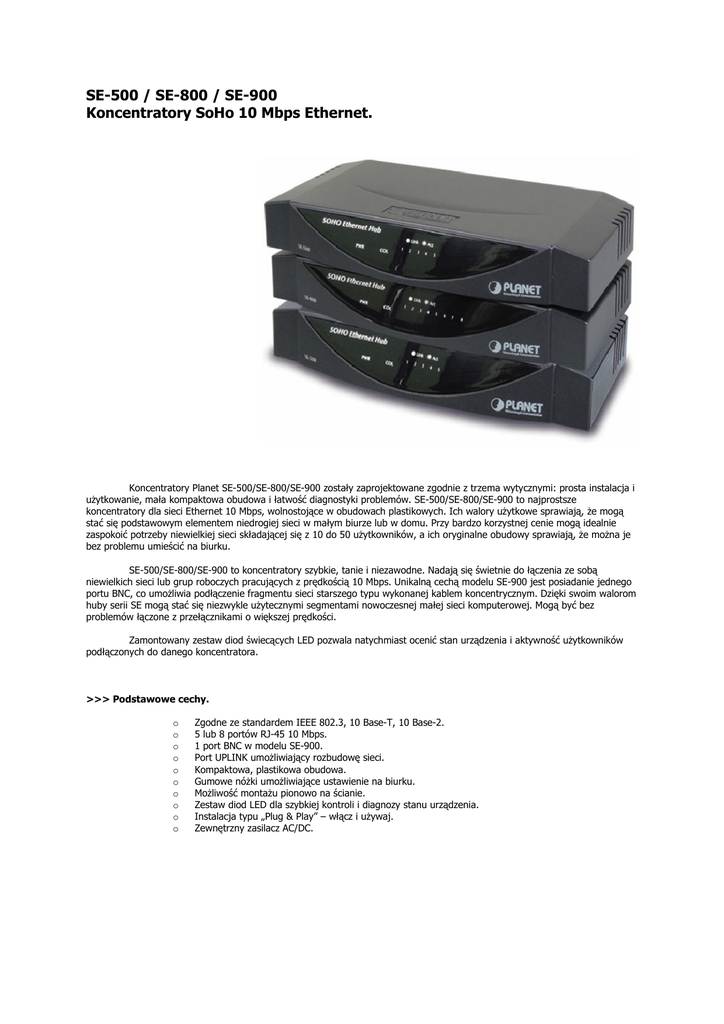 SE-500 / SE-800 / SE-900 Koncentratory SoHo 10 Mbps Ethernet. Koncentratory Planet SE-500/SE-800/SE-900 zostały zaprojektowane zgodnie z trzema wytycznymi: prosta instalacja i użytkowanie, mała kompaktowa obudowa i łatwość diagnostyki problemów. SE-500/SE-800/SE-900 to najprostsze koncentratory dla sieci Ethernet 10 Mbps, wolnostojące w obudowach plastikowych. Ich walory użytkowe sprawiają, że mogą stać się podstawowym elementem niedrogiej sieci w małym biurze lub w domu. Przy bardzo korzystnej cenie mogą idealnie zaspokoić potrzeby niewielkiej sieci składającej się z 10 do 50 użytkowników, a ich oryginalne obudowy sprawiają, że można je bez problemu umieścić na biurku. SE-500/SE-800/SE-900 to koncentratory szybkie, tanie i niezawodne. Nadają się świetnie do łączenia ze sobą niewielkich sieci lub grup roboczych pracujących z prędkością 10 Mbps. Unikalną cechą modelu SE-900 jest posiadanie jednego portu BNC, co umożliwia podłączenie fragmentu sieci starszego typu wykonanej kablem koncentrycznym. Dzięki swoim walorom huby serii SE mogą stać się niezwykle użytecznymi segmentami nowoczesnej małej sieci komputerowej. Mogą być bez problemów łączone z przełącznikami o większej prędkości. Zamontowany zestaw diod świecących LED pozwala natychmiast ocenić stan urządzenia i aktywność użytkowników podłączonych do danego koncentratora. >>> Podstawowe cechy. o o o o o o o o o o Zgodne ze standardem IEEE 802.3, 10 Base-T, 10 Base-2. 5 lub 8 portów RJ-45 10 Mbps. 1 port BNC w modelu SE-900. Port UPLINK umożliwiający rozbudowę sieci. Kompaktowa, plastikowa obudowa. Gumowe nóżki umożliwiające ustawienie na biurku. Możliwość montażu pionowo na ścianie. Zestaw diod LED dla szybkiej kontroli i diagnozy stanu urządzenia. Instalacja typu „Plug & Play” – włącz i używaj. Zewnętrzny zasilacz AC/DC. >>>Dane techniczne. Produkt Model Standardy Porty Koncentrator SOHO 10 Mbps. SE-500 IEEE 802.3 10 Base-T Ethernet 10 Base-2 5 RJ-45 Wskaźniki wizualne Diody LED: Power LINK/ACT (dla każdego portu) Collision (dla każdego portu) Zasilanie Zewnętrzny zasilacz AC 230V / DC 7,5V 0,8A Wymiary 191 x 95 x 30 mm (Sz x Gł x Wys) Materiał obudowy Warunki pracy Plastik Temperatura: 0 do 55 st.C Wilgotność: 10 - 80 % bez kondensacji Temperatura: -10 do 70 st.C Wilgotność: 5 - 90 % bez kondensacji Warunki składowania >>>Oznaczenie handlowe. SE-900 Koncentrator 8 portów RJ-45 10 Base-T + 1 port BNC 10 Base-2. SE-800 Koncentrator 8 portów RJ-45 10 Base-T. SE-500 Koncentrator 5 portów RJ-45 10 Base-T. SE-800 8 RJ-45 SE-900 8 RJ-45 1 BNC
