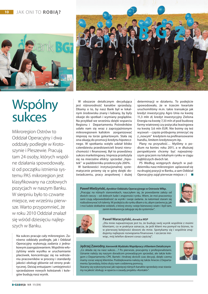 10 JAK ONI TO ROBIĄ? Wspólny sukces Mikroregion Ostrów to Oddział Operacyjny i dwa oddziały podległe w Krotoszynie i Pleszewie. Pracują tam 24 osoby, których wspólne działania spowodowały, iż od początku istnienia systemu PAS mikroregion jest klasyfikowany na czołowych pozycjach w naszym Banku. W sierpniu było to czwarte miejsce, we wrześniu pierwsze. Warto przypomnieć, że w roku 2010 Oddział znalazł się wśród dziesięciu najlepszych w Banku. Na sukces pracuje cały mikroregion. Zarówno oddziały podległe, jak i Oddział Operacyjny wykonują zadania z jednakowym zaangażowaniem. Wspólnie włożyliśmy wiele wysiłku w uruchamianie placówek, koncentrując się na wdrożeniu pracowników w procesy i standardy jakości obsługi głównie od strony praktycznej. Dzisiaj entuzjazm i umiejętności sprzedażowe nowych koleżanek i kolegów budują nasz wynik. N R 11( 59 ) W obszarze detalicznym decydująca jest różnorodność kanałów sprzedaży. Dbamy o to, by nasz Bank był w lokalnym środowisku znany i lubiany, by były okazje do spotkań i wymiany poglądów. Na przykład we wrześniu dzięki wsparciu Regionu i Departamentu Pośredników udało nam się wraz z zaprzyjaźnionym mikroregionem kaliskim zorganizować imprezę na torze gokartowym. Stała się ona okazją do promocji kredytu hipotecznego. W spotkaniu wzięło udział blisko czterdziestu przedstawicieli branż nieruchomości i finansowej. Był to prawdziwy sukces marketingowy. Impreza przełożyła się na mierzalne efekty: sprzedaż „hipotek” w październiku przekroczyła 200%. W bankowości instytucjonalnej systematycznie pniemy się w górę dzięki doświadczeniu, pracy zespołowej i dużej determinacji w działaniu. To podejście spowodowało, że w trzecim kwartale uruchomiliśmy m.in. takie transakcje jak kredyt inwestycyjny Agro Unia na kwotę 11,3 mln zł, kredyt inwestycyjny Zielona Energia na kwotę 7,33 mln zł pod budowę farmy wiatrowej czy pożyczka leasingowa na kwotę 3,6 mln EUR. Nie boimy się też wyzwań – często próbujemy zmierzyć się z „nowym” kredytem na prefinansowanie handlu, limitem kredytowym itp. Plany na przyszłość… Myślimy o podium na koniec roku 2011, a w dłuższej perspektywie chcemy być najważniejszym graczem na lokalnym rynku w ciągu najbliższych dwóch lat. PS Według wstępnych danych w październiku nasz mikroregion uplasował się na drugiej pozycji w Banku, a sam Oddział Operacyjny zajął pierwsze miejsce ;-) Paweł Mielżyński, dyrektor Oddziału Operacyjnego w Ostrowie Wlkp. „Pracując na różnych stanowiskach, nauczyłem się, że powodzenie zależy od dwóch rzeczy – od dobrych ludzi i znajomości rynku. Wiem, że moi pracownicy sami czują odpowiedzialność za wynik i swoje zadania. Ja natomiast staram się rozbudowywać ich talenty. W podejściu do rynku dbam o to, abym zarówno ja, jak i moi ludzie dokładnie widzieli, z której strony »wieje biznesowy wiatr« i byli tam, zanim konkurencja zaloguje się do systemów”. Paweł Waraczyński, doradca MSP „Dla mnie najważniejsze jest to, że buduję swój wynik wspólnie z moimi klientami, co w praktyce oznacza, że jeśli klient ma pomysł na biznes, to w pierwszej kolejności dzwoni do mnie. Spotykamy się i wspólnie znajdujemy najlepsze rozwiązania finansowe. I szczerze mówiąc, mój telefon dzwoni coraz częściej”. Jędrzej Zawodny, kierownik Wydziału Współpracy z Klientem Detalicznym „Co składa się na nasz sukces…? Po pierwsze, pracujemy z profesjonalistami. Uznanie należy się naszym doradcom prowadzącym sprzedaż, ale także kolegom z Departamentu CPK. Bartek i Andrzej skrócili czas decyzji, dzięki czemu mamy coraz więcej klientów. Podziękowania należą się także Anecie z Departamentu Sprzedaży, która służy nam codzienną pomocą. Staramy się wykorzystywać jak najwięcej różnych kanałów sprzedaży oraz stawiamy na jakość obsługi, w oparciu o zasady projektu »Kontakt«”.