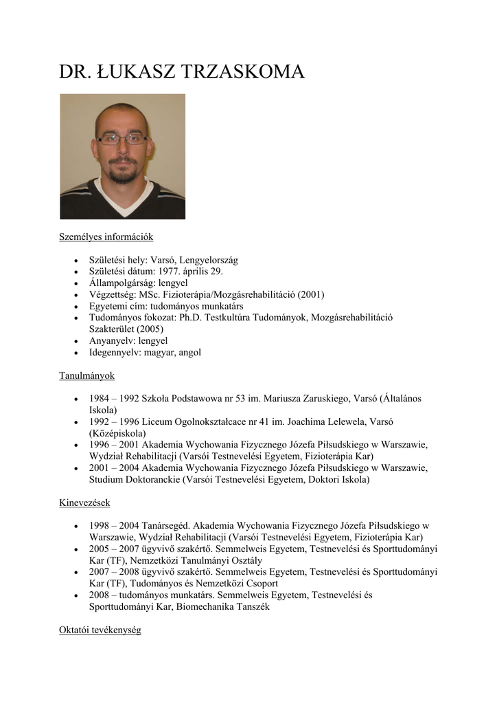 DR. ŁUKASZ TRZASKOMA Személyes információk Születési hely: Varsó, Lengyelország Születési dátum: 1977. április 29. Állampolgárság: lengyel Végzettség: MSc. Fizioterápia/Mozgásrehabilitáció (2001) Egyetemi cím: tudományos munkatárs Tudományos fokozat: Ph.D. Testkultúra Tudományok, Mozgásrehabilitáció Szakterület (2005) Anyanyelv: lengyel Idegennyelv: magyar, angol Tanulmányok 1984 – 1992 Szkoła Podstawowa nr 53 im. Mariusza Zaruskiego, Varsó (Általános Iskola) 1992 – 1996 Liceum Ogolnokształcace nr 41 im. Joachima Lelewela, Varsó (Középiskola) 1996 – 2001 Akademia Wychowania Fizycznego Józefa Piłsudskiego w Warszawie, Wydział Rehabilitacji (Varsói Testnevelési Egyetem, Fizioterápia Kar) 2001 – 2004 Akademia Wychowania Fizycznego Józefa Piłsudskiego w Warszawie, Studium Doktoranckie (Varsói Testnevelési Egyetem, Doktori Iskola) Kinevezések 1998 – 2004 Tanársegéd. Akademia Wychowania Fizycznego Józefa Piłsudskiego w Warszawie, Wydział Rehabilitacji (Varsói Testnevelési Egyetem, Fizioterápia Kar) 2005 – 2007 ügyvivő szakértő. Semmelweis Egyetem, Testnevelési és Sporttudományi Kar (TF), Nemzetközi Tanulmányi Osztály 2007 – 2008 ügyvivő szakértő. Semmelweis Egyetem, Testnevelési és Sporttudományi Kar (TF), Tudományos és Nemzetközi Csoport 2008 – tudományos munkatárs. Semmelweis Egyetem, Testnevelési és Sporttudományi Kar, Biomechanika Tanszék Oktatói tevékenység Graduális képzés Testnevelő tanári szak (angol nyelv): Biomechanika Sportbiomechanika Funkcionális Biomechanika Humánkineziológia szak (angol nyelv): Sportbiomechanika Fizioterápia Továbbképző kurzusok (angol nyelv) Erőfejlesztés Sportsérülések Sport Terápia Továbbképző kurzusok (lengyel nyelv): Edzőképzések (kosárlabda, kézilabda, röplabda, labdarúgás, triatlon, téli sportok, atlétika, tollaslabda) során tartott előadások és gyakorlati foglalkozások biomechanika, edzéselmélet, rehabilitáció és sérülések megelőzése témakörökben. Tanulmányutak 2003 John Moores University, School of Human Sciences, Department of Biomechanics, Liverpool Kutatói tevékenység Befejezett kutatási témák Kutatási pályázat – “New method of evaluation strength of the hip joint muscles”. Grant KBN nr 4PO5D07617 Sportszakmai tevékenység Edzői tevékenység 1998 – 2000 Kajak és vízisportok oktatás, gyermek nyári táboroztatás 2000 – 2001 KS “Start” Kerekesszékes Kosárlabda Egyesület edzője, Varsó 2000 – 2004 UKS “Izabelin” Kosárlabda Egyesület edzője, Varsó 2001 – 2004 Személyi edző, Fitness Club “Gymnasion”, Varsó 2003 – 2004 “Noteć Inowrocław” Kosárlabda Egyesület másodedzője, Inowrocław, Lengyelország 2006 – Személyi edző, professzionális sportolók Sporttevékenység 1991 – 2004 Igazolt kosárlabda játékos -AZS AWF Varsó 2007 – Igazolt kosárlabda játékos- TFSE / NB II. Tudományos közlemények Hazai és nemzetközi publikációk Trzaskoma Z., Trzaskoma Ł.: (1999) Zwiekszanie siły miesniowej sportowców wysokiej klasy (Developing muscle strength in elite athletes). Physical Education and Sport, 1-2: 10-35. Trzaskoma Z., Trzaskoma Ł.: (1999) Siła i moc me+czyzn i kobiet uprawiajacych zespołowe gry sportowe (Strength and power in elite male and female players engaged in team sports). W: R. Bedzinski (red.), Proceedings of the 4th Polish Scientific Conference “Biomechanics ’99″, Acta of Bioengineering and Biomechanics, 1(1): 519-522. Trzaskoma Z., Trzaskoma Ł.: (2000) Siła maksymalna me+czyzn i kobiet uprawiajacych judo (Maximal strength of male and female judoka). W: R. Bedzinski (red.), Proceedings of the 16th School of Biomechanics, Acta of Bioengineering and Biomechanics, 2(1): 567-572. Wychowanski M., Wit A., Staniak Z., Ilnicka L., Trzaskoma Ł.: (2000) Stanowisko modelowe do pomiaru momentów sił rozwijanych przez miesnie stawu biodrowego w warunkach statycznych (Prototype stand for measurements of hip joint torques under static conditions). W: R. Bedzinski (red.), Proceedings of the 16th School of Biomechanics, Acta of Bioengineering and Biomechanics, 2(1): 619-624. Trzaskoma Z., Trzaskoma Ł.: (2001) Zwiekszanie mocy sportowców dyscyplin zimowych w kolejnych latach procesu treningowego (Developing power in winter sports athletes during successive years of training process). W: Zeszyty Naukowe (red. Sz. Krasicki i K. Chojnacki), AWF w Krakowie, 84:224-227. Wychowanski M., Trzaskoma Ł., Siwek W., Rapała K., Ilnicka L., Wit A.: (2001) Momenty sił rozwijane przez miesnie stawu biodrowego (Maximal isometric muscle torques produced by hip joint muscles). Acta of Bioengineering and Biomechanics 3(2): 685-692. Trzaskoma Z., Trzaskoma Ł.: (2001) Proporcje miedzy maksymalnymi momentami sił głównych grup miesni u sportowców (The propotions between maximal torque of core muscles in male and female athletes). Acta of Bioengineering and Biomechanics 3(2):601-606> Wychowanski M., Wit A., Trzaskoma Ł., Gajewski L.: Ilnicka., Staniak Z.: (2002) Maximal isometric torques of hip joint muscles. Acta of Bioengineering and Biomechanics, 4(1): 628-629. Trzaskoma Z., Trzaskoma Ł., Pastuszko E.: (2002) The relationship between maximal muscle strength and power output in young male and female athletes. Physical Education and Sport, 46(1-I):592-593 Trzaskoma Ł., Ilnicka L., Wiszomirska I., Wit A., Wychowanski M. (2003) Changes in handgrip and in selected somatic features in aged subjects in relation to selected social variables. Advanced in Rehabilitation, 17(3): 21-32. Trzaskoma Z., Trzaskoma Ł. (2006) Structure of maximal muscle strength of lower extremities in highly experienced athletes. Physical Education and Sport, 50: 73-78. Idézhető absztraktok Trzaskoma Z., Trzaskoma Ł.: (1998) Influence of isometric strength of lower limbs on the maximal power in male tennis players. Conference Book of International Conference