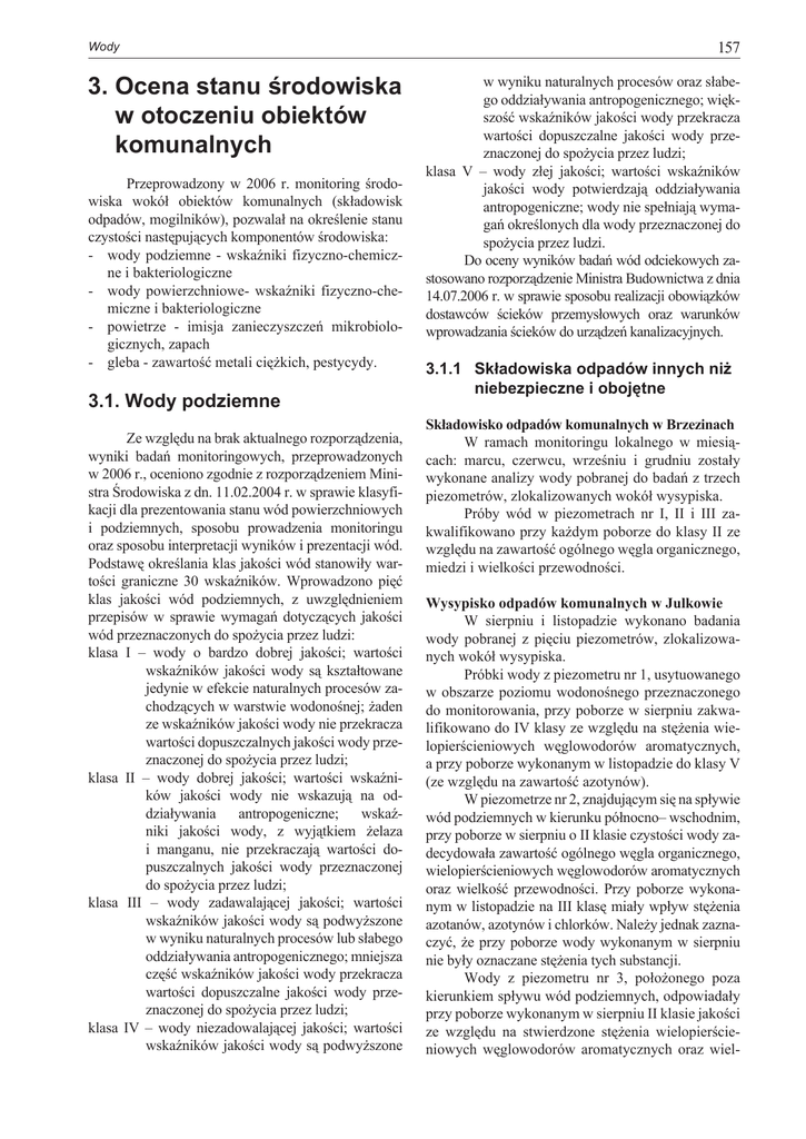 Wody 3. Ocena stanu środowiska w otoczeniu obiektów komunalnych Przeprowadzony w 2006 r. monitoring środowiska wokół obiektów komunalnych (składowisk odpadów, mogilników), pozwalał na określenie stanu czystości następujących komponentów środowiska: - wody podziemne - wskaźniki fizyczno-chemiczne i bakteriologiczne - wody powierzchniowe- wskaźniki fizyczno-chemiczne i bakteriologiczne - powietrze - imisja zanieczyszczeń mikrobiologicznych, zapach - gleba - zawartość metali ciężkich, pestycydy. 3.1. Wody podziemne Ze względu na brak aktualnego rozporządzenia, wyniki badań monitoringowych, przeprowadzonych w 2006 r., oceniono zgodnie z rozporządzeniem Ministra Środowiska z dn. 11.02.2004 r. w sprawie klasyfikacji dla prezentowania stanu wód powierzchniowych i podziemnych, sposobu prowadzenia monitoringu oraz sposobu interpretacji wyników i prezentacji wód. Podstawę określania klas jakości wód stanowiły wartości graniczne 30 wskaźników. Wprowadzono pięć klas jakości wód podziemnych, z uwzględnieniem przepisów w sprawie wymagań dotyczących jakości wód przeznaczonych do spożycia przez ludzi: klasa I – wody o bardzo dobrej jakości; wartości wskaźników jakości wody są kształtowane jedynie w efekcie naturalnych procesów zachodzących w warstwie wodonośnej; żaden ze wskaźników jakości wody nie przekracza wartości dopuszczalnych jakości wody przeznaczonej do spożycia przez ludzi; klasa II – wody dobrej jakości; wartości wskaźników jakości wody nie wskazują na oddziaływania antropogeniczne; wskaźniki jakości wody, z wyjątkiem żelaza i manganu, nie przekraczają wartości dopuszczalnych jakości wody przeznaczonej do spożycia przez ludzi; klasa III – wody zadawalającej jakości; wartości wskaźników jakości wody są podwyższone w wyniku naturalnych procesów lub słabego oddziaływania antropogenicznego; mniejsza część wskaźników jakości wody przekracza wartości dopuszczalne jakości wody przeznaczonej do spożycia przez ludzi; klasa IV – wody niezadowalającej jakości; wartości wskaźników jakości wody są podwyższone 157 w wyniku naturalnych procesów oraz słabego oddziaływania antropogenicznego; większość wskaźników jakości wody przekracza wartości dopuszczalne jakości wody przeznaczonej do spożycia przez ludzi; klasa V – wody złej jakości; wartości wskaźników jakości wody potwierdzają oddziaływania antropogeniczne; wody nie spełniają wymagań określonych dla wody przeznaczonej do spożycia przez ludzi. Do oceny wyników badań wód odciekowych zastosowano rozporządzenie Ministra Budownictwa z dnia 14.07.2006 r. w sprawie sposobu realizacji obowiązków dostawców ścieków przemysłowych oraz warunków wprowadzania ścieków do urządzeń kanalizacyjnych. 3.1.1 Składowiska odpadów innych niż niebezpieczne i obojętne Składowisko odpadów komunalnych w Brzezinach W ramach monitoringu lokalnego w miesiącach: marcu, czerwcu, wrześniu i grudniu zostały wykonane analizy wody pobranej do badań z trzech piezometrów, zlokalizowanych wokół wysypiska. Próby wód w piezometrach nr I, II i III zakwalifikowano przy każdym poborze do klasy II ze względu na zawartość ogólnego węgla organicznego, miedzi i wielkości przewodności. Wysypisko odpadów komunalnych w Julkowie W sierpniu i listopadzie wykonano badania wody pobranej z pięciu piezometrów, zlokalizowanych wokół wysypiska. Próbki wody z piezometru nr 1, usytuowanego w obszarze poziomu wodonośnego przeznaczonego do monitorowania, przy poborze w sierpniu zakwalifikowano do IV klasy ze względu na stężenia wielopierścieniowych węglowodorów aromatycznych, a przy poborze wykonanym w listopadzie do klasy V (ze względu na zawartość azotynów). W piezometrze nr 2, znajdującym się na spływie wód podziemnych w kierunku północno– wschodnim, przy poborze w sierpniu o II klasie czystości wody zadecydowała zawartość ogólnego węgla organicznego, wielopierścieniowych węglowodorów aromatycznych oraz wielkość przewodności. Przy poborze wykonanym w listopadzie na III klasę miały wpływ stężenia azotanów, azotynów i chlorków. Należy jednak zaznaczyć, że przy poborze wody wykonanym w sierpniu nie były oznaczane stężenia tych substancji. Wody z piezometru nr 3, położonego poza kierunkiem spływu wód podziemnych, odpowiadały przy poborze wykonanym w sierpniu II klasie jakości ze względu na stwierdzone stężenia wielopierścieniowych węglowodorów aromatycznych oraz wiel- 158 kość przewodności. Przy poborze listopadowym o III klasie zadecydowała zawartość azotanów. W piezometrze nr 4, usytuowanym w obszarze poziomu wodonośnego przeznaczonego do monitorowania, w poborze wykonanym w sierpniu o II klasie jakości wody zadecydowała zawartość wielopierścieniowych węglowodorów aromatycznych oraz wielkość przewodności. Natomiast podczas badań wykonanych w listopadzie woda odpowiadała IV klasie czystości ze względu na zawartość azotynów. Wody z piezometru nr 5, położonego na spływie wód podziemnych w kierunku południowym, odpowiadały w sierpniowej serii badań klasie II (ze względu na zawartość wielopierścieniowych węglowodorów aromatycznych, ogólnego węgla organicznego oraz wielkość przewodności). Natomiast podczas badań wykonanych w listopadzie stwierdzono IV klasę jakości wody o czym zadecydowały stężenia azotanów. Wysypisko odpadów komunalnych w Rokszycach Nowych W ramach monitoringu lokalnego w czerwcu i grudniu pobrano do badań wodę z trzech piezometrów, zlokalizowanych w otoczeniu wysypiska na kierunku spływu wód podziemnych. Zbadane próby wody w piezometrze nr P–1a zakwalifikowano, przy poborze wykonanym w czerwcu, do klasy V (ze względu na zawartość wielopierścieniowych węglowodorów aromatycznych), a przy poborze grudniowym do klasy IV, o czym zadecydowały również stężenia wielopierścieniowych węglowodorów aro