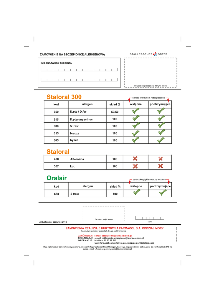 ZAMÓWIENIE NA SZCZEPIONKĘ ALERGENOWĄ ZAMÓWIENIA REALIZUJE HURTOWNIA FARMACOL S.A. ODDZIAŁ MORY Formularz prosimy przesłać drogą elektroniczną ZAMÓWIENIA: e-mail: [email protected] REKLAMACJE: e-mail: [email protected] INFORMACJE: infolinia: 22 73 38 610 www.farmacol.com.pl/strefa-apteki/szczepionkistallergenes PL-MM ZAM 1/06.2016 Aktualizacja: czerwiec 2016