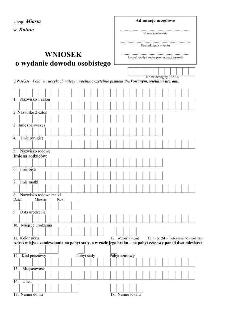 Adnotacje urzędowe Urząd Miasta .............................................................. w Kutnie Numer zamówienia ............................................................. Data założenia wniosku WNIOSEK o wydanie dowodu osobistego ............................................................ Pieczęć i podpis osoby przyjmującej wniosek Nr ewidencyjny PESEL UWAGA: Pola w rubrykach należy wypełniać czytelnie pismem drukowanym, wielkimi literami. 1. Nazwisko 1 człon 2. Nazwisko 2 człon 3. Imię (pierwsze) 4. Imię (drugie) 5. Nazwisko rodowe Imiona rodziców: 6. Imię ojca 7. Imię matki 8. Nazwisko rodowe matki Dzień Miesiąc Rok 9. Data urodzenia 10. Miejsce urodzenia 11. Kolor oczu 12. Wzrost (w cm) 13. Płeć (M – mężczyzna, K – kobieta) Adres miejsca zamieszkania na pobyt stały, a w razie jego braku – na pobyt czasowy ponad dwa miesiące: 14. Kod pocztowy Pobyt stały Pobyt czasowy 15. Miejscowość 16. Ulica 17. Numer domu 18. Numer lokalu Posiadany dokument tożsamości: ..........................................................................................………… 19. Seria Wydany przez: 20. Numer 21. Nazwa 22. Siedziba a) podlega wymianie z powodu ................................................................................ ......................................................................................................................................... b) został utracony w dniu Fotografia 35 x 45 mm Dzień Miesiąc Rok c) przyczyna utraty (kradzież, zagubienie, zniszczenie) Do wniosku załączam 2 fotografie oraz następujące dokumenty: .................................................................................................................................... 2. .................................................................................................................................... 3. .................................................................................................................................... 4. .................................................................................................................................... 1. Uprzedzony o odpowiedzialności karnej z art. 233 Kodeksu karnego za fałszywe zeznanie, prawdziwość powyższych danych potwierdzam własnoręcznym podpisem. ................................................... dnia ............................. miejscowość podpis Adnotacje urzędowe Stwierdza się zgodność danych zawartych w rubrykach niniejszego wniosku od 1 do 10 z aktem urodzenia (małżeństwa) Nr .............................. Kierownik Urzędu Pieczęć Stanu Cywilnego USC ...................................... ..................................... miejscowość, dnia podpis Pieczęć wystawcy i podpis upoważnionej osoby Stwierdza się, że wnioskodawca jest zameldowany pod wskazanym adresem w rubrykach od 14 do 18: a) na pobyt stały od dnia ................................................................. ......................................... ........................................ .. data pod pis b) na pobyt czasowy ponad 2 miesiące od dnia .............................................. do dnia ............................................................ ......................................... ......................................... .. data podpis POUCZENIE: 1. Wniosek należy złożyć w gminnym lub miejskim Organie Ewidencji Ludności, właściwym dla miejsca zamieszkania. 2. Do wniosku należy dołączyć następujące dokumenty; odpis skrócony aktu urodzenia lub aktu małżeństwa i posiadany dokument tożsamości. W przypadku, gdy wymienione akty znajdują się w miejscowym Urzędzie Stanu Cywilnego, sprawdzenia danych zawartych we wniosku dokonuje organ przyjmujący wniosek, bez potrzeby załączania odpisów aktów. Do wniosku o wymianę dowodu osobistego, nie załącza się odpisów aktów stanu cywilnego, jeżeli dane osobowe nie uległy zmianie od czasu wydania ostatniego dokumentu. 3. Do wniosku należy dołączyć dwie aktualne kolorowe lub czarno-białe fotografie o wymiarach 35 x 45 mm podpisane na odwrocie imieniem i nazwiskiem wnioskodawcy. 4. W rubryce „kolor oczu” należy wpisać zgodnie ze stanem faktycznym: „NIEBIESKIE, SZARE, ZIELONE, PIWNE, BRĄZOWE, CZARNE, CZERWONE, WIELOKOLOROWE, NIEOKREŚLONE”. 5. W przypadku, gdy wnioskodawcą jest osoba mieszkająca na stałe poza granicami kraju, posiadająca obywatelstwo polskie, w rubryce 15 – „Miejscowość” powinna wpisać kraj stałego zamieszkania, natomiast w polach dotyczących posiadanego dokumentu tożsamości powinna wpisać dane o posiadanym paszporcie. 6. W przypadku, gdy wnioskodawca posiada większą ilość członów nazwiska niż dwa, kolejne nazwiska należy wpisywać kolejno w rubrykach 1 i 2 oddzielone jednym wolnym miejscem, zasada ta również dotyczy większej ilości imion (rubryki 3 i 4).
