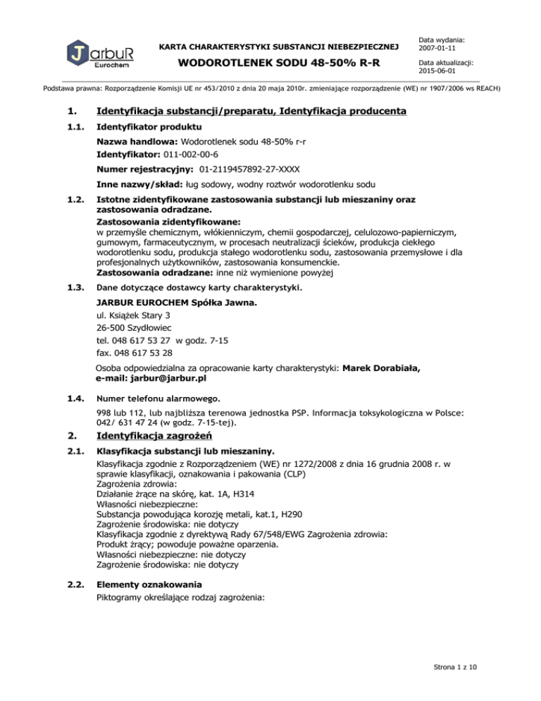 KARTA CHARAKTERYSTYKI SUBSTANCJI NIEBEZPIECZNEJ WODOROTLENEK SODU 48-50% R-R Data wydania: 2007-01-11 Data aktualizacji: 2015-06-01 Podstawa prawna: Rozporządzenie Komisji UE nr 453/2010 z dnia 20 maja 2010r. zmieniające rozporządzenie (WE) nr 1907/2006 ws REACH) 1. Identyfikacja substancji/preparatu, Identyfikacja producenta 1.1. Identyfikator produktu Nazwa handlowa: Wodorotlenek sodu 48-50% r-r Identyfikator: 011-002-00-6 Numer rejestracyjny: 01-2119457892-27-XXXX Inne nazwy/skład: ług sodowy, wodny roztwór wodorotlenku sodu 1.2. Istotne zidentyfikowane zastosowania substancji lub mieszaniny oraz zastosowania odradzane. Zastosowania zidentyfikowane: w przemyśle chemicznym, włókienniczym, chemii gospodarczej, celulozowo-papierniczym, gumowym, farmaceutycznym, w procesach neutralizacji ścieków, produkcja ciekłego wodorotlenku sodu, produkcja stałego wodorotlenku sodu, zastosowania przemysłowe i dla profesjonalnych użytkowników, zastosowania konsumenckie. Zastosowania odradzane: inne niż wymienione powyżej 1.3. Dane dotyczące dostawcy karty charakterystyki. JARBUR EUROCHEM Spółka Jawna. ul. Książek Stary 3 26-500 Szydłowiec tel. 048 617 53 27 w godz. 7-15 fax. 048 617 53 28 Osoba odpowiedzialna za opracowanie karty charakterystyki: Marek Dorabiała, e-mail: [email protected] 1.4. Numer telefonu alarmowego. 998 lub 112, lub najbliższa terenowa jednostka PSP. Informacja toksykologiczna w Polsce: 042/ 631 47 24 (w godz. 7-15-tej). 2. Identyfikacja zagrożeń 2.1. Klasyfikacja substancji lub mieszaniny. Klasyfikacja zgodnie z Rozporządzeniem (WE) nr 1272/2008 z dnia 16 grudnia 2008 r. w sprawie klasyfikacji, oznakowania i pakowania (CLP) Zagrożenia zdrowia: Działanie żrące na skórę, kat. 1A, H314 Własności niebezpieczne: Substancja powodująca korozję metali, kat.1, H290 Zagrożenie środowiska: nie dotyczy Klasyfikacja zgodnie z dyrektywą Rady 67/548/EWG Zagrożenia zdrowia: Produkt żrący; powoduje poważne oparzenia. Własności niebezpieczne: nie dotyczy Zagrożenie środowiska: nie dotyczy 2.2. Elementy oznakowania Piktogramy określające rodzaj zagrożenia: Strona 1 z 10 KARTA CHARAKTERYSTYKI SUBSTANCJI NIEBEZPIECZNEJ WODOROTLENEK SODU 48-50% R-R Data wydania: 2007-01-11 Data aktualizacji: 2015-06-01 Podstawa prawna: Rozporządzenie Komisji UE nr 453/2010 z dnia 20 maja 2010r. zmieniające rozporządzenie (WE) nr 1907/2006 ws REACH) 2.3. Hasło ostrzegawcze: Niebezpieczeństwo Zwroty wskazujące rodzaj zagrożenia: H314 - Powoduje poważne oparzenia skóry oraz uszkodzenia oczu H290 - Może powodować korozję metali Zwroty określające warunki bezpiecznego stosowania: P260 - Nie wdychać pyłu/dymu/gazu/mgły/par/rozpylonej cieczy. P280 - Stosować rękawice ochronne/odzież ochronną/ochronę oczu/ochronę twarzy. P303+P361+P353 - W przypadku kontaktu ze skórą (lub z włosami): Natychmiast usunąć/zdjąć całą zanieczyszczoną odzież. Spłukać skórę pod strumieniem wody/prysznicem. P305+P351+P338 - W przypadku dostania się do oczu: Ostrożnie płukać wodą przez kilka minut. Wyjąć soczewki kontaktowe, jeżeli są i można je łatwo usunąć. nadal płukać. P310 - Natychmiast skontaktować się z Ośrodkiem Zatruć lub lekarzem Inne zagrożenia. Działa silnie korodująco na metale, szczególnie w obecności wilgoci. Niebezpiecznie reaguje z wodą, glinem, cynkiem, cyrkonem, dwuboranem, trójfluorkiem chloru, fosforem, pięciotlenkiem fosforu, kwasem chlorosulfonowym, kwasem solnym, florowodorowym, azotowym, siarkowym, oleum, acetaldehydem, akroleiną, akrylonitrylem, tetrawodorofuranem, nitrometanem, nitroetanem, nitropropanem, trinitroetanolem, trichloroetylenem, trichloronitrometanem. Działa szkodliwie na organizmy wodne ze względu na zmianę pH. 3. Skład i informacja o składnikach. Skład wg Rozporządzenia 1272/2008. Nr WE 215-185-5 Nr CAS 1310-73-2 Nr indeksowy Skład 011-002-00-6 Wodorotlenek sodu r-r 4. Środki pierwszej pomocy. 4.1. Opis środków pierwszej pomocy. Zawartość [%] 48-50% Wdychanie: W razie narażenia inhalacyjnego wyprowadzić poszkodowanego z miejsca zagrożenia. Zapewnić spokój, chronić przed utratą ciepła. W przypadku zatrzymania oddechu zastosować sztuczne oddychanie. Zapewnić pomoc medyczną. Kontakt ze skórą: W razie skażenia skóry/odzieży, zdjąć odzież i obuwie, zanieczyszczoną skórę natychmiast zmywać dużą ilością wody przez co najmniej 15 minut. Jeżeli wystąpiły oparzenia nie stosować mydła. Nie stosować środków zobojętniających. Założyć jałowy opatrunek na oparzenia. Zapewnić natychmiastową pomoc medyczną. Kontakt z oczami: Strona 2 z 10 KARTA CHARAKTERYSTYKI SUBSTANCJI NIEBEZPIECZNEJ WODOROTLENEK SODU 48-50% R-R Data wydania: 2007-01-11 Data aktualizacji: 2015-06-01 Podstawa prawna: Rozporządzenie Komisji UE nr 453/2010 z dnia 20 maja 2010r. zmieniające rozporządzenie (WE) nr 1907/2006 ws REACH) 4.2. 4.3. W razie zanieczyszczenia oczu natychmiast przemywać dużą ilością wody przez co najmniej 15 minut przy otwartych powiekach. Zapewnić natychmiastową pomoc medyczną. UWAGA: osoby narażone na skażenie oczu powinny być pouczone o konieczności i sposobie natychmiastowego płukania oczu. Spożycie: W przypadku spożycia nie wywoływać wymiotów. Osobie przytomnej podać do wypicia duże ilości wody. Poza tym nie podawać niczego doustnie. Nie podawać środków zobojętniających. Natychmiast zapewnić pomoc lekarską. Najważniejsze ostre i opóźnione objawy oraz skutki narażenia. -wdychanie - silnie drażniący, może powodować poważne uszkodzenia górnych dróg oddechowych, oparzenia, możliwe chemiczne zapalenie płuc oraz obrzęk płuc. Objawy kichanie, wysięk z nosa, kaszel, ból gardła, trudności w oddychaniu, a nawet śpiączka. -spożycie - żrący, powoduje poważne oparzenia jamy ustnej, gardła, żołądka, poważne uszkodzenia tkanek przewodu pokarmowego (ryzyko perforacji) mogą prowadzić do śmierci, objawy - silny ból