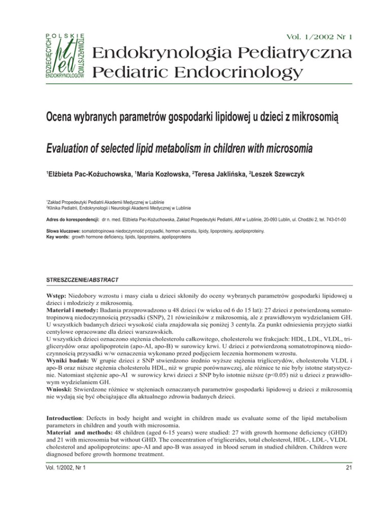 Vol. 1/2002 Nr 1 Endokrynologia Pediatryczna Pediatric Endocrinology Ocena wybranych parametrów gospodarki lipidowej u dzieci z mikrosomią Evaluation of selected lipid metabolism in children with microsomia 1 1 2 Elżbieta Pac-Kożuchowska, 1Maria Kozłowska, 2Teresa Jaklińska, 2Leszek Szewczyk Zakład Propedeutyki Pediatrii Akademii Medycznej w Lublinie Klinika Pediatrii, Endokrynologii i Neurologii Akademii Medycznej w Lublinie Adres do korespondencji: dr n. med. Elżbieta Pac-Kożuchowska, Zakład Propedeutyki Pediatrii, AM w Lublinie, 20-093 Lublin, ul. Chodźki 2, tel. 743-01-00 Słowa kluczowe: somatotropinowa niedoczynność przysadki, hormon wzrostu, lipidy, lipoproteiny, apolipoproteiny. Key words: growth hormone deficiency, lipids, lipoproteins, apolipoproteins STRESZCZENIE/ STRESZCZENIE/ABSTRACT Wstęp: Niedobory wzrostu i masy ciała u dzieci skłoniły do oceny wybranych parametrów gospodarki lipidowej u dzieci i młodzieży z mikrosomią. Materiał i metody: Badania przeprowadzono u 48 dzieci (w wieku od 6 do 15 lat): 27 dzieci z potwierdzoną somatotropinową niedoczynnością przysadki (SNP), 21 rówieśników z mikrosomią, ale z prawidłowym wydzielaniem GH. U wszystkich badanych dzieci wysokość ciała znajdowała się poniżej 3 centyla. Za punkt odniesienia przyjęto siatki centylowe opracowane dla dzieci warszawskich. U wszystkich dzieci oznaczono stężenia cholesterolu całkowitego, cholesterolu we frakcjach: HDL, LDL, VLDL, triglicerydów oraz apolipoprotein (apo-AI, apo-B) w surowicy krwi. U dzieci z potwierdzoną somatotropinową niedoczynnością przysadki w/w oznaczenia wykonano przed podjęciem leczenia hormonem wzrostu. Wyniki badań: W grupie dzieci z SNP stwierdzono średnio wyższe stężenia triglicerydów, cholesterolu VLDL i apo-B oraz niższe stężenia cholesterolu HDL, niż w grupie porównawczej, ale różnice te nie były istotne statystycznie. Natomiast stężenie apo-AI w surowicy krwi dzieci z SNP było istotnie niższe (p<0.05) niż u dzieci z prawidłowym wydzielaniem GH. Wnioski: Stwierdzone różnice w stężeniach oznaczanych parametrów gospodarki lipidowej u dzieci z mikrosomią nie wydają się być obciążające dla aktualnego zdrowia badanych dzieci. Introduction: Defects in body height and weight in children made us evaluate some of the lipid metabolism parameters in children and youth with microsomia. Material and methods: 48 children (aged 6-15 years) were studied: 27 with growth hormone deficiency (GHD) and 21 with microsomia but without GHD. The concentration of triglicerides, total cholesterol, HDL-, LDL-, VLDL cholesterol and apolipoproteins: apo-AI and apo-B was assayed in blood serum in studied children. Children were diagnosed before growth hormone treatment. Vol. 1/2002, Nr 1 21 Prace oryginalne Endokrynol. Ped. , 2002;1(1):21-25 Results: Significant lower mean values for Apo-AI in children with GHD (p<0,05) in relation to children with microsomia but without GHD was found. Conclusion: The confirmed differences in the concentrations of the assayed parameters of lipid metabolism in children with microsomia do not seem responsible for the present health condition of a child. Wstęp Jakościowe i ilościowe zmiany w składzie lipidów i lipoprotein w ustroju człowieka prowadzą do zaburzeń określanych jako dyslipidemie. W obrębie dyslipidemii wyróżniamy hiperlipoproteinemie i hipolipoproteinemie, a te dzielimy na pierwotne i wtórne. Hiperlipoproteinemie są głównym czynnikiem ryzyka choroby niedokrwiennej serca. Hiperlipoproteinemie pierwotne są najczęściej uwarunkowane genetycznie, wtórne zawsze są dodatkowym skutkiem zmian patofizjologicznych, wywołujących inną chorobę podstawową [1, 2]. Wykazanie choroby, będącej przyczyną dyslipidemii, często umożliwia normalizację składu lipidów w surowicy w wyniku leczenia choroby podstawowej. Niedoczynność przedniego płata przysadki mózgowej jest jednym ze stanów wywołujących wtórną hiperlipoproteinemię, dotyczy to zwłaszcza somatotropinowej niedoczynności przysadki [1, 3, 4]. Jednym z ważniejszych działań hormonu wzrostu jest wpływ na metabolizm lipidowy, wykazuje on silne działanie lipolityczne. Stymuluje hydrolizę triglicerydów z tkanki tłuszczowej, uwalniając do krążenia wolne kwasy tłuszczowe oraz zwiększa proces utleniania lipidów i powstawanie ciał ketonowych [5, 6]. W trakcie terapii hormonem wzrostu obserwuje się w surowicy krwi obniżenie stężenia cholesterolu całkowitego, cholesterolu frakcji LDL i Apo-B z równoczesnym podwyższeniem stężenia cholesterolu we frakcji HDL. Nie zauważono wpływu na stężenia triglicerydów i Apo-AI [7]. To korzystne działanie GH na profil lipidów i lipoprotein obserwuje się zarówno u dzieci [8], jak również u dorosłych z niedoborem hormonu wzrostu [7]. Celem pracy była ocena parametrów gospodarki lipidowej u dzieci z potwierdzoną somatotropino22 wą niedoczynnością przysadki (SNP) oraz u dzieci z mikrosomią, ale z prawidłową sekrecją hormonu wzrostu. Materiał i metody Badania przeprowadzono u 27 dzieci (19 chłopców i 8 dziewcząt) w wieku od 6 do 15 lat z potwierdzoną somatotropinową niedoczynnością przysadki (SNP). Grupę porównawczą stanowiło 21 rówieśników z mikrosomią, ale z prawidłowym wydzielaniem GH. Sekrecję GH oceniono na podstawie dwóch testów stymulujących: po insulinie (0,1 U/kg m.c.) i po klonidynie (0,1 mg/m2). Poziom GH oznaczano w czasach 0` 30` 60` i 120` metodą IRMA. Za wynik negatywny testu przyjęto wartość szczytową GH < 20 μIU/ml [9, 10]. U wszystkich badanych dzieci wysokość ciała znajdowała się poniżej 3 centyla. Za punkt odniesienia przyjęto siatki centylowe opracowane dla dzieci warszawskich [11]. Wszystkim dzieciom oceniono wiek kostny. W grupie z SNP – 92,6% dzieci miał opóźnienie wieku kostnego w stosunku do wieku kalendarzowego, w grupie porównawczej – 85,7%. Stopień zaawansowania w pokwitani