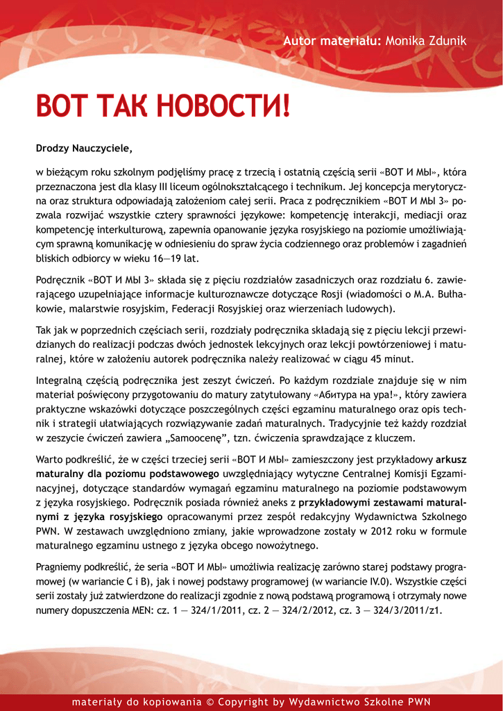 Autor materiału: Monika Zdunik ВОТ ТАК НОВОСТИ! Drodzy Nauczyciele, w bieżącym roku szkolnym podjęliśmy pracę z trzecią i ostatnią częścią serii «ВОТ И МЫ», która przeznaczona jest dla klasy III liceum ogólnokształcącego i technikum. Jej koncepcja merytoryczna oraz struktura odpowiadają założeniom całej serii. Praca z podręcznikiem «ВОТ И МЫ 3» pozwala rozwijać wszystkie cztery sprawności językowe: kompetencję interakcji, mediacji oraz kompetencję interkulturową, zapewnia opanowanie języka rosyjskiego na poziomie umożliwiającym sprawną komunikację w odniesieniu do spraw życia codziennego oraz problemów i zagadnień bliskich odbiorcy w wieku 16―19 lat. Podręcznik «ВОТ И МЫ 3» składa się z pięciu rozdziałów zasadniczych oraz rozdziału 6. zawierającego uzupełniające informacje kulturoznawcze dotyczące Rosji (wiadomości o M.A. Bułhakowie, malarstwie rosyjskim, Federacji Rosyjskiej oraz wierzeniach ludowych). Tak jak w poprzednich częściach serii, rozdziały podręcznika składają się z pięciu lekcji przewidzianych do realizacji podczas dwóch jednostek lekcyjnych oraz lekcji powtórzeniowej i maturalnej, które w założeniu autorek podręcznika należy realizować w ciągu 45 minut. Integralną częścią podręcznika jest zeszyt ćwiczeń. Po każdym rozdziale znajduje się w nim materiał poświęcony przygotowaniu do matury zatytułowany «Абитура на ура!», który zawiera praktyczne wskazówki dotyczące poszczególnych części egzaminu maturalnego oraz opis technik i strategii ułatwiających rozwiązywanie zadań maturalnych. Tradycyjnie też każdy rozdział w zeszycie ćwiczeń zawiera „Samoocenę”, tzn. ćwiczenia sprawdzające z kluczem. Warto podkreślić, że w części trzeciej serii «ВОТ И МЫ» zamieszczony jest przykładowy arkusz maturalny dla poziomu podstawowego uwzględniający wytyczne Centralnej Komisji Egzaminacyjnej, dotyczące standardów wymagań egzaminu maturalnego na poziomie podstawowym z języka rosyjskiego. Podręcznik posiada również aneks z przykładowymi zestawami maturalnymi z języka rosyjskiego opracowanymi przez zespół redakcyjny Wydawnictwa Szkolnego PWN. W zestawach uwzględniono zmiany, jakie wprowadzone zostały w 2012 roku w formule maturalnego egzaminu ustnego z języka obcego nowożytnego. Pragniemy podkreślić, że seria «ВОТ И МЫ» umożliwia realizację zarówno starej podstawy programowej (w wariancie C i B), jak i nowej podstawy programowej (w wariancie IV.0). Wszystkie części serii zostały już zatwierdzone do realizacji zgodnie z nową podstawą programową i otrzymały nowe numery dopuszczenia MEN: cz. 1 ― 324/1/2011, cz. 2 ― 324/2/2012, cz. 3 ― 324/3/2011/z1. materiały do kopiowania © Copyright by Wydawnictwo Szkolne PWN Autor materiału: Monika Zdunik Realizując rozdział pierwszy «Вот и мы 3», uczniowie przypomną sobie nazwy produktów spożywczych i nauczą się udzielać rad dotyczących zdrowego stylu życia. Poznają też tradycje i obrzędy związane ze ślubem prawosławnym oraz będą mogli porównać polskie i rosyjskie zwyczaje związane z uroczystościami i świętami rodzinnymi. W rozdziale 1. wprowadzone zostanie również słownictwo związane ze sposobami spędzania czasu wolnego oraz uczestnictwem w kulturze (kino, teatr, środki masowego przekazu). W dzisiejszej porcji materiałów dodatkowych znajdą Państwo ćwiczenia utrwalające i wzbogacające słownictwo z zakresu żywienia (piramida żywieniowa) i zdrowego stylu życia oraz leksykę dotyczącą kina i teatru. Nie zabrakło ćwiczeń gramatycznych polegających na uzupełnianiu zdań odpowiednimi formami słów podanych w nawiasach i zastosowaniu konstrukcji друг друга. Zamieściliśmy także ćwiczenia rozwijające umiejętność rozumienia tekstu czytanego. Do tekstów na temat zdrowego stylu życia oraz negatywnego wpływu mass mediów na młodzież zaproponowaliśmy zadania polegające na wyszukiwaniu i wyselekcjonowaniu informacji (zadania zamknięte na dobieranie i zadania typu prawda / fałsz). Wśród ćwiczeń znalazły się też mapy skojarzeń, które można wykorzystać, wykonując zadanie 5 ze str. 9 w podręczniku. Zgodnie z poleceniem tego ćwiczenia uczniowie muszą skonstruować odpowiedzi na pytania związane z fotografią przedstawiającą ślub, a dotyczące przeżyć nowożeńców oraz własnych przemyśleń na temat rozumienia pojęcia współczesnego związku partnerskiego. Życzymy Państwu przyjemnej i efektywnej pracy z częścią 3. serii «ВОТ И МЫ». Mamy nadzieję, że zaproponowane przez nas materiały dodatkowe okażą się w niej pomocne. materiały do kopiowania © Copyright by Wydawnictwo Szkolne PWN Autor materiału: Monika Zdunik ВОТ ТАК НОВОСТИ! ĆWICZENIA DOTYCZĄCE ZAKRESU MATERIAŁU ZAWARTEGO W ROZDZIALE 1. ― utrwalenie oraz wzbogacenie słownictwa dotyczącego: ✓ odżywiania i zdrowego stylu życia ✓ uroczystości oraz świąt rodzinnych ✓ określania i charakteryzowania pojęć związanych z kinem i teatrem (GATUNKI); ― kształtowanie umiejętności tworzenia wypowiedzi ustnych z wykorzystaniem podanego słownictwa; ― kształtowanie umiejętności rozumienia tekstu czytanego Poziom: podstawowy Wiek uczniów: 18 lat ― III klasa liceum ogólnokształcącego i technikum Cele główne: •powtórzenie i utrwalenie oraz wzbogacenie słownictwa związanego z odżywianiem i zdrowym stylem życia •powtórzenie i utrwalenie oraz wzbogacenie słownictwa związanego z uroczystościami i świętami rodzinnymi •powtórzenie i utrwalenie oraz wzbogacenie słownictwa związanego z kinem i teatrem •powtórzenie i utrwalenie oraz wzbogacenie słownictwa związanego z mass mediami •rozwijanie umiejętności rozumienia tekstu czytanego •kształtowanie umiejętności wyszukiwania i selekcjonowania informacji •utrwalenie umiejętności charakte