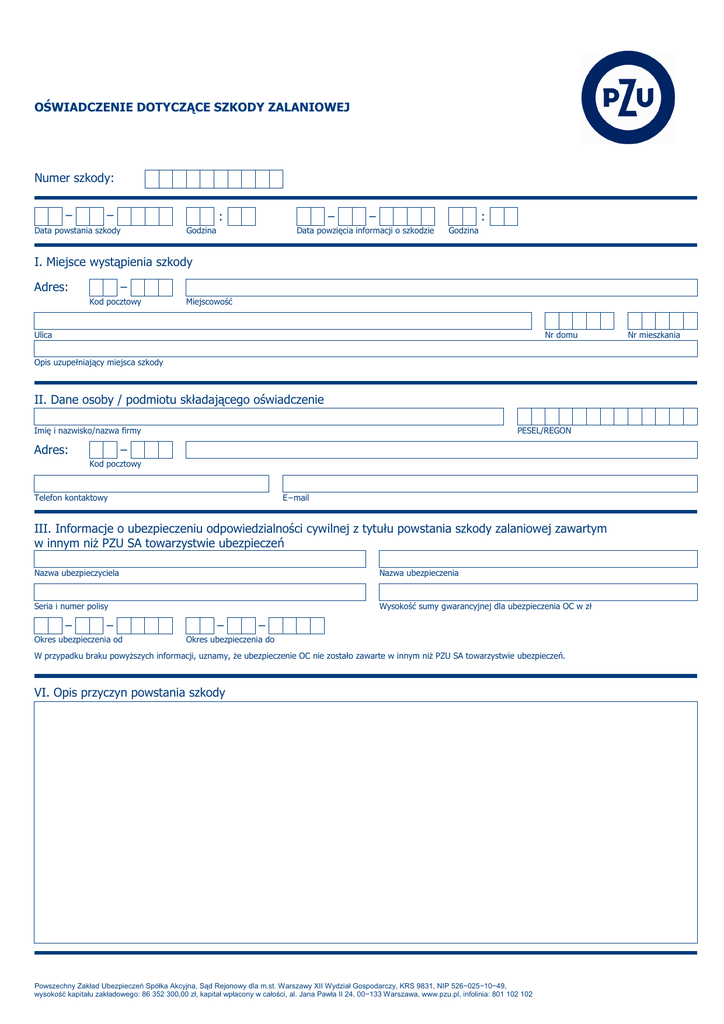 OŚWIADCZENIE DOTYCZĄCE SZKODY ZALANIOWEJ Numer szkody: − − : Data powstania szkody − Godzina − : Data powzięcia informacji o szkodzie Godzina I. Miejsce wystąpienia szkody Adres: − Kod pocztowy Miejscowość Ulica Nr domu Nr mieszkania Opis uzupełniający miejsca szkody II. Dane osoby / podmiotu składającego oświadczenie Imię i nazwisko/nazwa firmy Adres: PESEL/REGON − Kod pocztowy Telefon kontaktowy E−mail III. Informacje o ubezpieczeniu odpowiedzialności cywilnej z tytułu powstania szkody zalaniowej zawartym w innym niŜ PZU SA towarzystwie ubezpieczeń Nazwa ubezpieczyciela Nazwa ubezpieczenia Seria i numer polisy Wysokość sumy gwarancyjnej dla ubezpieczenia OC w zł − − Okres ubezpieczenia od − − Okres ubezpieczenia do W przypadku braku powyŜszych informacji, uznamy, Ŝe ubezpieczenie OC nie zostało zawarte w innym niŜ PZU SA towarzystwie ubezpieczeń. VI. Opis przyczyn powstania szkody Powszechny Zakład Ubezpieczeń Spółka Akcyjna, Sąd Rejonowy dla m.st. Warszawy XII Wydział Gospodarczy, KRS 9831, NIP 526−025−10−49, wysokość kapitału zakładowego: 86 352 300,00 zł, kapitał wpłacony w całości, al. Jana Pawła II 24, 00−133 Warszawa, www.pzu.pl, infolinia: 801 102 102 1/2 V. Opis miejsca szkody i mienia, które uległo uszkodzeniu/zniszczeniu u osoby składającej oświadczenie i u osoby poszkodowanej VI. Powiadomienia o szkodzie O szkodzie powiadomiono** 1. Administratora budynku tak nie tak nie Nazwa i adres administratora budynku 2. Inną instytucję Nazwa i adres instytucji VII. Świadkowie zdarzenia 1. Świadek Adres: − Kod pocztowy Miejscowość Ulica Nr domu Nr lokalu Nr domu Nr lokalu Telefon kontaktowy 2. Świadek Adres: − Kod pocztowy Miejscowość Ulica Telefon kontaktowy − Miejscowość Data − Czytelny podpis osoby składającej oświadczenie Informujemy, Ŝe administratorem Pani/Pana danych osobowych jest PZU SA z siedzibą 00−133 Warszawa, al. Jana Pawła II 24. Celem przetwarzania danych osobowych jest wykonywanie umowy ubezpieczenia. Ma Pani/Pan prawo dostępu do treści swoich danych osobowych i ich poprawiania. * niepotrzebne skreślić ** wstawić znak X we właściwe pole Powszechny Zakład Ubezpieczeń Spółka Akcyjna, Sąd Rejonowy dla m.st. Warszawy XII Wydział Gospodarczy, KRS 9831, NIP 526−025−10−49, wysokość kapitału zakładowego: 86 352 300,00 zł, kapitał wpłacony w całości, al. Jana Pawła II 24, 00−133 Warszawa, www.pzu.pl, infolinia: 801 102 102 2/2