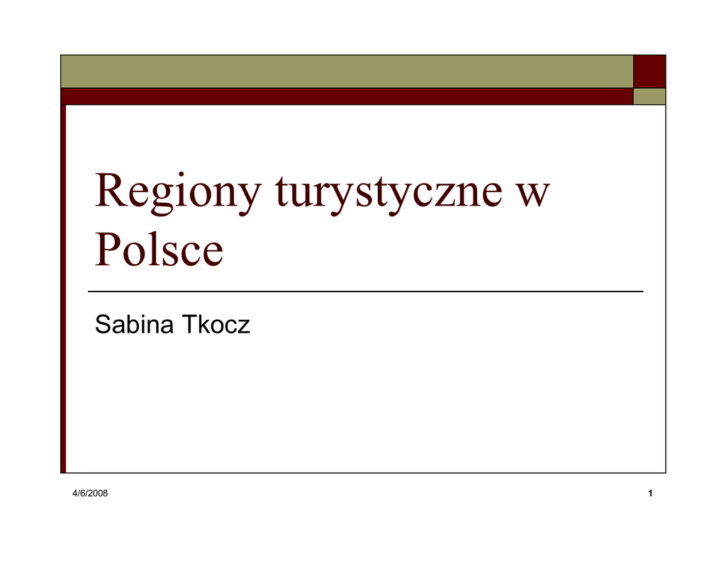 Regiony turystyczne w Polsce Sabina Tkocz 4/6/2008 1 Region Warmińsko-Mazurski o o o o o Makroregion Warmia i Mazury obejmuje (region) województwo warmińsko-mazurskie, Leży w północno-wschodniej części Polski, Stolicą regionu jest Olsztyn, Wzgórza Szeskie, część Pobrzeża Gdańskiego (Żuław Wiślanych), Granica z Rosją – Obwodem Kalingradzkim, n o o o o Przejścia graniczne – Gronowo, Bezledy, Gołdap, Region słabo zaludniony i uprzemysłowiony, W 1233 r. sprowadzony Zakon Krzyżacki, Niski poziom degradacji środowiska naturalnego, Rzeźba polodowcowa, 4/6/2008 2 Region Warmińsko-Mazurski o Obejmuje Krainę Wielkich Jezior Mazurskich – największy region pojezierny w Polsce, n n n n n n n n n 4/6/2008 Region turystyczno rekreacyjny, Szlaki żeglarskie, kajakowe, Miejsce łyżwiarstwa, bojlerów, Największe jeziora Polski – Śniardwy, Mamry, Najgłębsze jezioro Polski – Hańcza, Najdłuższe jezioro Polski – Jeziorak, Jeziora połączone kanałami, Szlaki żeglugi pasażerskiej – Giżycko-Węgorzewo, Trasy żeglugowe – ok. 200 km, 3 Region Warmińsko-Mazurski o Kanał Elbląsko – Ostródzki n n n o o o o o Funkcjonuje od 1860 r., 159 km długości, Oryginalne urządzenia – pochylnie, śluzy, Rezerwat krajobrazowy „Kurtynia” – jezioro Kurtyńskie i odcinek rzeki Kurtyni, Chronione ostoje ptactwa wodnego (rezerwat ornitologiczny na wyspach j. Mamry), Mazurski Park Krajobrazowy (rezerwat Łuknajno – międzynarodowy rezerwat biosfery), Rozległe kompleksy leśne, Szelskie Wzgórza – „Wędrówki Północy”, 4/6/2008 4 Region Warmińsko-Mazurski o o o o Nagromadzenie zabytków kultury materialnej Mazurów, Żywe tradycje folkloru Mazurów, Dość krótki sezon turystyczny, Pole Grunwaldzkie n n n n 4/6/2008 Miejsce historyczne, Zwycięska bitwa z Krzyżakami w 1410 r., Mapa plastyczna i trzyczęściowy pomnik (granitowy obelisk z rzeźbami głów rycerzy, figury mieczów, krzyż grunwaldzki), Muzeum Grunwaldzkie (wykopaliska archeologiczne, wystawa „Bitwa Grunwaldzka”), 5 Region Warmińsko-Mazurski o Elbląg n n n n o Kościół św. Mikołaja, Fragment murów obronnych z Bramą Targową, Kanał Elbląski (unikat w skali Europy), Możliwość przepłynięcia do Krynicy Morskiej, Kadyny n n 4/6/2008 najgrubszy i jeden z najstarszych (ok.. 700 lat) dębów w Polsce – „Dąb Jana Bażyńskiego”, Imponujący zespół pałacowy z XVII w., (dziś hotel), 6 Region Warmińsko-Mazurski o Frombork n n W pobliżu Zalewu Wiślanego, Związane z Mikołajem Kopernikiem, o n Warowny zespół klasztorny na wzgórzu o n n o Tu napisane dzieło „o obrotach sfer niebieskich”, Planetarium w wieży, Muzeum Kopernika – w dawnym pałacu biskupów, Katedra Wniebowzięcia NMP – grób Kopernika, Tolkmicko n n 4/6/2008 Kościół św. Jakuba Apostoła z XIV w., Wokół miasta umocnienia ziemne – tzw. Wały Tolkmickie, 7 Region Warmińsko-Mazurski o Braniewo n n o Pasłęka n n o Kościół Świętego Krzyża z XVIII w., Na szlaku Kopernika, założony w XIII w. przez Krzyżaków, Gotycki kościół parafialny św. Bartłomieja – barokowy ołtarz z XVII w., Pieniężno n n n n 4/6/2008 Fragment murów obronnych, Pozostałości zamku biskupów warmińskich z XIV w., Klasztor Werbistów (muzeum etnograficzne), Na szlaku Kopernika, 8 Region Warmińsko-Mazurski o Orneta n n n n o Kościół św. Jana Chrzciciela i Jana Ewangelisty, Gotycki ratusz z 1 poł. XIV w. (dzwon z 1384 r.), Kamienice z XVII i XVIII w., Fragment murów obronnych, Lidzbark Warmiński n n n n n 4/6/2008 Położony nad Łyną, Zwany „perłą Warmii”, Odnaleziono tu kronikę Galla Anonima, Gotycki zamek obronny biskupów warmińskich z XIV w. z arkadowym krużgankiem (na wzór Wawelu), Leży na szlaku Kopernika, 9 Region Warmińsko-Mazurski o Olsztyn n n n n Miasto wojewódzkie, Ośrodek przemysłowy, naukowy, kulturalny, Wysoka Brama z XIV w., Gotycki zamek obronny nad rz. Łyną o o n n 4/6/2008 Obecnie Muzeum Warmii i Mazur, Mikołaj Kopernik – jako administrator dóbr biskupich, Barokowy ratusz z XVII w., Planetarium Lotów Kosmicznych (1973 r.), 10 Region Warmińsko-Mazurski o Gietrzwałd n n o Późnogotycki kościół, Ośrodek turystyki pielgrzymkowej, Barczewo n n n 4/6/2008 Halowy, gotycki kościół parafialny św. Anny z XIV w., Renesansowy nagrobek ks. Kardynała A. Batorego (brata króla Stefana Batorego) – kościół św. Kościół św. Andrzeja z XIV w., Muzuem Feliksa Nowowiejskiego – kompozytora, 11 Region Warmińsko-Mazurski o Dobre Miasto n n o Mrągowo n n o Międzynarodowy Festiwal „Piknik Country”, Ratusz z XIX w. – Muzeum Ziemi Mrągowskiej, Olsztynek n o Nad Łyną, Zespół kolegiacki z XIV w., Skansen budownictwa regionalnego Warmii i Mazur, Szczytno n n 4/6/2008 Ruiny zamku krzyżackiego, Zachowana „Wieża Juranda” 12 Region Warmińsko-Mazurski o Święta Lipka n Bazylika XVII/ XVIII w. o o n o Miejsce pielgrzymkowe, Reszel n n n o barokowe organy z 1712 r. – ruchome figurki; zabytek techniki, Barokowa kuta krata bramy, Gotycki zamek z XIV w., Galeria Sztuki - tablica pamiątkowa dla W. Pola, 2 gotyckie mosty – jedne z najstarszych w Polsce, Węgorzewo n n 4/6/2008 Zamek krzyżacki z XIV w., Muzeum Kultury Ludowej – zabytkowa kamienica z XIX w., 13 Region Warmińsko-Mazurski o Giżycko n n n n n n n o Między jeziorami Kisajno i Mamry, Letnisko od XIX w., Ośrodek sportów wodnych i zimowych, Fragment krzyżackiego zamku, most zwodzony, Twierdza Boyen – 100 ha, „Shanty” – festiwal piosenki żeglarskiej i morskiej w amfiteatrze, Muzeum przyrodnicze, Pozezdrze – ruiny kwatery polowej Himmlera, 4/6/2008 14 Region Warmińsko-Mazurski o Kętrzyn n n n n o Gierłoż n o Zamek krzyżacki z XVI w., Mury obronne z Basztą Niedźwiedzią Gotycki kościół – warownia św. Jerzego, Zabytkowe kamienice z XIX i XX w., Ruiny „Wilczego Szańca” – dawnej kwatery Adolfa Hitlera i Naczelnego Dowództwa Niemieckich Sił Zbrojnyc