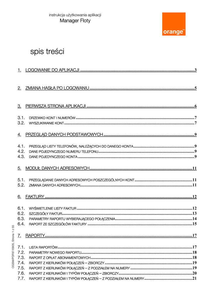 instrukcja użytkowania aplikacji Manager Floty spis treści 1. LOGOWANIE DO APLIKACJI ...........................................................................................................3 2. ZMIANA HASŁA PO LOGOWANIU ..................................................................................................5 3. PIERWSZA STRONA APLIKACJI .....................................................................................................6 3.1. 3.2. 4. 4.1. 4.2. 4.3. 5. 5.1. 5.2. OGSM/PDF87/0905, Strona 1 z 55 6. 6.1. 6.2. 6.3. 6.4. 7. 7.1. 7.2. 7.3. 7.4. 7.5. 7.6. 7.7. DRZEWKO KONT I NUMERÓW ...............................................................................................................7 WYSZUKIWANIE KONT ..........................................................................................................................7 PRZEGLĄD DANYCH PODSTAWOWYCH .....................................................................................9 PRZEGLĄD LISTY TELEFONÓW, NALEŻĄCYCH DO DANEGO KONTA .........................................................9 DANE POJEDYNCZEGO NUMERU TELEFONU ..........................................................................................9 DANE POJEDYNCZEGO KONTA .............................................................................................................9 MODUŁ DANYCH ADRESOWYCH................................................................................................11 PRZEGLĄDANIE DANYCH ADRESOWYCH POSZCZEGÓLNYCH KONT ......................................................11 ZMIANA DANYCH ADRESOWYCH.........................................................................................................11 FAKTURY ..........................................................................................................................................12 WYŚWIETLENIE LISTY FAKTUR ............................................................................................................12 SZCZEGÓŁY FAKTUR..........................................................................................................................13 PARAMETRY RAPORTU WYBIERAJĄCEGO POŁĄCZENIA ........................................................................14 RAPORT ZE SZCZEGÓŁÓW FAKTURY ..................................................................................................15 RAPORTY..........................................................................................................................................17 LISTA RAPORTÓW ..............................................................................................................................17 PARAMETRY NOWEGO RAPORTU........................................................................................................18 RAPORT Z OPŁAT ABONAMENTOWYCH ...............................................................................................18 RAPORT Z KIERUNKÓW POŁĄCZEŃ – ZBIORCZY ..................................................................................19 RAPORT Z KIERUNKÓW POŁĄCZEŃ – Z PODZIAŁEM NA NUMERY ..........................................................19 RAPORT Z KIERUNKÓW I TYPÓW POŁĄCZEŃ – ZBIORCZY.....................................................................20 RAPORT Z KIERUNKÓW I TYPÓW POŁĄCZEŃ – Z PODZIAŁEM NA NUMERY .............................................21 7.8. 7.9. 7.10. 7.11. 7.12. 8. RAPORT Z BIEŻĄCEGO UŻYCIA ...........................................................................................................24 RAPORT Z PLANÓW TARYFOWYCH ...................................................................................................24 RAPORT ZE SZCZEGÓŁÓW FAKTURY ................................................................................................26 RAPORT Z OPŁAT ABONAMENTOWYCH.............................................................................................26 USŁUGI..............................................................................................................................................28 8.1. 8.2. 8.3. 8.4. 8.5. 8.6. 8.7. 8.8. 8.9. 8.10. 9. RAPORT WYBIERAJĄCY POŁĄCZENIA ..................................................................................................22 WYŚWIETLENIE LISTY USŁUG (OPERACJE POJEDYNCZE)......................................................................28 SZCZEGÓŁY USŁUGI – OPERACJE POJEDYNCZE .................................................................................29 AKTYWACJA, MODYFIKACJA I DEAKTYWACJA – OPERACJE POJEDYNCZE.............................................30 WYŚWIETLENIE LISTY USŁUG (OPERACJE MASOWE) ............................................................................30 WYŚWIETLENIE HISTORII ZLECEŃ ........................................................................................................31 WYŚWIETLENIE SZCZEGÓŁÓW ZLECENIA ............................................................................................33 DOKONYWANIE OPERACJI NA USŁUDZE ..............................................................................................33 AKTYWACJA, DEAKTYWACJA I MODYFIKACJA USŁUGI APN.................................................................35 ZARZĄDZANIE USŁUGĄ BIZNES GRUPA ..............................................................................................36 ZARZĄDZANIE USŁUGAMI KONTA......................................................................................................40 ZAMÓWIENIA ...................................................................................................................................42 9.1. PRZEGLĄDANIE I DRUKOWANIE ZŁOŻONEGO ZAMÓWIENIA...................................................................44 10. POCZTA ......................................................................................................