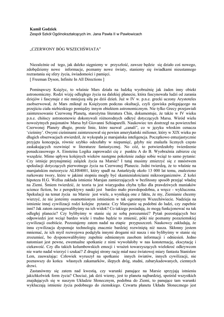 Kamil Godziek Zespół Szkół Ogólnokształcących im. Jana Pawła II w Pawłowicach „CZERWONY BÓG WSZECHŚWIATA” Niezależnie od tego, jak daleko sięgniemy w przyszłość, zawsze będzie się działo coś nowego, zdobędziemy nowe informacje, poznamy nowe światy, staniemy się świadkami nieustannego rozrastania się sfery życia, świadomości i pamięci. [ Freeman Dyson, Infinite In All Directions ] Pominąwszy Księżyc, to właśnie Mars działa na ludzką wyobraźnię jak żaden inny obiekt astronomiczny. Rodzi wizję odległego życia na dalekiej planecie, która fascynowała ludzi od zarania dziejów i fascynuje z nie mniejszą siłą po dziś dzień. Już w IV w. p.n.e. grecki uczony Arystoteles zaobserwował, że Mars zniknął za Księżycem podczas okultacji, czyli zjawiska polegającego na przejściu ciała niebieskiego pomiędzy innym obiektem astronomicznym. Nie tylko Grecy przejawiali zainteresowanie Czerwoną Planetą, starożytna literatura Chin, dokumentuje, że także w IV wieku p.n.e. chińscy astronomowie dokonywali różnorodnych odkryć dotyczących Marsa. Wśród wielu nowożytnych pasjonatów Marsa był Giovanni Schiaparelli. Naukowiec ten dostrzegł na powierzchni Czerwonej Planety długie, proste linie, które nazwał „canali”, co w języku włoskim oznacza ‘cieśniny’. Owymi cieśninami zainteresował się pewien amerykański milioner, który w XIX wieku po długich obserwacjach stwierdził, że wykopała je marsjańska inteligencja. Początkowo entuzjastycznie przyjęta koncepcja, równie szybko odeszłaby w niepamięć, gdyby nie znalazła licznych często zaskakujących rozwinięć w literaturze fantastycznej. No cóż, to potwierdzałoby twierdzenie ponadczasowego A. Einsteina Logika zaprowadzi cię z punktu A do B. Wyobraźnia zabierze cię wszędzie. Mimo upływu kolejnych wieków następne pokolenie zadaje sobie wciąż to samo pytanie: Czy istnieje przynajmniej zalążek życia na Marsie? I tutaj musimy zmierzyć się z mnóstwem spekulacji dotyczących pierwotnego życia na Czerwonej Planecie. Jedni twierdzą, że to właśnie na marsjańskim meteorycie ALH84001, który spadł na Antarktydę około 13 000 lat temu, znaleziono rurkowate twory, które w jakimś stopniu mogły być skamieniałościami mikroorganizmów. Z kolei hipoteza H.G. Wellsa zakłada istnienie Marsjan zamierzających w bezlitosny sposób przejąć władzę na Ziemi. Śmiem twierdzić, że teoria ta jest wiarygodna chyba tylko dla prawdziwych maniaków science fiction, bo z perspektywy nauki jest bardzo mało prawdopodobna, a wręcz - wykluczona. Spekulacji na temat życia na Marsie jest wiele, a wynikają one z faktu, że my, Ziemianie chcemy wierzyć, że nie jesteśmy osamotnionym istnieniem w tak ogromnym Wszechświecie. Nadzieja na istnienie innej cywilizacji rodzi kolejne pytania: Czy Marsjanie są podobni do ludzi, czy zupełnie inni? Jak zatem zareagowalibyśmy na ich widok? Co takiego posiadają, że mogą funkcjonować na tak odległej planecie? Czy bylibyśmy w stanie się ze sobą porozumieć? Pytań pozostających bez odpowiedzi jest wciąż bardzo wiele i trudno będzie to zmienić, póki nie poznamy pozaziemskiej cywilizacji osobiście. Pozostajemy zatem nadal na etapie przypuszczeń. Naukowcy zakładają, że inna cywilizacja dysponuje technologią znacznie bardziej rozwiniętą niż nasza. Skłonny jestem mniemać, że ich myśl rozwojowa podążyła innymi drogami niż nasza i nie bylibyśmy w stanie się zrozumieć, bo dysponowalibyśmy zupełnie odmiennym zasobem informacji i odniesień. Jedno natomiast jest pewne, ewentualne spotkanie z nimi wywołałoby w nas konsternację, ekscytację i ciekawość. Czy dla takich kolumbowskich emocji i wrażeń towarzyszących wielokroć odkrywcom nie warto nadal wierzyć i szukać? Z drugiej strony rację miał nasz światowej miary fantasta Stanisław Lem, zauważając: Człowiek wyruszył na spotkanie innych światów, innych cywilizacji, nie poznawszy do końca własnych zakamarków, ślepych dróg, studni, zabarykadowanych, ciemnych drzwi. Zastanówmy się zatem nad kwestią, czy warunki panujące na Marsie sprzyjają istnieniu jakichkolwiek form życia? Chociaż, jak dziś wiemy, jest to planeta najbardziej, spośród wszystkich znajdujących się w naszym Układzie Słonecznym, podobna do Ziemi, to panujące tam warunki wykluczają istnienie życia podobnego do ziemskiego. Czwarta planeta Układu Słonecznego jest prawie dwa razy mniejsza od Ziemi, jej średnica wynosi 6794 km, a masa 11% masy Ziemi, co sprawia, że jej gęstość jest mniejsza niż gęstość naszej planety. Mars charakteryzuje się ciekawą, zróżnicowaną budową. W dużym stopniu pokryty jest zamarzniętą, kamienistą pustynią składającą się głównie z krzemionki i bazaltu. Tlenek żelaza zabarwia jego powierzchnię i atmosferę na charakterystyczny czerwony kolor. Z pewnością takich malowniczych czerwono rudych krajobrazów nie zobaczymy nigdzie indziej! Na jego powierzchni można znaleźć wulkany, kaniony i kratery- są to prawdziwe olbrzymy, w porównaniu do ich ziemskich odpowiedników. Co do tych ostatnich naukowcy przypuszczają, że powstały głównie w wyniku Wielkiego Bombardowania Meteorytowego ponad 3,8 mld lat temu. Teorię bombardowania potwierdza fakt, że około 60% powierzchni Marsa tworzą wyżyny ulokowane głównie w jego południowej części, co ciekawe najdłuższa z nich rozciąga się na 8000 km, natomiast w północnej części znajdują się liczne rozległe niziny pokryte lawą. Przyjdzie nam zatem podzielić wrażenia i refleksje bohatera książki Antoine’a de SaintExupery’ego odbywającego międzyplanetarną podróż: Co za śmieszna planeta- pomyślał Mały Książę- cała sucha, zupełnie spiczasta i do tego słona. To niezwykle trudne i wymagające ukształtowanie terenu dla ludzkich form istnienia. A to nie jedyny problem, z jakim przyjdzie się zmierzyć! Znacznie poważniejszy