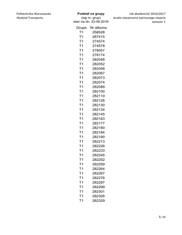 Politechnika Warszawska Wydział Transportu Podział na grupy (wg nr. grup) stan na dn. 23.09.2016 rok akademicki 2016/2017 studia stacjonarne pierwszego stopnia semestr 1 Grupa Nr albumu T1 258528 T1 267415 T1 274574 T1 274578 T1 278057 T1 278174 T1 282048 T1 282052 T1 282058 T1 282067 T1 282073 T1 282074 T1 282089 T1 282100 T1 282110 T1 282126 T1 282130 T1 282134 T1 282145 T1 282163 T1 282177 T1 282180 T1 282184 T1 282190 T1 282213 T1 282226 T1 282233 T1 282245 T1 282252 T1 282259 T1 282264 T1 282267 T1 282276 T1 282297 T1 282299 T1 282301 T1 282305 T1 282329 1/ 10 Politechnika Warszawska Wydział Transportu Podział na grupy (wg nr. grup) stan na dn. 23.09.2016 rok akademicki 2016/2017 studia stacjonarne pierwszego stopnia semestr 1 Grupa Nr albumu T2 268174 T2 274600 T2 274610 T2 274619 T2 274683 T2 282056 T2 282062 T2 282068 T2 282071 T2 282079 T2 282084 T2 282098 T2 282104 T2 282132 T2 282136 T2 282146 T2 282152 T2 282153 T2 282166 T2 282171 T2 282173 T2 282201 T2 282205 T2 282217 T2 282239 T2 282244 T2 282247 T2 282266 T2 282269 T2 282280 T2 282292 T2 282304 T2 282307 T2 282308 T2 282335 2/ 10 Politechnika Warszawska Wydział Transportu Podział na grupy (wg nr. grup) stan na dn. 23.09.2016 rok akademicki 2016/2017 studia stacjonarne pierwszego stopnia semestr 1 Grupa Nr albumu T3 228793 T3 242920 T3 251743 T3 258090 T3 267671 T3 270454 T3 274464 T3 274581 T3 274669 T3 274892 T3 282044 T3 282045 T3 282053 T3 282064 T3 282072 T3 282087 T3 282090 T3 282109 T3 282135 T3 282151 T3 282156 T3 282175 T3 282183 T3 282218 T3 282222 T3 282224 T3 282240 T3 282260 T3 282270 T3 282283 T3 282289 T3 282291 T3 282315 T3 282318 T3 282320 T3 282325 T3 282328 3/ 10 Politechnika Warszawska Wydział Transportu Podział na grupy (wg nr. grup) stan na dn. 23.09.2016 rok akademicki 2016/2017 studia stacjonarne pierwszego stopnia semestr 1 Grupa Nr albumu T4 221391 T4 244737 T4 266753 T4 266846 T4 274602 T4 274694 T4 275465 T4 275943 T4 276013 T4 277772 T4 282057 T4 282069 T4 282076 T4 282077 T4 282080 T4 282092 T4 282120 T4 282123 T4 282140 T4 282149 T4 282150 T4 282157 T4 282161 T4 282168 T4 282174 T4 282181 T4 282202 T4 282228 T4 282232 T4 282255 T4 282257 T4 282268 T4 282271 T4 282281 T4 282327 T4 282333 T4 282336 4/ 10 Politechnika Warszawska Wydział Transportu Podział na grupy (wg nr. grup) stan na dn. 23.09.2016 rok akademicki 2016/2017 studia stacjonarne pierwszego stopnia semestr 1 Grupa Nr albumu T5 242710 T5 261895 T5 266689 T5 266765 T5 274651 T5 274675 T5 274686 T5 277044 T5 277474 T5 277847 T5 282043 T5 282083 T5 282116 T5 282128 T5 282154 T5 282169 T5 282182 T5 282185 T5 282186 T5 282194 T5 282204 T5 282219 T5 282220 T5 282227 T5 282234 T5 282250 T5 282265 T5 282277 T5 282296 T5 282306 T5 282311 T5 282312 T5 282313 T5 282314 T5 282321 5/ 10 Politechnika Warszawska Wydział Transportu Podział na grupy (wg nr. grup) stan na dn. 23.09.2016 rok akademicki 2016/2017 studia stacjonarne pierwszego stopnia semestr 1 Grupa Nr albumu T6 244717 T6 258126 T6 274359 T6 274711 T6 276184 T6 276626 T6 278181 T6 282051 T6 282054 T6 282055 T6 282063 T6 282129 T6 282131 T6 282133 T6 282141 T6 282142 T6 282160 T6 282167 T6 282170 T6 282176 T6 282189 T6 282193 T6 282209 T6 282211 T6 282214 T6 282221 T6 282229 T6 282236 T6 282261 T6 282272 T6 282274 T6 282275 T6 282287 T6 282303 T6 282316 6/ 10 Politechnika Warszawska Wydział Transportu Podział na grupy (wg nr. grup) stan na dn. 23.09.2016 rok akademicki 2016/2017 studia stacjonarne pierwszego stopnia semestr 1 Grupa Nr albumu T7 245403 T7 266922 T7 274733 T7 275295 T7 281370 T7 282066 T7 282070 T7 282078 T7 282085 T7 282086 T7 282094 T7 282099 T7 282101 T7 282108 T7 282113 T7 282119 T7 282122 T7 282139 T7 282164 T7 282188 T7 282197 T7 282200 T7 282206 T7 282212 T7 282216 T7 282225 T7 282230 T7 282231 T7 282235 T7 282238 T7 282241 T7 282251 T7 282253 T7 282286 T7 282290 T7 282319 T7 282337 T7 282338 7/ 10 Politechnika Warszawska Wydział Transportu Podział na grupy (wg nr. grup) stan na dn. 23.09.2016 rok akademicki 2016/2017 studia stacjonarne pierwszego stopnia semestr 1 Grupa Nr albumu T8 161731 T8 234847 T8 243381 T8 251782 T8 266998 T8 274767 T8 275300 T8 278946 T8 282082 T8 282091 T8 282097 T8 282105 T8 282106 T8 282107 T8 282111 T8 282118 T8 282124 T8 282137 T8 282144 T8 282148 T8 282155 T8 282158 T8 282159 T8 282165 T8 282178 T8 282191 T8 282196 T8 282199 T8 282208 T8 282246 T8 282249 T8 282256 T8 282258 T8 282282 T8 282324 T8 282331 T8 282332 8/ 10 Politechnika Warszawska Wydział Transportu Podział na grupy (wg nr. grup) stan na dn. 23.09.2016 rok akademicki 2016/2017 studia stacjonarne pierwszego stopnia semestr 1 Grupa Nr albumu T9 243498 T9 259221 T9 267405 T9 267631 T9 274794 T9 275485 T9 278358 T9 278584 T9 282046 T9 282047 T9 282049 T9 282061 T9 282065 T9 282075 T9 282081 T9 282093 T9 282095 T9 282096 T9 282102 T9 282117 T9 282125 T9 282127 T9 282138 T9 282162 T9 282179 T9 282187 T9 282198 T9 282203 T9 282215 T9 282242 T9 282254 T9 282262 T9 282279 T9 282284 T9 282293 T9 282295 T9 282300 T9 282317 9/ 10 Politechnika Warszawska Wydział Transportu Podział na grupy (wg nr. grup) stan na dn. 23.09.2016 rok akademicki 2016/2017 studia stacjonarne pierwszego stopnia semestr 1 Grupa Nr albumu T10 246461 T10 259931 T10 266942 T10 269072 T10 274342 T10 274800 T10 274815 T10 275325 T10 278693 T10 278926 T10 282042 T10 282050 T10 282103 T10 282112 T10 282114 T10 282121 T10 282147 T10 282172 T10 282192 T10 282195 T10 282207 T10 282210 T10 282223 T10 282237 T10 282243 T10 282263 T10 282273 T10 282278 T10 282285 T10 282294 T10 282298 T10 282302 T10 282310 T10 282322 T10 282323 T10 282326 T10 282330 10/ 10