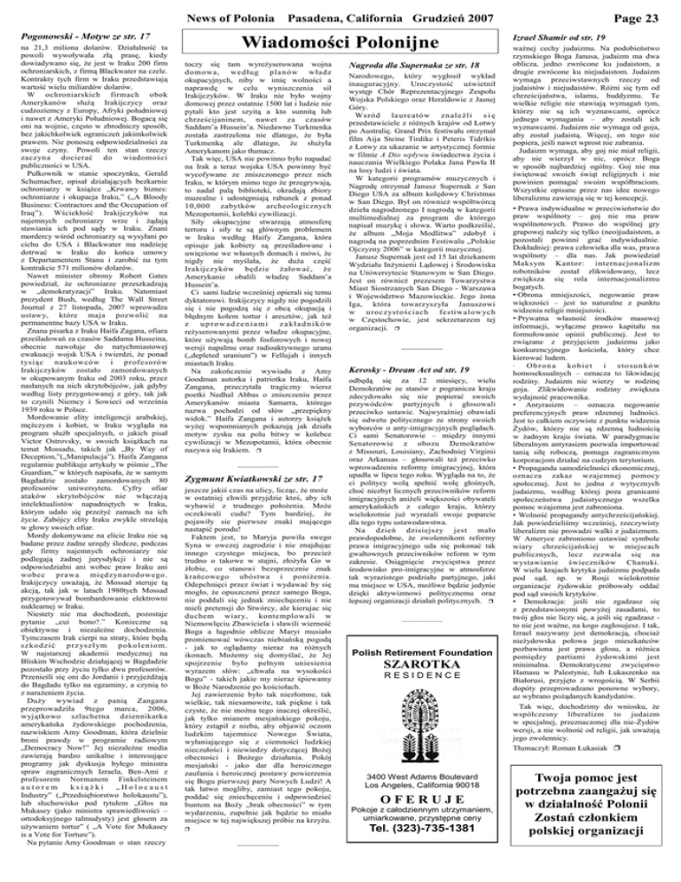 Page 23 News of Polonia Pasadena, California Grudzień 2007 Pogonowski - Motyw ze str. 17 na 21,3 miliona dolarów. Działalność ta powoli wywoływała złą prasę, kiedy dowiadywano się, że jest w Iraku 200 firm ochroniarskich, z firmą Blackwater na czele. Kontrakty tych firm w Iraku przedstawiają wartość wielu miliardów dolarów. W ochroniarskich firmach obok Amerykanów służą Irakijczycy oraz cudzoziemcy z Europy, Afryki południowej i nawet z Ameryki Południowej. Bogacą się oni na wojnie, często w zbrodniczy sposób, bez jakichkolwiek ograniczeń jakimkolwiek prawem. Nie ponoszą odpowiedzialności za swoje czyny. Powoli ten stan rzeczy zaczyna docierać do wiadomości publiczności w USA. Pułkownik w stanie spoczynku, Gerald Schumacher, opisał działających bezkarnie ochroniarzy w książce „Krwawy biznes: ochroniarze i okupacja Iraku,” („A Bloody Business: Contractors and the Occupation of Iraq”). Wściekłość Irakijczyków na najemnych ochroniarzy wrze i żądają stawiania ich pod sądy w Iraku. Znani mordercy wśród ochroniarzy są wysyłani po cichu do USA i Blackwater ma nadzieję dotrwać w Iraku do końca umowy z Departamentem Stanu i zarobić na tym kontrakcie 571 milionów dolarów. Nawet minister obrony Robert Gates powiedział, że ochroniarze przeszkadzają w „demokratyzacji” Iraku. Natomiast prezydent Bush, według The Wall Street Journal z 27 listopada, 2007 wprowadza ustawy, które maja pozwolić na permanentne bazy USA w Iraku. Znana pisarka z Iraku Haifa Zagana, ofiara prześladowań za czasów Saddama Husseina, obecnie nawołuje do natychmiastowej ewakuacji wojsk USA i twierdzi, że ponad t ysiąc naukowców i profesorów Irakijczyków zostało zamordowanych w okupowanym Iraku od 2003 roku, przez nasłanych na nich skrytobójców, jak gdyby według listy przygotowanej z góry, tak jak to czynili Niemcy i Sowieci od września 1939 roku w Polsce. Mordowanie elity inteligencji arabskiej, mężczyzn i kobiet, w Iraku wygląda na program służb specjalnych, o jakich pisał Victor Ostrovsky, w swoich książkach na temat Mossadu, takich jak „By Way of Deception,”(„Manipulacja”). Haifa Zangana regularnie publikuje artykuły w piśmie „The Guardian,” w których napisała, że w samym Bagdadzie zostało zamordowanych 80 profesorów uniwersytetu. Cyfry ofiar ataków skrytobójców nie włączają intelektualistów napadniętych w Iraku, którym udało się przeżyć zamach na ich życie. Zabójcy elity Iraku zwykle strzelają w głowy swoich ofiar. Mordy dokonywane na elicie Iraku nie są badane przez żadne urzędy śledcze, podczas gdy firmy najemnych ochroniarzy nie podlegają żadnej jurysdykcji i nie są odpowiedzialni ani wobec praw Iraku ani wobec prawa międzynarodowego. Irakijczycy uważają, że Mossad steruje tą akcją, tak jak w latach 1980tych Mossad przygotowywał bombardowanie elektrowni nuklearnej w Iraku. Niestety nie ma dochodzeń, pozostaje pytanie „cui bono?.” Konieczne są obiektywne i niezależne dochodzenia. Tymczasem Irak cierpi na straty, które będą s zko d zi ć p rz ys zł ym p o ko l en i o m. W najstarszej akademii medycznej na Bliskim Wschodzie działającej w Bagdadzie pozostało przy życiu tylko dwu profesorów. Przenieśli się oni do Jordanii i przyjeżdżają do Bagdadu tylko na egzaminy, a czynią to z narażeniem życia. Duży wywiad z panią Zangana przeprowadziła 9tego marca, 2006, wyjątkowo szlachetna dziennikarka amerykańska żydowskiego pochodzenia, nazwiskiem Amy Goodman, która dzielnie broni prawdy w programie radiowym „Democracy Now!” Jej niezależne media zawierają bardzo unikalne i interesujące programy jak dyskusja byłego ministra spraw zagranicznych Izraela, Ben-Ami z profesorem Normanem Finkelsteinem autorem książki „Holocaust Industry” („Przedsiębiorstwo holokaustu”), lub słuchowisko pod tytułem „Głos na Mukasey (jako ministra sprawiedliwości – ortodoksyjnego talmudysty) jest głosem za używaniem tortur” ( „A Vote for Mukasey is a Vote for Torture”). Na pytanie Amy Goodman o stan rzeczy Wiadomości Polonijne toczy się tam wyreżyserowana wojna domowa, według plan ów władz okupacyjnych, niby w imię wolności a naprawdę w celu wyniszczenia sił Irakijczyków. W Iraku nie było wojny domowej przez ostatnie 1500 lat i ludzie nie pytali kto jest szyitą a kto sunnitą lub chrześcijaninem, nawet za czasów Saddam’a Hussein’a. Niedawno Turkmenka została zastrzelona nie dlatego, że była Turkmenką ale dlatego, że służyła Amerykanom jako tłumacz. Tak więc, USA nie powinno było napadać na Irak a teraz wojska USA powinny być wycofywane ze zniszczonego przez nich Iraku, w którym mimo tego że przegrywają, to nadal palą biblioteki, okradają zbiory muzealne i udostępniają rabunek z ponad 10,000 zabytków archeologicznych Mezopotamii, kolebki cywilizacji. Siły okupacyjne stwarzają atmosferę terroru i siły te są głównym problemem w Iraku według Haify Zangana, która opisuje jak kobiety są prześladowane i uwięzione we własnych domach i mówi, że nigdy nie myślała, że duża część Irakijczyków będzie żałować, że Amerykanie obalili władzę Saddam’a Hussein’a. Ci sami ludzie wcześniej opierali się temu dyktatorowi. Irakijczycy nigdy nie pogodzili się i nie pogodzą się z obcą okupacją i błędnym kołem tortur i aresztów, jak też z uprowadzeniami zakładników reżyserowanymi przez władze okupacyjne, które używają bomb fosforowych i nowej wersji napalmu oraz radioaktywnego uranu („depleted uranium”) w Fellujah i innych miastach Iraku. Na zakończenie wywiadu z Amy Goodman autorka i patriotka Iraku, Haifa Zangana, przeczytała tragiczny wiersz poetki Nedhal Abbas o zniszczeniu przez Amerykanów miasta Samarra, którego nazwa pochodzi od słów „przepiękny widok.” Haifa Zangana i autorzy książek wyżej wspomnianych pokazują jak działa motyw zysku na polu bitwy w kolebce c