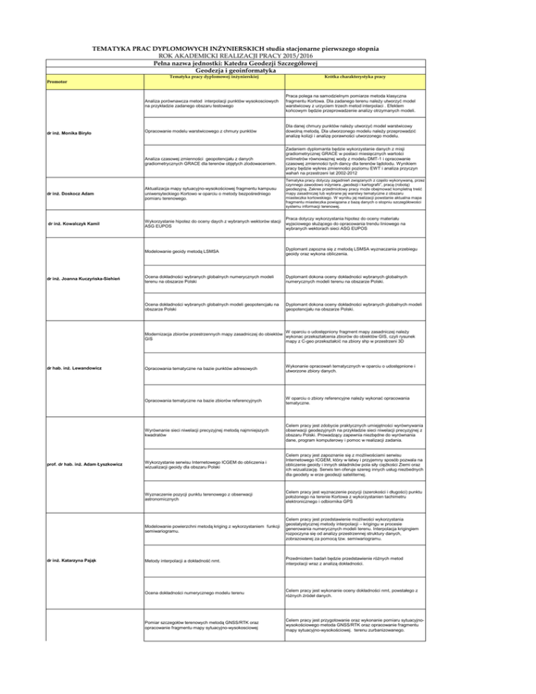 TEMATYKA PRAC DYPLOMOWYCH INŻYNIERSKICH studia stacjonarne pierwszego stopnia ROK AKADEMICKI REALIZACJI PRACY 2015/2016 Pełna nazwa jednostki: Katedra Geodezji Szczegółowej Geodezja i geoinformatyka Tematyka pracy dyplomowej inżynierskiej Krótka charakterystyka pracy Promotor Analiza porównawcza metod interpolacji punktów wysokosciowych na przykładzie zadanego obszaru testowego Praca polega na samodzielnym pomiarze metoda klasyczna fragmentu Kortowa. Dla zadanego terenu należy utworzyć model warstwicowy z urzyciem trzech metod interpolaci . Efektem końcowym będzie przeprowadzenie analizy otrzymanych modeli. Opracowanie modelu warstwicowego z chmury punktów Dla danej chmury punktów należy utworzyć model warstwicowy dowolną metodą. Dla utworzonego modelu należy przeprowadzić analizę kolizji i analizę porawności utworzonego modelu. Analiza czasowej zmienności geopotencjału z danych gradiometrycznych GRACE dla terenów objętych zlodowaceniem. Zadaniem dyplomanta będzie wykorzystanie danych z misji gradiometrycznej GRACE w postaci miesięcznych wartości milimetrów równowaznej wody z modelu DMT-1 i opracowanie czasowej zmienności tych dancy dla terenów lądolodu. Wynikiem pracy będzie wykres zmienności poziomu EWT i analiza przyczyn wahań na przestrzeni lat 2002-2012 dr inż. Doskocz Adam Aktualizacja mapy sytuacyjno-wysokościowej fragmentu kampusu uniwersyteckiego Kortowo w oparciu o metody bezpośredniego pomiaru terenowego. Tematyka pracy dotyczy zagadnień związanych z często wykonywaną, przez czynnego zawodowo inżyniera „geodezji i kartografii”, pracą (robotą) geodezyjną. Zakres przedmiotowy pracy może obejmować kompletną treść mapy zasadniczej lub wybrane jej warstwy tematyczne z obszaru miasteczka kortowskiego. W wyniku jej realizacji powstanie aktualna mapa fragmentu miasteczka powiązana z bazą danych o stopniu szczegółowości systemu informacji terenowej. dr inż. Kowalczyk Kamil Wykorzystanie hipotez do oceny daych z wybranych wektorów stacji ASG EUPOS Praca dotyczy wykorzystania hipotez do oceny materiału wyjsciowego służącego do opracowania trendu liniowego na wybranych wektorach sieci ASG EUPOS Modelowanie geoidy metodą LSMSA Dyplomant zapozna się z metodą LSMSA wyznaczania przebiegu geoidy oraz wykona obliczenia. Ocena dokładności wybranych globalnych numerycznych modeli terenu na obszarze Polski Dyplomant dokona oceny dokładności wybranych globalnych numerycznych modeli terenu na obszarze Polski. Ocena dokładności wybranych globalnych modeli geopotencjału na obszarze Polski Dyplomant dokona oceny dokładności wybranych globalnych modeli geopotencjału na obszarze Polski. dr inż. Monika Biryło dr inż. Joanna Kuczyńska-Siehień W oparciu o udostępniony fragment mapy zasadniczej należy Modernizacja zbiorów przestrzennych mapy zasadniczej do obiektów wykonac przekształcenia zbiorów do obiektów GIS, czyli rysunek GIS mapy z C-geo przekształcić na zbiory shp w przestrzeni 3D dr hab. inż. Lewandowicz prof. dr hab. inż. Adam Łyszkowicz dr inż. Katarzyna Pająk dr inż. Renata Pelc-Mieczkowska Opracowania tematyczne na bazie punktów adresowych Wykonanie opracowań tematycznych w oparciu o udostępnione i utworzone zbiory danych. Opracowania tematyczne na bazie zbiorów referencyjnych W oparciu o zbiory referencyjne należy wykonać opracowania tematyczne. Wyrównanie sieci niwelacji precyzyjnej metodą najmniejszych kwadratów Celem pracy jest zdobycie praktycznych umiejętności wyrównywania obserwacji geodezyjnych na przykładzie sieci niwelacji precyzyjnej z obszaru Polski. Prowadzący zapewnia niezbędne do wyrównania dane, program komputerowy i pomoc w realizacji zadania. Wykorzystanie serwisu Internetowego ICGEM do obliczenia i wizualizacji geoidy dla obszaru Polski Celem pracy jest zapoznanie się z możliwościami serwisu Internetowego ICGEM, który w łatwy i przyjemny sposób pozwala na obliczenie geoidy i innych składników pola siły ciężkości Ziemi oraz ich wizualizację. Serwis ten oferuje szereg innych usług niezbednych dla geodety w erze geodezji sateliternej. Wyznaczenie pozycji punktu terenowego z obserwacji astronomicznych Celem pracy jest wyznaczenie pozycji (szerokości i długości) punktu położonego na terenie Kortowa z wykorzystanien tachimetru elektronicznego i odbiornika GPS Modelowanie powierzchni metodą kriging z wykorzystaniem funkcji semiwariogramu. Celem pracy jest przedstawienie możliwości wykorzystania geostatystycznej metody interpolacji – krigingu w procesie generowania numerycznych modeli terenu. Interpolacja krigingiem rozpoczyna się od analizy przestrzennej struktury danych, zobrazowanej za pomocą tzw. semiwariogramu. Metody interpolacji a dokładność nmt. Przedmiotem badań będzie przedstawienie różnych metod interpolacji wraz z analizą dokładności. Ocena dokładności numerycznego modelu terenu Celem pracy jest wykonanie oceny dokładności nmt, powstałego z różnych źródeł danych. Pomiar szczegołów terenowych metodą GNSS/RTK oraz opracowanie fragmentu mapy sytuacyjno-wysokosciowej Celem pracy jest przygotowanie oraz wykonanie pomiaru sytuacyjnowysokościowego metoda GNSS/RTK oraz opracowanie fragmentu mapy sytuacyjno-wysokościowej. terenu zurbanizowanego. dr inż. Renata Pelc-Mieczkowska Inwentaryzacja zasłon terenowych na punktach osnowy geodezyjnej metodą pomiarów bezpośrednich. Charakterystyka ilościowa i jakościowa zasłon terenowych wstępujących na punktach pomiarowych jest istotnym zagadnieniem ze względu na rosnącą popularność stosowania technik GNSS w pomiarach geodezyjnych. Celem pracy będzie zinwentaryzowanie zasłon terenowych występujących na punktach osnowy zlokalizowanych na terenie Kortowa. Opracowane model będą mogły być wykorzystane między innymi do efektywnego planowania sesji pomiarowych GNSS. Ocena przydatności szerokokątnych obiektywów fotograficznych do inwentaryzacji zason tereni