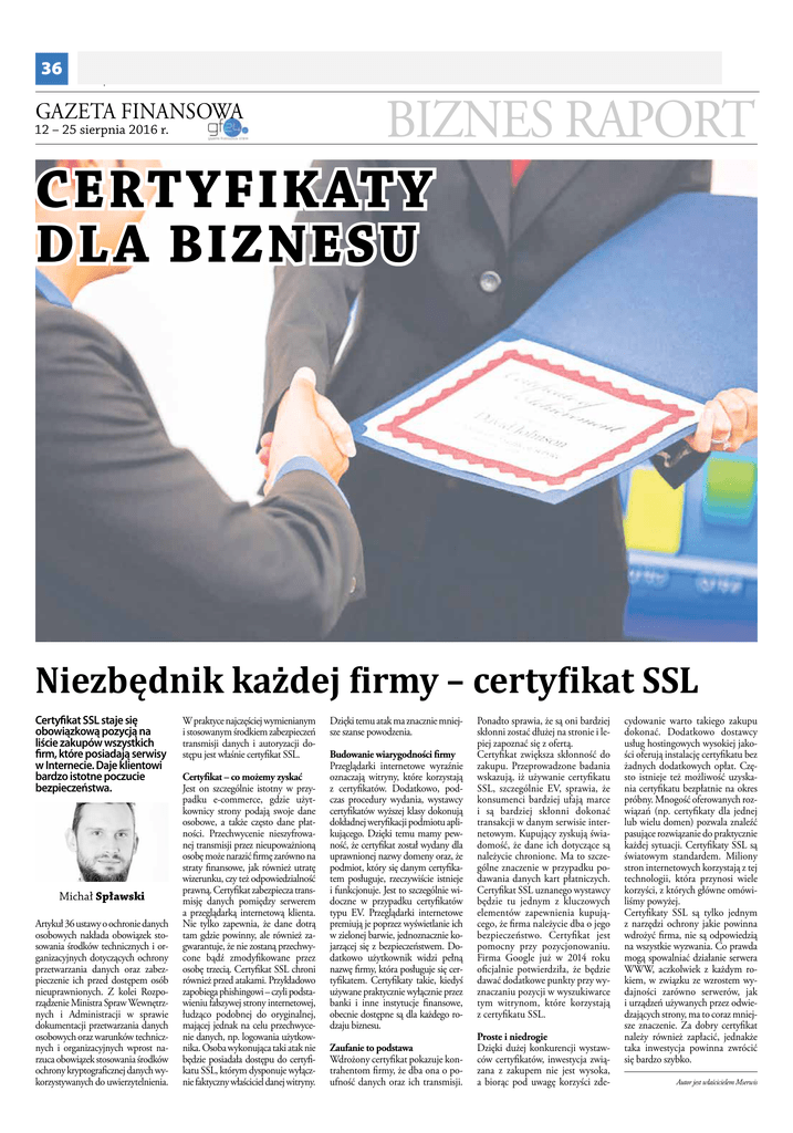 36 BIZNES RAPORT certyfikaty dla biznesu gazeta finansowa 12 – 25 sierpnia 2016 r. Niezbędnik każdej firmy – certyfikat SSL Certyfikat SSL staje się obowiązkową pozycją na liście zakupów wszystkich firm, które posiadają serwisy w Internecie. Daje klientowi bardzo istotne poczucie bezpieczeństwa. Michał Spławski Artykuł 36 ustawy o ochronie danych osobowych nakłada obowiązek stosowania środków technicznych i organizacyjnych dotyczących ochrony przetwarzania danych oraz zabezpieczenie ich przed dostępem osób nieuprawnionych. Z kolei Rozporządzenie Ministra Spraw Wewnętrznych i Administracji w sprawie dokumentacji przetwarzania danych osobowych oraz warunków technicznych i organizacyjnych wprost narzuca obowiązek stosowania środków ochrony kryptograficznej danych wykorzystywanych do uwierzytelnienia. W praktyce najczęściej wymienianym i stosowanym środkiem zabezpieczeń transmisji danych i autoryzacji dostępu jest właśnie certyfikat SSL. Certyfikat – co możemy zyskać Jest on szczególnie istotny w przypadku e-commerce, gdzie użytkownicy strony podają swoje dane osobowe, a także często dane płatności. Przechwycenie nieszyfrowanej transmisji przez nieupoważnioną osobę może narazić firmę zarówno na straty finansowe, jak również utratę wizerunku, czy też odpowiedzialność prawną. Certyfikat zabezpiecza transmisję danych pomiędzy serwerem a przeglądarką internetową klienta. Nie tylko zapewnia, że dane dotrą tam gdzie powinny, ale również zagwarantuje, że nie zostaną przechwycone bądź zmodyfikowane przez osobę trzecią. Certyfikat SSL chroni również przed atakami. Przykładowo zapobiega phishingowi – czyli podstawieniu fałszywej strony internetowej, łudząco podobnej do oryginalnej, mającej jednak na celu przechwycenie danych, np. logowania użytkownika. Osoba wykonująca taki atak nie będzie posiadała dostępu do certyfikatu SSL, którym dysponuje wyłącznie faktyczny właściciel danej witryny. Dzięki temu atak ma znacznie mniejsze szanse powodzenia. Budowanie wiarygodności firmy Przeglądarki internetowe wyraźnie oznaczają witryny, które korzystają z certyfikatów. Dodatkowo, podczas procedury wydania, wystawcy certyfikatów wyższej klasy dokonują dokładnej weryfikacji podmiotu aplikującego. Dzięki temu mamy pewność, że certyfikat został wydany dla uprawnionej nazwy domeny oraz, że podmiot, który się danym certyfikatem posługuje, rzeczywiście istnieje i funkcjonuje. Jest to szczególnie widoczne w przypadku certyfikatów typu EV. Przeglądarki internetowe premiują je poprzez wyświetlanie ich w zielonej barwie, jednoznacznie kojarzącej się z bezpieczeństwem. Dodatkowo użytkownik widzi pełną nazwę firmy, która posługuje się certyfikatem. Certyfikaty takie, kiedyś używane praktycznie wyłącznie przez banki i inne instytucje finansowe, obecnie dostępne są dla każdego rodzaju biznesu. Zaufanie to podstawa Wdrożony certyfikat pokazuje kontrahentom firmy, że dba ona o poufność danych oraz ich transmisji. Ponadto sprawia, że są oni bardziej skłonni zostać dłużej na stronie i lepiej zapoznać się z ofertą. Certyfikat zwiększa skłonność do zakupu. Przeprowadzone badania wskazują, iż używanie certyfikatu SSL, szczególnie EV, sprawia, że konsumenci bardziej ufają marce i są bardziej skłonni dokonać transakcji w danym serwisie internetowym. Kupujący zyskują świadomość, że dane ich dotyczące są należycie chronione. Ma to szczególne znaczenie w przypadku podawania danych kart płatniczych. Certyfikat SSL uznanego wystawcy będzie tu jednym z kluczowych elementów zapewnienia kupującego, że firma należycie dba o jego bezpieczeństwo. Certyfikat jest pomocny przy pozycjonowaniu. Firma Google już w 2014 roku oficjalnie potwierdziła, że będzie dawać dodatkowe punkty przy wyznaczaniu pozycji w wyszukiwarce tym witrynom, które korzystają z certyfikatu SSL. Proste i niedrogie Dzięki dużej konkurencji wystawców certyfikatów, inwestycja związana z zakupem nie jest wysoka, a biorąc pod uwagę korzyści zde- cydowanie warto takiego zakupu dokonać. Dodatkowo dostawcy usług hostingowych wysokiej jakości oferują instalację certyfikatu bez żadnych dodatkowych opłat. Często istnieje też możliwość uzyskania certyfikatu bezpłatnie na okres próbny. Mnogość oferowanych rozwiązań (np. certyfikaty dla jednej lub wielu domen) pozwala znaleźć pasujące rozwiązanie do praktycznie każdej sytuacji. Certyfikaty SSL są światowym standardem. Miliony stron internetowych korzystają z tej technologii, która przynosi wiele korzyści, z których główne omówiliśmy powyżej. Certyfikaty SSL są tylko jednym z narzędzi ochrony jakie powinna wdrożyć firma, nie są odpowiedzią na wszystkie wyzwania. Co prawda mogą spowalniać działanie serwera WWW, aczkolwiek z każdym rokiem, w związku ze wzrostem wydajności zarówno serwerów, jak i urządzeń używanych przez odwiedzających strony, ma to coraz mniejsze znaczenie. Za dobry certyfikat należy również zapłacić, jednakże taka inwestycja powinna zwrócić się bardzo szybko. Autor jest właścicielem Mserwis Reklama BIZNES RAPORT Zyskać zaufanie klienta Czytając o certyfikatach SSL często można trafić na stwierdzenie, że zwiększają one zaufanie do strony internetowej lub sklepu. Jednak co to oznacza w praktyce? Czy zaufanie internautów można zmierzyć i przełożyć na liczbę transakcji? Maciej Kurek Rachel Botsman, badająca fenomen ekonomii współdzielenia stwierdziła, że zaufanie jest walutą nowej gospodarki. To dzięki niemu platforma Airbnb i wiele innych z powodzeniem łączą internautów szukających noclegu, czy usług z osobami mogącymi je zaoferować. Jednak rola, jaką zaufanie odgrywa w sieci, nie zaczęła się wraz z pojawieniem się pojęcia „sharing economy”. Zakupy w e-sklepie Wszędzie tam, gdzie internauci przekazują swoje dane lub pieniądze, za