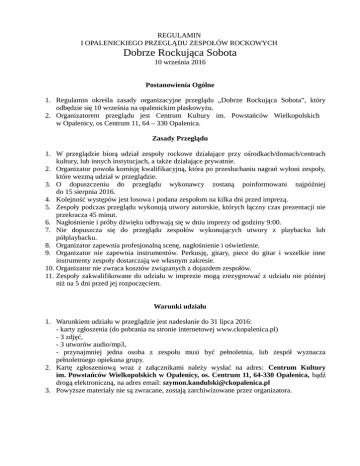 REGULAMIN I OPALENICKIEGO PRZEGLĄDU ZESPOŁÓW ROCKOWYCH Dobrze Rockująca Sobota 10 września 2016 Postanowienia Ogólne 1. Regulamin określa zasady organizacyjne przeglądu „Dobrze Rockująca Sobota”, który odbędzie się 10 września na opalenickim płaskowyżu. 2. Organizatorem przeglądu jest Centrum Kultury im. Powstańców Wielkopolskich w Opalenicy, os Centrum 11, 64 – 330 Opalenica. Zasady Przeglądu 1. W przeglądzie biorą udział zespoły rockowe działające przy ośrodkach/domach/centrach kultury, lub innych instytucjach, a także działające prywatnie. 2. Organizator powoła komisję kwalifikacyjną, która po przesłuchaniu nagrań wyłoni zespoły, które wezmą udział w przeglądzie. 3. O dopuszczeniu do przeglądu wykonawcy zostaną poinformowani najpóźniej do 15 sierpnia 2016. 4. Kolejność występów jest losowa i podana zespołom na kilka dni przed imprezą. 5. Zespoły podczas przeglądu wykonują utwory autorskie, których łączny czas prezentacji nie przekracza 45 minut. 6. Nagłośnienie i próby dźwięku odbywają się w dniu imprezy od godziny 9:00. 7. Nie dopuszcza się do przeglądu zespołów wykonujących utwory z playbacku lub półplaybacku. 8. Organizator zapewnia profesjonalną scenę, nagłośnienie i oświetlenie. 9. Organizator nie zapewnia instrumentów. Perkusję, gitary, piece do gitar i wszelkie inne instrumenty zespoły dostarczają we własnym zakresie. 10. Organizator nie zwraca kosztów związanych z dojazdem zespołów. 11. Zespoły zakwalifikowane do udziału w imprezie mogą zrezygnować z udziału nie później niż na 5 dni przed jej rozpoczęciem. Warunki udziału 1. Warunkiem udziału w przeglądzie jest nadesłanie do 31 lipca 2016: - karty zgłoszenia (do pobrania na stronie internetowej www.ckopalenica.pl) - 3 zdjęć, - 3 utworów audio/mp3, - przynajmniej jedna osoba z zespołu musi być pełnoletnia, lub zespół wyznacza pełnoletniego opiekuna grupy. 2. Kartę zgłoszeniową wraz z załącznikami należy wysłać na adres: Centrum Kultury im. Powstańców Wielkopolskich w Opalenicy, os. Centrum 11, 64-330 Opalenica, bądź drogą elektroniczną, na adres email: [email protected] 3. Powyższe materiały nie są zwracane, zostają zarchiwizowane przez organizatora. Postanowienia końcowe 1. Zespół zgłoszony do przeglądu wyraża zgodę na przetwarzanie danych osobowych dla potrzeb przeglądu (zgodnie z ustawą z dnia 29 sierpnia 1997r. o ochronie danych osobowych, DZ.U. Nr 133, poz. 883). 2. Organizator zastrzega sobie prawo do nieodpłatnego wykorzystania nadesłanych i wykonanych podczas przeglądu materiałów do spotów telewizyjnych, internetowych, programów telewizyjnych, audycji radiowych, oraz wszelkich prezentacji multimedialnych, prasowych, audio, i video, promujących przegląd. 3. Zgłaszający się zespół ponosi pełną odpowiedzialność za zgodność z prawdą danych umieszczonych w karcie zgłoszenia. Podanie nieprawdziwych danych, lub niepełnych danych osobowych, bądź nie podanie ich wcale, może skutkować wykluczeniem z przeglądu. 4. Zespół zgłaszający się do przeglądu oświadcza, ze posiada prawa autorskie do wykonywanych kompozycji i jest ich wyłącznym autorem. Organizator nie ponosi odpowiedzialności za wynikłe z tego powodu roszczenia osób trzecich. W przypadku naruszenia praw autorskich, osoba zgłaszająca zespół ponosi pełną odpowiedzialność za nieprawidłowości z tym związane. 5. Zgłoszenie do udziału w przeglądzie jest jednoznaczne z akceptacją niniejszego regulaminu. 6. Kwestie sporne i niezapisane w regulaminie rozstrzyga organizator. Decyzja ta jest niepodważalna. 7. W sprawach nieobjętych regulaminem mają zastosowanie przepisy Kodeksu Cywilnego.