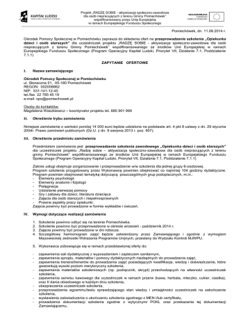 Projekt „RADZĘ SOBIE - aktywizacja społeczno-zawodowa dla osób niepracujących z terenu Gminy Pomiechówek” współfinansowany przez Unię Europejską w ramach Europejskiego Funduszu Społecznego Pomiechówek, dn. 11.08.2014 r. Ośrodek Pomocy Społecznej w Pomiechówku zaprasza do składania ofert na przeprowadzenie szkolenia „Opiekunka dzieci i osób starszych” dla uczestniczek projektu „RADZĘ SOBIE - aktywizacja społeczno-zawodowa dla osób niepracujących z terenu Gminy Pomiechówek” współfinansowanego ze środków Unii Europejskiej w ramach Europejskiego Funduszu Społecznego (Program Operacyjny Kapitał Ludzki, Priorytet VII, Działanie 7.1, Poddziałanie 7.1.1) ZAPYTANIE OFERTOWE I. Nazwa zamawiającego Ośrodek Pomocy Społecznej w Pomiechówku ul. Słoneczna 51, 05-180 Pomiechówek REGON: 002008862 NIP: 531-141-12-45 tel./fax 22 785 45 19 e-mail: [email protected] Osoby do kontaktów: Magdalena Waszkiewicz – koordynator projektu tel. 885 901 999 II. Określenie trybu zamówienia Niniejsze zamówienie o wartości poniżej 14 000 euro będzie udzielone na podstawie art. 4 pkt 8 ustawy z dn. 29 stycznia 2004r. Prawo zamówień publicznych (Dz.U. z dn. 9 sierpnia 2013 r. poz. 907). III. Określenie przedmiotu zamówienia Przedmiotem zamówienia jest przeprowadzenie szkolenia zawodowego „Opiekunka dzieci i osób starszych” dla uczestniczek projektu „Radzę sobie – aktywizacja społeczno-zawodowa dla osób niepracujących z terenu gminy Pomiechówek” współfinansowanego ze środków Unii Europejskiej w ramach Europejskiego Funduszu Społecznego (Program Operacyjny Kapitał Ludzki, Priorytet VII, Działanie 7.1, Poddziałanie 7.1.1) Zakres usługi obejmuje zorganizowanie i przeprowadzenie w/w szkolenia dla jednej grupy 6-osobowej. Program szkolenia przygotowany przez Wykonawcę powinien obejmować co najmniej 104 godziny dydaktyczne. Program powinien obejmować tematykę dotyczącą poszczególnych grup podopiecznych, m.in.: - Elementy psychologii - Elementy anatomii i fizjologii - Pielęgnacja - Udzielanie pierwszej pomocy - Gry i zabawy dla dzieci, literatura dziecięca - Zajęcia dla osób starszych i niepełnosprawnych - Prawne aspekty pracy opiekunki. Zajęcia powinny być prowadzone w formie wykładów i ćwiczeń. IV. Wymogi dotyczące realizacji zamówienia 1. 2. 3. 4. Szkolenie powinno odbyć się na terenie Pomiechówka. Szkolenie powinno być przeprowadzone w okresie wrzesień - październik 2014 r. Zajęcia powinny być prowadzone w dni robocze. Szczegółowy harmonogram zajęć będzie zatwierdzony przez Zamawiającego i zgodnie z wymogiem Mazowieckiej Jednostki Wdrażania Programów Unijnych, przesłany do Wydziału Kontroli MJWPU. 5. Wykonawca zobowiązuje się w ramach przedstawionej oferty do: - zapewnienia sali dydaktycznej z wyposażeniem i zapleczem sanitarnym, zapewnienia sprzętu, materiałów i pomocy dydaktycznych niezbędnych do prowadzenia zajęć, zapewnienia trenera/trenerów do prowadzenia zajęć posiadających kwalifikacje, wiedzę i doświadczenie, które gwarantują wysoki poziom merytoryczny szkolenia, zapewnienia materiałów szkoleniowych (np. podręcznik, skrypt) przechodzących na własność uczestniczek szkolenia, zapewnienia serwisu kawowego dla uczestniczek w ramach przerw (kawa, herbata, mleczko, cukier, ciastka), oraz II dania obiadowego w każdym dniu szkolenia, ubezpieczenia uczestniczek szkolenia, przeprowadzenia egzaminu/testu sprawdzającego stan wiedzy i umiejętności uczestniczek na zakończenie szkolenia, wystawienia zaświadczenia o ukończeniu szkolenia zgodnego z MEN i/lub certyfikatu, prowadzenia dokumentacji szkolenia zgodnie z wytycznymi POKL oraz przekazania tej dokumentacji Zamawiającemu, Projekt „RADZĘ SOBIE - aktywizacja społeczno-zawodowa dla osób niepracujących z terenu Gminy Pomiechówek” współfinansowany przez Unię Europejską w ramach Europejskiego Funduszu Społecznego - oznaczenia dokumentacji zajęć, materiałów dydaktycznych oraz zaświadczeń logotypami UE EFS i POKL, zgodnie z wytycznymi dotyczącymi promocji projektów w ramach Programu Operacyjnego Kapitał Ludzki, udostępnienia Zamawiającemu, a także Instytucji Pośredniczącej II stopnia lub innym podmiotom uprawnionym do kontroli projektu systemowego w ramach POKL, wglądu do dokumentacji finansowej związanej z wykonywaniem niniejszego zamówienia. 6. Wykonawca powinien wykazać się doświadczeniem w realizacji co najmniej 4 szkoleń o tematyce będącej przedmiotem zamówienia (w okresie ostatnich 3 lat) oraz najmniej 2 listami referencyjnymi. - V. Zawartość oferty i składane dokumenty: W przedstawionej ofercie Wykonawca powinien zawrzeć wszystkie koszty związane z wykonaniem przedmiotu zamówienia i podać wszystkie informacje uwzględnione w formularzu oferty. Formularz oferty i oświadczenia powinny być podpisane przez osobę upoważnioną do reprezentowania Wykonawcy. Kserokopie dokumentów powinny być poświadczone za zgodność z oryginałem. Oferta powinna zawierać następujące dokumenty: 1. Formularz oferty (załącznik nr 1) - wypełniony czytelnie, w języku polskim, ceny należy podać w zł. 2. Oświadczenie o spełnianiu warunków udziału w postępowaniu (załącznik nr 2). 3. Kserokopię aktualnego odpisu z Krajowego Rejestru Sądowego albo aktualnego zaświadczenia o wpisie do Ewidencji Działalności Gospodarczej (lub wydruk z CEIDG), 4. Kserokopię zaświadczenia o wpisie do rejestru instytucji szkoleniowych prowadzonego przez Wojewódzki Urząd Pracy + oświadczenie o aktualności wpisu na rok 2014 r. (lub aktualny wydruk z RIS), 5. Kserokopie innych dokumentów potwierdzających uprawnienia, wymagane przez odpowiednie przepisy prawa, do wykonywania określonej w przedmiocie zamówienia działalności lub czynności (jeśli dotyczy). 6. Program szkolenia wraz z harmonogramem uwzględniającym tematy zajęć i ich wymiar czasowy oraz proponowany termin i miejsce szkolenia (załąc