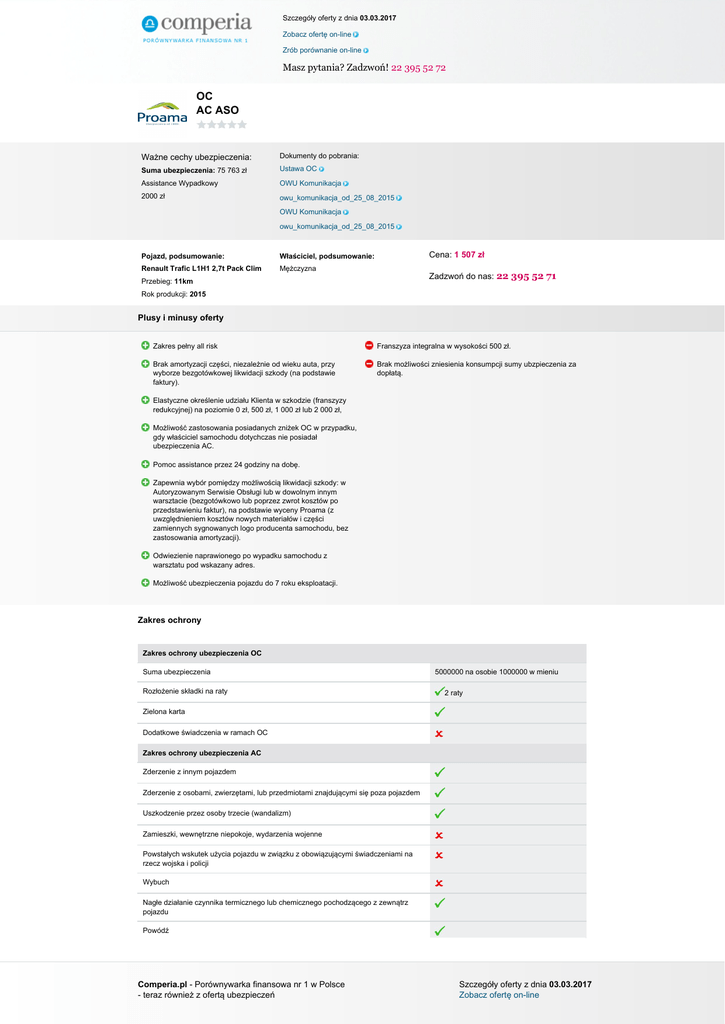 Szczegóły oferty z dnia 03.03.2017 Zobacz ofertę on-line Zrób porównanie on-line Masz pytania? Zadzwoń! 22 395 52 72 OC AC ASO Ważne cechy ubezpieczenia: Dokumenty do pobrania: Suma ubezpieczenia: 75 763 zł Ustawa OC Assistance Wypadkowy OWU Komunikacja 2000 zł owu_komunikacja_od_25_08_2015 OWU Komunikacja owu_komunikacja_od_25_08_2015 Pojazd, podsumowanie: Właściciel, podsumowanie: Renault Trafic L1H1 2,7t Pack Clim Mężczyzna Cena: 1 507 zł Zadzwoń do nas: 22 395 52 71 Przebieg: 11km Rok produkcji: 2015 Plusy i minusy oferty Zakres pełny all risk Franszyza integralna w wysokości 500 zł. Brak amortyzacji części, niezależnie od wieku auta, przy wyborze bezgotówkowej likwidacji szkody (na podstawie faktury). Brak możliwości zniesienia konsumpcji sumy ubzpieczenia za dopłatą. Elastyczne określenie udziału Klienta w szkodzie (franszyzy redukcyjnej) na poziomie 0 zł, 500 zł, 1 000 zł lub 2 000 zł, Możliwość zastosowania posiadanych zniżek OC w przypadku, gdy właściciel samochodu dotychczas nie posiadał ubezpieczenia AC. Pomoc assistance przez 24 godziny na dobę. Zapewnia wybór pomiędzy możliwością likwidacji szkody: w Autoryzowanym Serwisie Obsługi lub w dowolnym innym warsztacie (bezgotówkowo lub poprzez zwrot kosztów po przedstawieniu faktur), na podstawie wyceny Proama (z uwzględnieniem kosztów nowych materiałów i części zamiennych sygnowanych logo producenta samochodu, bez zastosowania amortyzacji). Odwiezienie naprawionego po wypadku samochodu z warsztatu pod wskazany adres. Możliwość ubezpieczenia pojazdu do 7 roku eksploatacji. Zakres ochrony Zakres ochrony ubezpieczenia OC Suma ubezpieczenia Rozłożenie składki na raty 5000000 na osobie 1000000 w mieniu 2 raty Zielona karta Dodatkowe świadczenia w ramach OC Zakres ochrony ubezpieczenia AC Zderzenie z innym pojazdem Zderzenie z osobami, zwierzętami, lub przedmiotami znajdującymi się poza pojazdem Uszkodzenie przez osoby trzecie (wandalizm) Zamieszki, wewnętrzne niepokoje, wydarzenia wojenne Powstałych wskutek użycia pojazdu w związku z obowiązującymi świadczeniami na rzecz wojska i policji Wybuch Nagłe działanie czynnika termicznego lub chemicznego pochodzącego z zewnątrz pojazdu Powódź Comperia.pl - Porównywarka finansowa nr 1 w Polsce - teraz również z ofertą ubezpieczeń Szczegóły oferty z dnia 03.03.2017 Zobacz ofertę on-line Szczegóły oferty z dnia 03.03.2017 Zobacz ofertę on-line Zrób porównanie on-line Masz pytania? Zadzwoń! 22 395 52 72 Lawina Osunięcie i zapadanie się ziemi Grad Uderzenie pioruna Huragan Trzęsienie ziemi Kradzież pojazdu Z wyłączeniami Rabunek/Rozbój Z wyłączeniami Upadek statku powietrznego Pożar Terytorium ochrony Terytorium ochrony ubezpieczenia AC Kraje Unii Europejskiej Algeria Albania Libia Maroko Mołdawia Białoruś Z wyłączeniem kradzieży lub jej usiłowania Rosja (część europejska) Czarnogóra Serbia Bośnia i Hercegowina Tunezja Iran Turcja Tylko w części europejskiej Izrael Ukraina Z wyłączeniem kradzieży lub jej usiłowania Wyłączenia Wyłączenia ubezpieczenia AC Udział własny w szkodzie Amortyzacja za części Brak amortyzacji Rodzaj stacji naprawczej (ze względu na metodę naprawy) autoryzowany serwis obsługi Rodzaj używanych części do naprawy nowe części sygnowane logiem producenta Okres eksploatacji pojazdu w jakim można wykupić polisę AutoCasco Do 7 lat Minimalna szkoda (franszyza integralna) 500 zł brak możliwości wykupu Szkoda została spowodowana wskutek rażącego niedbalstwa Kierowanie pojazdem w stanie nietrzeźwości, po zażyciu alkoholu, środków odurzających, substancji psychotropowych, lub jego pochodnych Comperia.pl - Porównywarka finansowa nr 1 w Polsce - teraz również z ofertą ubezpieczeń Szczegóły oferty z dnia 03.03.2017 Zobacz ofertę on-line Szczegóły oferty z dnia 03.03.2017 Zobacz ofertę on-line Zrób porównanie on-line Masz pytania? Zadzwoń! 22 395 52 72 Kierujący pojazdem nie posiadał uprawnień do prowadzenia pojazdu Sprawca zbiegł lub oddalił się z miejsca zdarzenia Pojazd nie miał ważnego przeglądu technicznego lub nie jest dopuszczony do ruchu Przywłaszczenie pojazdu Kradzież wyposażenia dodatkowego Uszkodzenie wyposażenia dodatkowego pojazdu Jeżeli doszło do kradzieży pojazdu wypłaci, jeśli zostało doubezpieczone wyposażenie dodatkowe Wada fabryczna pojazdu, jego naprawa, użytkowanie w sposób niezgodny z jego przeznaczeniem Uszkodzenie lub zniszczenie ogumienia Konsumpcja sumy ubezpieczenia chyba że powstały w skutek działania osób trzecich lub zniszczone zostały także inne części pojazdu Możliwość wykupienia Szyby Wartość pojazdu Z dnia szkody Zasada proporcji Brak info Dodatkowe wyłączenia brak dodatkowych wyłączeń Młody kierowca Comperia.pl - Porównywarka finansowa nr 1 w Polsce - teraz również z ofertą ubezpieczeń Powered by TCPDF (www.tcpdf.org) Szczegóły oferty z dnia 03.03.2017 Zobacz ofertę on-line
