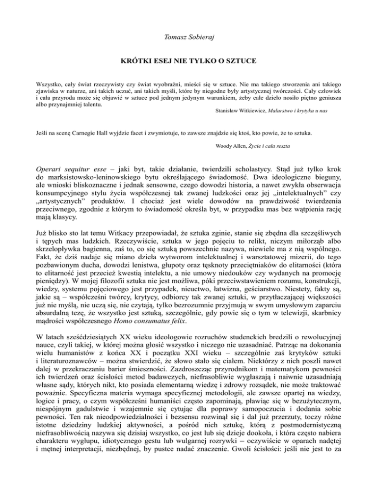 Tomasz Sobieraj KRÓTKI ESEJ NIE TYLKO O SZTUCE Wszystko, cały świat rzeczywisty czy świat wyobraźni, mieści się w sztuce. Nie ma takiego stworzenia ani takiego zjawiska w naturze, ani takich uczuć, ani takich myśli, które by niegodne były artystycznej twórczości. Cały człowiek i cała przyroda może się objawić w sztuce pod jednym jedynym warunkiem, żeby całe dzieło nosiło piętno geniusza albo przynajmniej talentu. Stanisław Witkiewicz, Malarstwo i krytyka u nas Jeśli na scenę Carnegie Hall wyjdzie facet i zwymiotuje, to zawsze znajdzie się ktoś, kto powie, że to sztuka. Woody Allen, Życie i cała reszta Operari sequitur esse – jaki byt, takie działanie, twierdzili scholastycy. Stąd już tylko krok do marksistowsko-leninowskiego bytu określającego świadomość. Dwa ideologiczne bieguny, ale wnioski bliskoznaczne i jednak sensowne, czego dowodzi historia, a nawet zwykła obserwacja konsumpcyjnego stylu życia współczesnej tak zwanej ludzkości oraz jej „intelektualnych” czy „artystycznych” produktów. I chociaż jest wiele dowodów na prawdziwość twierdzenia przeciwnego, zgodnie z którym to świadomość określa byt, w przypadku mas bez wątpienia rację mają klasycy. Już blisko sto lat temu Witkacy przepowiadał, że sztuka zginie, stanie się zbędna dla szczęśliwych i tępych mas ludzkich. Rzeczywiście, sztuka w jego pojęciu to relikt, niczym miłorząb albo skrzelopływka bagienna, zaś to, co się sztuką powszechnie nazywa, niewiele ma z nią wspólnego. Fakt, że dziś nadaje się miano dzieła wytworom intelektualnej i warsztatowej mizerii, do tego pozbawionym ducha, dowodzi lenistwa, głupoty oraz tęsknoty przeciętniaków do elitarności (która to elitarność jest przecież kwestią intelektu, a nie umowy niedouków czy wydanych na promocję pieniędzy). W mojej filozofii sztuka nie jest możliwa, póki przeciwstawieniem rozumu, konstrukcji, wiedzy, systemu pojęciowego jest przypadek, nieuctwo, łatwizna, geściarstwo. Niestety, fakty są, jakie są – współcześni twórcy, krytycy, odbiorcy tak zwanej sztuki, w przytłaczającej większości już nie myślą, nie uczą się, nie czytają, tylko bezrozumnie przyjmują w swym umysłowym zaparciu absurdalną tezę, że wszystko jest sztuką, szczególnie, gdy powie się o tym w telewizji, skarbnicy mądrości współczesnego Homo consumatus felix. W latach sześćdziesiątych XX wieku ideologowie rozruchów studenckich bredzili o rewolucyjnej nauce, czyli takiej, w której można głosić wszystko i niczego nie uzasadniać. Patrząc na dokonania wielu humanistów z końca XX i początku XXI wieku – szczególnie zaś krytyków sztuki i literaturoznawców – można stwierdzić, że słowo stało się ciałem. Niektórzy z nich poszli nawet dalej w przekraczaniu barier śmieszności. Zazdroszcząc przyrodnikom i matematykom pewności ich twierdzeń oraz ścisłości metod badawczych, niefrasobliwie wygłaszają i naiwnie uzasadniają własne sądy, których nikt, kto posiada elementarną wiedzę i zdrowy rozsądek, nie może traktować poważnie. Specyficzna materia wymaga specyficznej metodologii, ale zawsze opartej na wiedzy, logice i pracy, o czym współcześni humaniści często zapominają, pławiąc się w bezużytecznym, niespójnym gadulstwie i wzajemnie się cytując dla poprawy samopoczucia i dodania sobie pewności. Ten rak nieodpowiedzialności i bezsensu rozwinął się i dał już przerzuty, toczy różne istotne dziedziny ludzkiej aktywności, a pośród nich sztukę, którą z postmodernistyczną niefrasobliwością nazywa się dzisiaj wszystko, co jest lub się dzieje dookoła, i która często nabiera charakteru wygłupu, idiotycznego gestu lub wulgarnej rozrywki ‒ oczywiście w oparach nadętej i mętnej interpretacji, niezbędnej, by pustce nadać znaczenie. Gwoli ścisłości: jeśli nie jest to za moje – podatnika, pieniądze, nie funkcjonuje w (tutaj niezwykle modne określenie) przestrzeni publicznej, narażając mnie na niechciany i zwykle niemiły kontakt, nie mam nic przeciwko przybijaniu genitaliów do krzyża albo gwiazdy Dawida, malowaniu płótna na szaro, sikaniu czy obieraniu ziemniaków w „poważnej” galerii, okaleczaniu się w „artystycznym” geście, rzępoleniu, wyciu, stękaniu, wygibasom, obnażaniu się, głupim wierszom o niczym oraz innym odchodom i ewaporatom wątłej myśli i infantylnej ekspresji. Ale dlaczego nazywać to sztuką? Po co gloryfikować nicość? „Dzięki temu, co czynimy, dowiadujemy się, czym jesteśmy” – to napisał bodajże G. W. Leibniz. Aż strach pomyśleć, że ma rację. Współcześnie termin sztuka i dzieło sztuki są w zasadzie równoznaczne, ale, wbrew powszechnemu mniemaniu, już nie tożsame z pojęciem piękna – i w ogólnych rozważaniach można to uznać. Precyzując jednak nieco tę myśl, należy stwierdzić, że sztuka to składowa kultury, zmierzająca do stworzenia dzieła sztuki, oraz, że dzieło sztuki nie musi być piękne – czasem przecież jego potworność wywołuje wrażenie estetyczne czy metafizyczny niepokój. Ale co właściwie pojęcia „sztuka”, „dzieło sztuki” oraz „piękno” znaczyły i znaczą? W ujęciu antycznym za sztukę uważano każdy przejaw rzemieślniczej sprawności i umiejętności. Szewc, rzeźbiarz, wojskowy strateg, cieśla, dramatopisarz, garncarz czy architekt, wszyscy uprawiali sztukę w równym stopniu, opartą na harmonii układu i proporcjach, czyli pięknie. Sztuki natomiast nie uprawiali poeci – oni byli na wyższym szczeblu wtajemniczenia, wieścili, ich miejsce znajdowało się bliżej filozofii, szczególnie etyki, co w końcu zrozumiał nawet Platon, wzorem swojego Nauczyciela dosyć poezji niechętny. W średniowieczu dzielono sztuki na wyzwolone, których uprawianie wymaga wysiłku umysłowego, i które ze sztuką w naszym pojęciu nie miały nic wspólnego (były to nauki: logika, geometria, muzykologia, gr