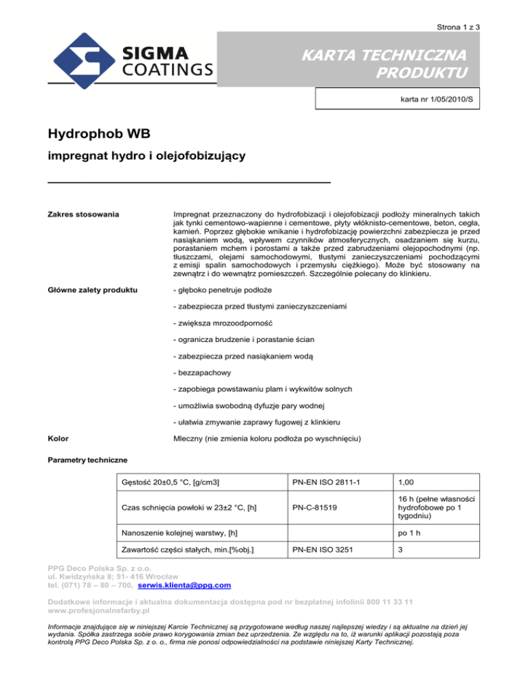 Strona 1 z 3 KARTA TECHNICZNA PRODUKTU karta nr 1/05/2010/S Hydrophob WB impregnat hydro i olejofobizujący _________________________________________ Zakres stosowania Impregnat przeznaczony do hydrofobizacji i olejofobizacji podłoży mineralnych takich jak tynki cementowo-wapienne i cementowe, płyty włóknisto-cementowe, beton, cegła, kamień. Poprzez głębokie wnikanie i hydrofobizację powierzchni zabezpiecza je przed nasiąkaniem wodą, wpływem czynników atmosferycznych, osadzaniem się kurzu, porastaniem mchem i porostami a także przed zabrudzeniami olejopochodnymi (np. tłuszczami, olejami samochodowymi, tłustymi zanieczyszczeniami pochodzącymi z emisji spalin samochodowych i przemysłu ciężkiego). Może być stosowany na zewnątrz i do wewnątrz pomieszczeń. Szczególnie polecany do klinkieru. Główne zalety produktu - głęboko penetruje podłoże - zabezpiecza przed tłustymi zanieczyszczeniami - zwiększa mrozoodporność - ogranicza brudzenie i porastanie ścian - zabezpiecza przed nasiąkaniem wodą - bezzapachowy - zapobiega powstawaniu plam i wykwitów solnych - umożliwia swobodną dyfuzje pary wodnej - ułatwia zmywanie zaprawy fugowej z klinkieru Mleczny (nie zmienia koloru podłoża po wyschnięciu) Kolor Parametry techniczne Gęstość 20±0,5 °C, [g/cm3] PN-EN ISO 2811-1 1,00 Czas schnięcia powłoki w 23±2 °C, [h] PN-C-81519 16 h (pełne własności hydrofobowe po 1 tygodniu) Nanoszenie kolejnej warstwy, [h] Zawartość części stałych, min.[%obj.] po 1 h PN-EN ISO 3251 3 PPG Deco Polska Sp. z o.o. ul. Kwidzyńska 8; 51- 416 Wrocław tel. (071) 78 – 80 – 700, [email protected] Dodatkowe informacje i aktualna dokumentacja dostępna pod nr bezpłatnej infolinii 800 11 33 11 www.profesjonalnefarby.pl Informacje znajdujące się w niniejszej Karcie Technicznej są przygotowane według naszej najlepszej wiedzy i są aktualne na dzień jej wydania. Spółka zastrzega sobie prawo korygowania zmian bez uprzedzenia. Ze względu na to, iż warunki aplikacji pozostają poza kontrolą PPG Deco Polska Sp. z o. o., firma nie ponosi odpowiedzialności na podstawie niniejszej Karty Technicznej. Strona 2 z 3 KARTA TECHNICZNA PRODUKTU karta nr 1/05/2010/S Hydrophob WB impregnat hydro i olejofobizujący _________________________________________ Grubość powłoki na sucho [μm] PN-EN 1062-1 Współczynnik przenikania pary wodnej EN ISO 7783-2 21 Sd 0,05 [m] Duży Klasa 1 (V1) 0,5 Przepuszczalność wody [kg/(m² · h0,5)] EN 1062-3 Średnia Klasa 2 (W2) Limit zawartości LZO wg Dyrektywy 2004/42/WE (kat. A/h/FW): 30 g/l (2010). Produkt zawiera max. 30 g/l Data ważności 24 miesiące od daty produkcji Metoda malowania Pędzel Rekomendowane narzędzia Pędzel ławkowiec, pędzel płaski marki DEKORAL GOLD Wydajność Cegła 1,5÷4 m²/l, Podłoże wapienne 1,5÷2 m²/l, Gazobeton 1÷2 m²/l, Kamień 1÷4 m²/l Rekomendowana ilość warstw 2 Przygotowanie podłoża Podłoża mineralne należy oczyścić z kurzu, mchów, porostów i wysuszyć. Należy usunąć wszystkie luźne części, umyć i odtłuścić. Powierzchnie okien i drzwi zabezpieczyć przed pochlapaniem, a w przypadku zabrudzenia natychmiast zmyć wodą. Impregnowanie może nieznacznie zmienić odcień lub uwydatnić kolor zabezpieczanego materiału. Malowanie Przed użyciem wyrób dokładnie wymieszaj. Wyrób należy stosować w postaci handlowej – nie rozcieńczać. Wyrób należy nakładać na suchą powierzchnię pędzlem w takiej ilości, aby odpowiednia ilość preparatu była pochłaniana (bez zacieków na powierzchni). Zalecana ilość warstw 2-3. Kolejną warstwę nakładaj po wyschnięciu pierwszej po 1 h. Pędzle i pozostałe akcesoria malarskie natychmiast po zakończeniu malowania umyć wodą. Dodatkowe informacje Prace malarskie należy przeprowadzać w temperaturze powietrza i podłoża +10 do + 30 °C i wilgotności względnej powietrza poniżej 85%. W przypadku ochrony PPG Deco Polska Sp. z o.o. ul. Kwidzyńska 8; 51- 416 Wrocław tel. (071) 78 – 80 – 700, [email protected] Dodatkowe informacje i aktualna dokumentacja dostępna pod nr bezpłatnej infolinii 800 11 33 11 www.profesjonalnefarby.pl Informacje znajdujące się w niniejszej Karcie Technicznej są przygotowane według naszej najlepszej wiedzy i są aktualne na dzień jej wydania. Spółka zastrzega sobie prawo korygowania zmian bez uprzedzenia. Ze względu na to, iż warunki aplikacji pozostają poza kontrolą PPG Deco Polska Sp. z o. o., firma nie ponosi odpowiedzialności na podstawie niniejszej Karty Technicznej. Strona 3 z 3 KARTA TECHNICZNA PRODUKTU karta nr 1/05/2010/S Hydrophob WB impregnat hydro i olejofobizujący _________________________________________ powierzchni poziomych narażonych na długotrwałe działanie wody okres zabezpieczenia jest krótszy. Nie należy malować mocno rozgrzanych przez słońce powierzchni. Produkt wodorozcieńczalny, nieodporny na mróz. Przechowywać w temp. powyżej 0 °C w chłodnym i suchym pomieszczeniu. PKWiU 20.30.11.0 Atesty Posiada atest PZH Zgodna z PN-EN 1062-1 Zalecenia BHP i P. Poż Stosować się do zaleceń podanych na opakowaniu. Szczegółowe informacje zamieszczone są w Karcie Charakterystyki na stronie www.sigmacoatings.com.pl Opakowania 10 L ____________________________________________________________ PPG Deco Polska Sp. z o.o. ul. Kwidzyńska 8; 51- 416 Wrocław tel. (071) 78 – 80 – 700, [email protected] Dodatkowe informacje i aktualna dokumentacja dostępna pod nr bezpłatnej infolinii 800 11 33 11 www.profesjonalnefarby.pl Informacje znajdujące się w niniejszej Karcie Technicznej są przygotowane według naszej najlepszej wiedzy i są aktualne na dzień jej wydania. Spółka zastrzega sobie prawo korygowania zmian bez uprzedzenia. Ze względu na to, iż warunki aplikacji pozostają poza kontrolą PPG Deco Polska Sp. z o. o., firma nie ponosi odpowiedzialności na podstawie niniejszej Karty Technicznej.