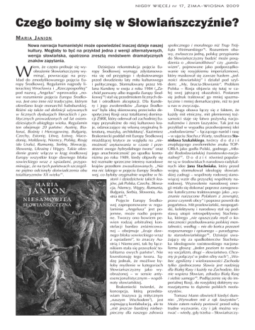 NIGDY WIĘCEJ nr 17, ZIMA-WIOSNA 2009 Czego boimy się w Słowiańszczyźnie? MARIA JANION Nowa narracja humanistyki może opowiedzieć inaczej dzieje naszej kultury. Mogłaby to być na przykład jedna z wersji alternatywnych, wersja słowiańska, opatrzona zresztą mnóstwem dramatycznych znaków zapytania. W iem, że często próbuje się wyobrażenie Słowiańszczyzny wyminąć, powracając na przykład do zmodyfikowanego pojęcia Europy Środkowej. Regulamin nagrody literackiej Wrocławia i „Rzeczpospolitej” pod nazwą „Angelus” wprowadza „nowe rozumienie pojęcia Europa Środkowa. Jest ono inne niż tradycyjne, którym określano kraje monarchii habsburskiej. Różni się także od definicji używanych w licznych dyskusjach literackich i politycznych prowadzonych od lat osiemdziesiątych ubiegłego wieku. Regulamin ten obejmuje 20 państw: Austrię, Białoruś, Bośnię i Hercegowinę, Bułgarię, Czechy, Estonię, Litwę, Łotwę, Macedonię, Mołdawię, Niemcy, Polskę, Rosję (do Uralu), Rumunię, Serbię, Słowację, Słowenię, Ukrainę i Węgry. Takie określenie granic włącza w krąg środkowej Europy wszystkie kraje dawnego bloku sowieckiego wraz z sąsiadami, przypominając, że na tych państwach szczególne piętno odcisnęły doświadczenia obu totalitaryzmów XX wieku”1. Dzisiejsza rekonstrukcja pojęcia Europy Środkowej wymaga zdystansowania się od przyjętego i dyskutowanego przed dwudziestu laty mitu kulturowego i politycznego. Sformułowany przez Milana Kunderę w eseju z roku 1984 („Zachód porwany albo tragedia Europy Środkowej”2) stał się przedmiotem licznych debat i ośrodkiem akceptacji. Dla Kundery i jego zwolenników „Europa Środkowa” była ideą skierowaną przeciwko despotycznej Rosji oraz totalitarnej dominacji ZSRR, który oderwał od zachodniej Europy przynależne do niej kulturowo kraje, odznaczające się własną oryginalną literaturą, muzyką, architekturą3. Kazimierz Brakoniecki poddał mit Europy Środkowej miażdżącej krytyce ze względu na „niemożność usytuowania w czasie i przestrzeni owego hybrydalnego tworu” oraz jego anachroniczność po upadku komunizmu po roku 1989, kiedy objawiły się też rozmaite sprzeczne interesy narodowe krajów przedtem zwasalizowanych. „Nie ma nic takiego w pojęciu Europy Środkowej, co byłoby oryginalnie wspólne w historii i dziedzictwie takich krajów, jak Polska, Czechy, Słowacja, Niemcy, Węgry, Rumunia, Bułgaria, Serbia, Słowenia, Austria itd.”4. Pojęcie Europy Środkowej zaproponowane w regulaminie „Angelusa” jest pojemne, może nadto pojemne. Tworzy ono bowiem pewien rodzaj arbitralnej konstelacji bardzo zróżnicowanej – obejmuje „kraje dawnego bloku sowieckiego wraz z sąsiadami”, to znaczy Austrią i Niemcami, tak by łącznikiem stała się przeszłość totalitarna owych państw5. Nie kwestionuję tego tworu. Sądzę jednak, że możliwe byłoby myślenie w kategoriach Słowiańszczyzny jako wyobrażonej – w sensie antyesencjonalistycznym – wspólnoty słowiańskiej. Brakoniecki twierdzi, że koncepcja, którą przedstawiam (nazywa ją mitycznym „naszym Wschodem”), jest zajmującą konfabulacją, ale to „mit jeszcze bardziej niebezpieczny dla naszego zdrowia społecznego i moralnego niż Trup Trójkąta Weimarskiego”6. Rozumiem obawy, zwłaszcza jedną, polską: przypisanie do Słowiańszczyzny budzić może posądzenia o „słowianofilstwo” czy „panslawizm”, pojmowane jako podporządkowanie się rosyjskiemu imperializmowi, który maskował się zawsze hasłem „jedności słowiańskiej” i działał pod szyldem: „My, bracia-Słowianie”. Problem Polska – Rosja objawia się tutaj w całej swej jątrzącej okazałości. Postaram się jednak traktować go mniej spazmatycznie i mniej demarkacyjnie, niż to jest u nas w zwyczaju. Druga obawa łączy się z faktem, że każdy mit etniczny, mit plemiennej tożsamości staje się łatwo pożywką nacjonalizmów i żerem faszystów. Tak jest na przykład w wypadku przedwojennej idei „rodosławizmu” – łączącego naród i rasę – w ujęciu Stacha z Warty, rzeźbiarza Stanisława Szukalskiego, twórcy d o d z i ś znajdującego zwolenników znaku TOPORŁA jako godła Polski, godnego „Młodzi Rodosławiańskiej (rasistowsko-nacjonalnej)”7. D o d z i ś również popularne są w środowiskach narodowo-radykalnych idee Jana Stachniuka, który przed wojną sformułował ideologię słowiańskiej zadrugi – wspólnoty rodowej stanowiącej wzór dla przyszłej wspólnoty narodowej. Wyzwolenie narodowej energii miało się dokonać poprzez zanegowanie katolicyzmu traktowanego jako „wyznanie narzucone Polakom z zewnątrz, przez czynnik obcy” i poprzez powrót do pogaństwa. Mit prasłowiański, neopogański, kolektywny i narodowy stał się podstawą utopii retrospektywnej Stachniuka, którego „nie opuszczała myśl o konieczności przebudowania polskiej mentalności, według – nie do końca przezeń rozpoznanego i opisanego – paradygmatu starosłowiańskiego”8. Dzisiejsi uważający się za spadkobierców Stachniuka ideologowie rasistowskiego nacjonalizmu głoszą: „Jeden poziom to narodowy socjalizm, drugi – słowiaństwo. Chcemy je połączyć w jeden silny ruch”; „Wobec zgnilizny i wielorasowości Zachodu tylko zjednoczona Slawia jest nadzieją dla Białej Rasy i każdy na Zachodzie, kto nie wspiera Słowian, zdradza Białą Rasę i siebie samego”9. Podłączenie się do imperialnej Rosji, do rosyjskiej doktryny euroazjatyzmu to dążenie polskich neofaszystów. Tomasz Mann obwieścił kiedyś dumnie: „Wyrwałem mit z rąk faszystów”. Może zatem należy postawić przed sobą trudne wyzwanie, czy i jak można wyrwać – wtedy, gdy trzeba – Słowiańszczy- NIGDY WIĘCEJ nr 17, ZIMA-WIOSNA 2009 znę i słowiańskość z rąk faszystów? Zdaniem Slavoja Žižka, nie jest to możliwe, gdyż tożsamość narodowa i etniczna buduje się na fun