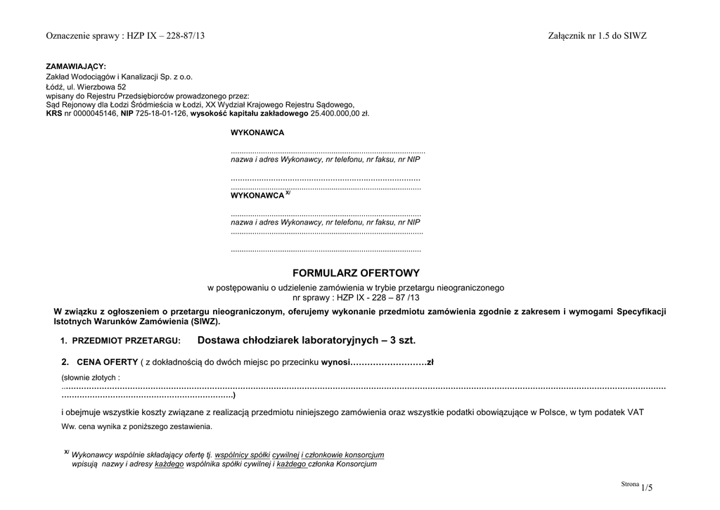 Oznaczenie sprawy : HZP IX – 228-87/13 Załącznik nr 1.5 do SIWZ ZAMAWIAJĄCY: Zakład Wodociągów i Kanalizacji Sp. z o.o. Łódź, ul. Wierzbowa 52 wpisany do Rejestru Przedsiębiorców prowadzonego przez: Sąd Rejonowy dla Łodzi Śródmieścia w Łodzi, XX Wydział Krajowego Rejestru Sądowego, KRS nr 0000045146, NIP 725-18-01-126, wysokość kapitału zakładowego 25.400.000,00 zł. WYKONAWCA ........................................................................................... nazwa i adres Wykonawcy, nr telefonu, nr faksu, nr NIP ................................................................................ ......................................................................................... X/ WYKONAWCA ......................................................................................... nazwa i adres Wykonawcy, nr telefonu, nr faksu, nr NIP .......................................................................................... ......................................................................................... FORMULARZ OFERTOWY w postępowaniu o udzielenie zamówienia w trybie przetargu nieograniczonego nr sprawy : HZP IX - 228 – 87 /13 W związku z ogłoszeniem o przetargu nieograniczonym, oferujemy wykonanie przedmiotu zamówienia zgodnie z zakresem i wymogami Specyfikacji Istotnych Warunków Zamówienia (SIWZ). 1. PRZEDMIOT PRZETARGU: Dostawa chłodziarek laboratoryjnych – 3 szt. 2. CENA OFERTY ( z dokładnością do dwóch miejsc po przecinku wynosi………………………zł (słownie złotych : ..……………………………………………………………………………………………………………………………………………………………………………………………………………… ………………………………………………………….) i obejmuje wszystkie koszty związane z realizacją przedmiotu niniejszego zamówienia oraz wszystkie podatki obowiązujące w Polsce, w tym podatek VAT Ww. cena wynika z poniższego zestawienia. X/ Wykonawcy wspólnie składający ofertę tj. wspólnicy spółki cywilnej i członkowie konsorcjum wpisują nazwy i adresy każdego wspólnika spółki cywilnej i każdego członka Konsorcjum Strona 1/5 Oznaczenie sprawy : HZP IX – 228-87/13 Załącznik nr 1.5 do SIWZ Opis Lp Nazwa asortymentu 1 2 Ilość 3 4 Okres gwarancji producenta (min. 24 miesiące na poszczególne urządzenia od daty odbioru dostawy przez Zamawiającego) 5 Cena Jednostkowa Wartość Netto [4x6] 6 7 …………………… ……………… Pojemność każdej komory około 150 l. Wymuszony obieg powietrza, drzwi pełne, minimalny zakres pracy od +2 do +10 °C. Regulacja nastawu temperatury z dokładnością nie gorszą niż 0,1 °C. Jednorodność temperatury mierzona w osi pionowej dla każdej komory nie gorsza niż 0,5 °C. Chłodziarka wyposażona w zewnętrzny 1 Chłodziarka laboratoryjna dwukomorowa CHL2/2+ produkcji POLEKO wyświetlacz temperatury osobny dla każdej z komór. Wymagana ilość półek: nie mniej niż 3 w każdej komorze. 1 szt. ………. Chłodziarka wyposażona w bezpiecznik termiczny. Zasilanie 230V. Wnętrze i obudowa wykonane z materiałów odpornych chemicznie. W każdej z komór otwór do wprowadzenia zewnętrznego czujnika. Chłodziarka ze świadectwem wzorcowania urządzenia w akredytowanym laboratorium w dziewięciu standardowych punktach rozkładu temperatury dla temperatury 3,0 °C. Strona 2/5 Oznaczenie sprawy : HZP IX – 228-87/13 Załącznik nr 1.5 do SIWZ Opis Lp Nazwa asortymentu 1 2 Ilość 3 4 Okres gwarancji producenta (min. 24 miesiące na poszczególne urządzenia od daty odbioru dostawy przez Zamawiającego) 5 Cena Jednostkowa Wartość Netto [4x6] 6 7 …………………… ……………… Pojemność komory chłodziarki około 150l. Wymuszony obieg powietrza, drzwi pełne, minimalny zakres pracy od +2 do +10 °C. Regulacja nastawu temperatury z dokładnością nie gorszą niż 0,1 °C. Jednorodność temperatury mierzona w osi pionowej dla każdej komory nie gorsza niż 0,5 °C. Chłodziarka wyposażona w zewnętrzny wyświetlacz temperatury. Wymagana ilość półek: 2 Chłodziarka laboratoryjna z zamrażarką CHL2/ZLN85+ produkcji POLEKO nie mniej niż 3 Pojemność komory zamrażarki około 85l, minimalny zakres pracy od -25 do 0 °C. Regulacja nastawu temperatury z dokładnością nie gorszą niż 0,1 °C, zamrażarka wyposażona w 1 szt. ………. zewnętrzny wyświetlacz temperatury. Wymagana ilość półek: 2. Ustawienie segmentów: zamrażarka na dole. Chłodziarka ze świadectwem wzorcowania urządzenia w akredytowanym laboratorium w dziewięciu standardowych punktach rozkładu temperatury dla temp. 3°C. Zamrażarka ze świadectwem wzorcowania urządzenia w akredytowanym laboratorium w dziewięciu standardowych punktach rozkładu temperatury dla temp. -20°C. Strona 3/5 Oznaczenie sprawy : HZP IX – 228-87/13 Załącznik nr 1.5 do SIWZ Opis Lp Nazwa asortymentu 1 2 Ilość 3 4 Okres gwarancji producenta (min. 24 miesiące na poszczególne urządzenia od daty odbioru dostawy przez Zamawiającego) 5 Cena Jednostkowa Wartość Netto [4x6] 6 7 …………………… ……………… Pojemność 300 l, obudowa z blachy malowanej proszkowo, wnętrze ze 3 Chłodziarka laboratoryjna CH 5+ produkcji POL-EKO stali nierdzewnej, drzwi pełne, wymuszony obieg powietrza, zakres temperatury od 0 °C do 10 °C, regulacja temperatury co 0,1 °C, otwór do wprowadzania czujnika zewnętrznego, sygnalizacja otwartych drzwi, 1 szt. ………. funkcja automatycznego odszraniania, stabilność temperatury w 4 °C nie gorsza niż 0,5 °C Wartość netto ogółem: (suma wartości netto dla poz. 1-3) ……………………. Stawka VAT (w %): Cena oferty brutto: ……………… (Wartość netto ogółem powiększona o podatek VAT) ……………………. Strona 4/5 Oznaczenie sprawy : HZP IX – 228-87/13 Załącznik nr 1.5 do