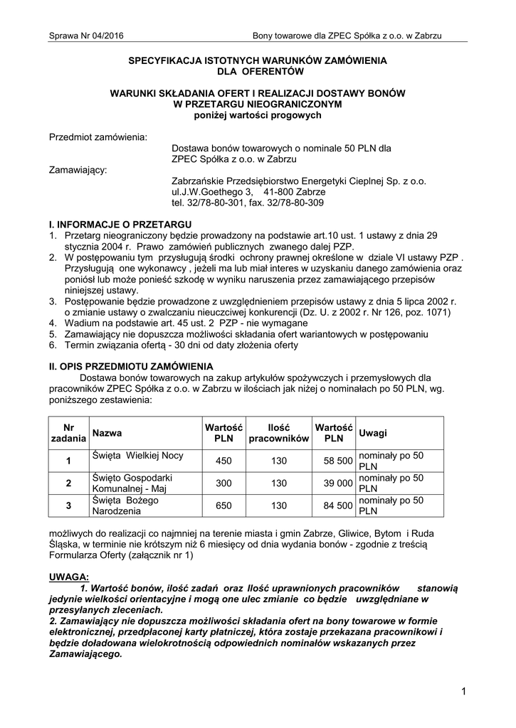 Bony towarowe dla ZPEC Spółka z o.o. w Zabrzu Sprawa Nr 04/2016 SPECYFIKACJA ISTOTNYCH WARUNKÓW ZAMÓWIENIA DLA OFERENTÓW WARUNKI SKŁADANIA OFERT I REALIZACJI DOSTAWY BONÓW W PRZETARGU NIEOGRANICZONYM poniżej wartości progowych Przedmiot zamówienia: Dostawa bonów towarowych o nominale 50 PLN dla ZPEC Spółka z o.o. w Zabrzu Zamawiający: Zabrzańskie Przedsiębiorstwo Energetyki Cieplnej Sp. z o.o. ul.J.W.Goethego 3, 41-800 Zabrze tel. 32/78-80-301, fax. 32/78-80-309 I. INFORMACJE O PRZETARGU 1. Przetarg nieograniczony będzie prowadzony na podstawie art.10 ust. 1 ustawy z dnia 29 stycznia 2004 r. Prawo zamówień publicznych zwanego dalej PZP. 2. W postępowaniu tym przysługują środki ochrony prawnej określone w dziale VI ustawy PZP . Przysługują one wykonawcy , jeżeli ma lub miał interes w uzyskaniu danego zamówienia oraz poniósł lub może ponieść szkodę w wyniku naruszenia przez zamawiającego przepisów niniejszej ustawy. 3. Postępowanie będzie prowadzone z uwzględnieniem przepisów ustawy z dnia 5 lipca 2002 r. o zmianie ustawy o zwalczaniu nieuczciwej konkurencji (Dz. U. z 2002 r. Nr 126, poz. 1071) 4. Wadium na podstawie art. 45 ust. 2 PZP - nie wymagane 5. Zamawiający nie dopuszcza możliwości składania ofert wariantowych w postępowaniu 6. Termin związania ofertą - 30 dni od daty złożenia oferty II. OPIS PRZEDMIOTU ZAMÓWIENIA Dostawa bonów towarowych na zakup artykułów spożywczych i przemysłowych dla pracowników ZPEC Spółka z o.o. w Zabrzu w ilościach jak niżej o nominałach po 50 PLN, wg. poniższego zestawienia: Nr Nazwa zadania 1 2 3 Święta Wielkiej Nocy Święto Gospodarki Komunalnej - Maj Święta Bożego Narodzenia Wartość Ilość Wartość Uwagi PLN pracowników PLN 450 130 300 130 650 130 nominały po 50 PLN nominały po 50 39 000 PLN nominały po 50 84 500 PLN 58 500 możliwych do realizacji co najmniej na terenie miasta i gmin Zabrze, Gliwice, Bytom i Ruda Śląska, w terminie nie krótszym niż 6 miesięcy od dnia wydania bonów - zgodnie z treścią Formularza Oferty (załącznik nr 1) UWAGA: 1. Wartość bonów, ilość zadań oraz Ilość uprawnionych pracowników stanowią jedynie wielkości orientacyjne i mogą one ulec zmianie co będzie uwzględniane w przesyłanych zleceniach. 2. Zamawiający nie dopuszcza możliwości składania ofert na bony towarowe w formie elektronicznej, przedpłaconej karty płatniczej, która zostaje przekazana pracownikowi i będzie doładowana wielokrotnością odpowiednich nominałów wskazanych przez Zamawiającego. 1 Sprawa Nr 04/2016 Bony towarowe dla ZPEC Spółka z o.o. w Zabrzu III. WYMAGANIA WOBEC OFERENTÓW ORAZ WYKAZ ŻĄDANYCH DOKUMENTÓW, POTWIERDZAJĄCYCH SPEŁNIENIE TYCH WYMAGAŃ 1) O zamówienie publiczne mogą ubiegać się Oferenci, którzy spełnią warunki określone w art. 22 ust. 1, 2 i 3 ustawy PZP : 1) posiadają uprawnienia do wykonywania określonej działalności lub czynności, jeżeli ustawy nakładają obowiązek posiadania takich uprawnień 2) posiadają niezbędną wiedzę i doświadczenie oraz potencjał techniczny, a także dysponują osobami zdolnymi do wykonania zamówienia 3) znajdują się w sytuacji ekonomicznej i finansowej zapewniającej wykonanie zamówienia 4) nie podlegają wykluczeniu z postępowania na podstawie art. 24 ustawy PZP 2) W celu potwierdzenia spełnienia warunków określonych w pkt.1 oferenci mają obowiązek złożyć: 1) stosowne oświadczenia na formularzu stanowiącym integralną część niniejszej instrukcji (załączniki 2, 3) 2) aktualny odpis(y) z właściwego rejestru albo aktualne zaświadczenie(nia) o wpisie do ewidencji działalności gospodarczej, jeżeli odrębne przepisy wymagają wpisu do rejestru lub zgłoszenia do ewidencji działalności gospodarczej, wystawione nie wcześniej niż 6 miesięcy przed upływem terminu składania ofert, 3) umowę regulującą współpracę podmiotów występujących wspólnie Dokumenty, o których mowa w pkt. 2.2. i 2.3 są składane w formie oryginału lub kserokopii poświadczonej za zgodność z oryginałem przez dostawcę. IV. OPIS SPOSOBU PRZYGOTOWANIA OFERTY 1) Oferta powinna być sporządzona w jednym egzemplarzu i być zgodna z Formularzem Oferty, stanowiącym załącznik nr 1 niniejszej instrukcji 2) Oferent ma prawo złożyć tylko jedną ofertę 3) Oferta musi obejmować całość zamówienia, nie dopuszcza się składania ofert częściowych 4) Złożenie więcej niż jednej oferty lub złożenie oferty zawierającej propozycje alternatywne spowoduje odrzucenie wszystkich ofert złożonych przez Oferenta 5) Oferta powinna być napisana czytelnie - trwałą techniką - w języku polskim, oraz podpisana przez osobę(y) uprawnioną do reprezentowania Oferenta 6) Każda karta oferty i załączniki winny być ponumerowane i spięte 7) Wszystkie poprawki lub zmiany w tekście oferty muszą być parafowane i datowane własnoręcznie przez osobę(y) podpisującą ofertę 8) Wszystkie koszty związane ze sporządzeniem i przedłożeniem oferty ponosi Oferent V. TERMIN SKŁADANIA OFERT 1. Oferty przygotowane zgodnie z niniejszą instrukcją należy złożyć do dnia 29 lutego 2016 r. do godziny 12 00 2. Oferta powinna zostać złożona w siedzibie Zamawiającego w Zabrzu przy ul. Goethego 3, recepcja, parter, w zamkniętej kopercie z oznaczeniem: „Sprawa nr 04/2016 - Oferta na dostawę bonów towarowych - nie otwierać do dnia 29 lutego 2016 r. do godziny 12 00 ” VI. OSOBY UPOWAŻNIONE PRZEZ ZAMAWIAJĄCEGO DO KONTAKTU Z OFERENTAMI: 1) Aleksandra Zboch - Dział Kadr, nr telefonu 32/78-80-331, pokój nr 13 2) Ewa Salwin - Dział Kadr, nr telefonu 32/78-80-332, pokój nr 13 3) Agnieszka Metelska - Sekcja ds. przetargów, nr. telefonu 32/78-80-342, pokój nr 15 VII. OTWARCIE OFERT Otwarcie ofert nastąpi w siedzibie Zamawiającego - w ZPEC Spółka z o.o. w Zabrzu przy ul. Goethego 3 - sala konferencyjna - Ip w dniu 29 lutego 2016 r. o godzinie 12 30 2 Bony towarowe dla ZPEC 