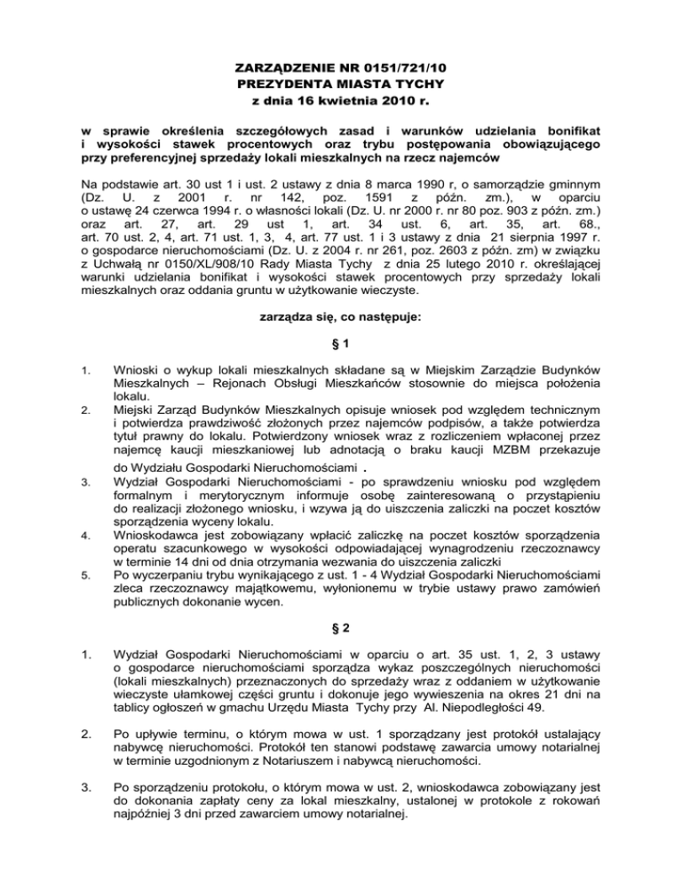 ZARZĄDZENIE NR 0151/721/10 PREZYDENTA MIASTA TYCHY z dnia 16 kwietnia 2010 r. w sprawie określenia szczegółowych zasad i warunków udzielania bonifikat i wysokości stawek procentowych oraz trybu postępowania obowiązującego przy preferencyjnej sprzedaży lokali mieszkalnych na rzecz najemców Na podstawie art. 30 ust 1 i ust. 2 ustawy z dnia 8 marca 1990 r, o samorządzie gminnym (Dz. U. z 2001 r. nr 142, poz. 1591 z późn. zm.), w oparciu o ustawę 24 czerwca 1994 r. o własności lokali (Dz. U. nr 2000 r. nr 80 poz. 903 z późn. zm.) oraz art. 27, art. 29 ust 1, art. 34 ust. 6, art. 35, art. 68., art. 70 ust. 2, 4, art. 71 ust. 1, 3, 4, art. 77 ust. 1 i 3 ustawy z dnia 21 sierpnia 1997 r. o gospodarce nieruchomościami (Dz. U. z 2004 r. nr 261, poz. 2603 z późn. zm) w związku z Uchwałą nr 0150/XL/908/10 Rady Miasta Tychy z dnia 25 lutego 2010 r. określającej warunki udzielania bonifikat i wysokości stawek procentowych przy sprzedaży lokali mieszkalnych oraz oddania gruntu w użytkowanie wieczyste. zarządza się, co następuje: §1 1. 2. 3. 4. 5. Wnioski o wykup lokali mieszkalnych składane są w Miejskim Zarządzie Budynków Mieszkalnych – Rejonach Obsługi Mieszkańców stosownie do miejsca położenia lokalu. Miejski Zarząd Budynków Mieszkalnych opisuje wniosek pod względem technicznym i potwierdza prawdziwość złożonych przez najemców podpisów, a także potwierdza tytuł prawny do lokalu. Potwierdzony wniosek wraz z rozliczeniem wpłaconej przez najemcę kaucji mieszkaniowej lub adnotacją o braku kaucji MZBM przekazuje do Wydziału Gospodarki Nieruchomościami . Wydział Gospodarki Nieruchomościami - po sprawdzeniu wniosku pod względem formalnym i merytorycznym informuje osobę zainteresowaną o przystąpieniu do realizacji złożonego wniosku, i wzywa ją do uiszczenia zaliczki na poczet kosztów sporządzenia wyceny lokalu. Wnioskodawca jest zobowiązany wpłacić zaliczkę na poczet kosztów sporządzenia operatu szacunkowego w wysokości odpowiadającej wynagrodzeniu rzeczoznawcy w terminie 14 dni od dnia otrzymania wezwania do uiszczenia zaliczki Po wyczerpaniu trybu wynikającego z ust. 1 - 4 Wydział Gospodarki Nieruchomościami zleca rzeczoznawcy majątkowemu, wyłonionemu w trybie ustawy prawo zamówień publicznych dokonanie wycen. §2 1. Wydział Gospodarki Nieruchomościami w oparciu o art. 35 ust. 1, 2, 3 ustawy o gospodarce nieruchomościami sporządza wykaz poszczególnych nieruchomości (lokali mieszkalnych) przeznaczonych do sprzedaży wraz z oddaniem w użytkowanie wieczyste ułamkowej części gruntu i dokonuje jego wywieszenia na okres 21 dni na tablicy ogłoszeń w gmachu Urzędu Miasta Tychy przy Al. Niepodległości 49. 2. Po upływie terminu, o którym mowa w ust. 1 sporządzany jest protokół ustalający nabywcę nieruchomości. Protokół ten stanowi podstawę zawarcia umowy notarialnej w terminie uzgodnionym z Notariuszem i nabywcą nieruchomości. 3. Po sporządzeniu protokołu, o którym mowa w ust. 2, wnioskodawca zobowiązany jest do dokonania zapłaty ceny za lokal mieszkalny, ustalonej w protokole z rokowań najpóźniej 3 dni przed zawarciem umowy notarialnej. §3 1. 2. 3. Cenę lokalu mieszkalnego ustala się w wysokości nie niższej niż jej wartość określona w operacie sporządzonym przez rzeczoznawcę majątkowego z uwzględnieniem bonifikaty stosowanej przy sprzedaży lokalu mieszkalnego wynikające z Uchwały nr 0150/XL/908/10 Rady Miasta Tychy z dnia 25 lutego 2010 r. określającej warunki udzielania bonifikat i wysokości stawek procentowych przy sprzedaży lokali mieszkalnych oraz oddania gruntu w użytkowanie wieczyste. Od ceny określonej w operacie, o którym mowa w ust. 1, odlicza się wysokość zwaloryzowanej kaucji mieszkaniowej należnej byłemu najemcy w związku z wykupem lokalu. Bonifikaty, o których mowa w ust. 1, pomniejszają cenę lokalu mieszkalnego, po uprzednim odliczeniu zwaloryzowanej kaucji mieszkaniowej. §4 1. 2. 3. 4. 5. Przy wykupie lokalu mieszkalnego w systemie ratalnym, pierwsza rata nie może być mniejsza niż 10 % wartości lokalu i powinna znajdować się na koncie sprzedającego, najpóźniej w dniu zawarcia umowy przed notariuszem. Pozostałą część należnej kwoty najemca winien spłacić w ratach określonych w umowie w okresie nie dłuższym niż 5 lat. W razie rozłożenia ceny sprzedaży lokalu mieszkalnego na raty, podlega ona oprocentowaniu w wysokości stopy procentowej równej stopie redyskonta weksli stosowanej przez Narodowy Bank Polski na dzień 1 stycznia roku, w którym następuje spłata raty powiększona o 2 punkty procentowe. Koszty wyceny lokalu mieszkalnego obciążają nabywcę i stanowią element składowy ceny lokalu. Koszty sprzedaży lokalu mieszkalnego obciążają nabywcę. §5 W przypadku, jeżeli nabywca lokalu mieszkalnego przed upływem 5 lat od dnia jego nabycia, zbędzie lokal lub wykorzysta go na inne cele niż mieszkaniowe – Miasto Tychy będzie domagać się zwrotu kwoty równej udzielonej bonifikaty po jej waloryzacji. §6 1. 2. W przypadku wycofania wniosku o wykup lokalu mieszkalnego, po zleceniu rzeczoznawcy dokonania wyceny lokalu, zgodnie z zapisem § 1 ust. 5 – zaliczka wniesiona na poczet kosztów sporządzenia tej wyceny nie podlega zwrotowi. W przypadku wycofania wniosku o wykup lokalu mieszkalnego, po dokonaniu wpłaty, o której mowa w § 2 ust. 3, Urząd Miasta dokona zwrotu wpłaconej kwoty z zastrzeżeniem postanowień ust. 1, w terminie 7 dni od dnia wycofania wniosku. §7 1. a) b) Ustala się, iż o wykup najmowanego lokalu mieszkalnego nie mogą ubiegać się: osoby, które zgodnie z obowiązującymi w tym zakresie przepisami zajmują lokale komunalne wyodrębnione z mieszkaniowego zasobu Miasta Tychy, jako lokale socjalne lub posiadające status lokali socjalnych najemcy lokali w budynkach nowo nabytych, nowo wybudowanych przez Miasto Tychy oraz powstałych w wyniku adaptacji pomieszczeń niemieszkalnych, za