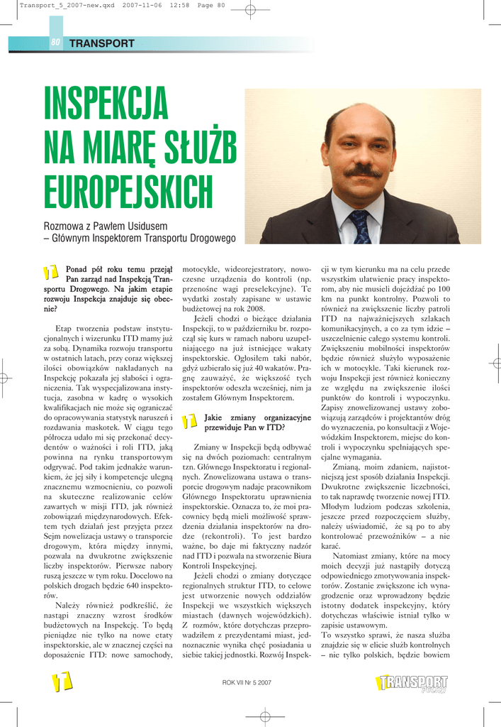 Transport_5_2007-new.qxd 80 2007-11-06 12:58 Page 80 TRANSPORT INSPEKCJA NA MIARĘ SŁUŻB EUROPEJSKICH Rozmowa z Pawłem Usidusem – Głównym Inspektorem Transportu Drogowego Ponad pół roku temu przejął Pan zarząd nad Inspekcją Tran sportu Drogowego. Na jakim etapie rozwoju Inspekcja znajduje się obec nie? Etap tworzenia podstaw instytucjonalnych i wizerunku ITD mamy już za sobą. Dynamika rozwoju transportu w ostatnich latach, przy coraz większej ilości obowiązków nakładanych na Inspekcję pokazała jej słabości i ograniczenia. Tak wyspecjalizowana instytucja, zasobna w kadrę o wysokich kwalifikacjach nie może się ograniczać do opracowywania statystyk naruszeń i rozdawania maskotek. W ciągu tego półrocza udało mi się przekonać decydentów o ważności i roli ITD, jaką powinna na rynku transportowym odgrywać. Pod takim jednakże warunkiem, że jej siły i kompetencje ulegną znacznemu wzmocnieniu, co pozwoli na skuteczne realizowanie celów zawartych w misji ITD, jak również zobowiązań międzynarodowych. Efektem tych działań jest przyjęta przez Sejm nowelizacja ustawy o transporcie drogowym, która między innymi, pozwala na dwukrotne zwiększenie liczby inspektorów. Pierwsze nabory ruszą jeszcze w tym roku. Docelowo na polskich drogach będzie 640 inspektorów. Należy również podkreślić, że nastąpi znaczny wzrost środków budżetowych na Inspekcję. To będą pieniądze nie tylko na nowe etaty inspektorskie, ale w znacznej części na doposażenie ITD: nowe samochody, motocykle, wideorejestratory, nowoczesne urządzenia do kontroli (np. przenośne wagi preselekcyjne). Te wydatki zostały zapisane w ustawie budżetowej na rok 2008. Jeżeli chodzi o bieżące działania Inspekcji, to w październiku br. rozpoczął się kurs w ramach naboru uzupełniającego na już istniejące wakaty inspektorskie. Ogłosiłem taki nabór, gdyż uzbierało się już 40 wakatów. Pragnę zauważyć, że większość tych inspektorów odeszła wcześniej, nim ja zostałem Głównym Inspektorem. Jakie zmiany organizacyjne przewiduje Pan w ITD? Zmiany w Inspekcji będą odbywać się na dwóch poziomach: centralnym tzn. Głównego Inspektoratu i regionalnych. Znowelizowana ustawa o transporcie drogowym nadaje pracownikom Głównego Inspektoratu uprawnienia inspektorskie. Oznacza to, że moi pracownicy będą mieli możliwość sprawdzenia działania inspektorów na drodze (rekontroli). To jest bardzo ważne, bo daje mi faktyczny nadzór nad ITD i pozwala na stworzenie Biura Kontroli Inspekcyjnej. Jeżeli chodzi o zmiany dotyczące regionalnych struktur ITD, to celowe jest utworzenie nowych oddziałów Inspekcji we wszystkich większych miastach (dawnych wojewódzkich). Z rozmów, które dotychczas przeprowadziłem z prezydentami miast, jednoznacznie wynika chęć posiadania u siebie takiej jednostki. Rozwój Inspek- ROK VII Nr 5 2007 cji w tym kierunku ma na celu przede wszystkim ułatwienie pracy inspektorom, aby nie musieli dojeżdżać po 100 km na punkt kontrolny. Pozwoli to również na zwiększenie liczby patroli ITD na najważniejszych szlakach komunikacyjnych, a co za tym idzie – uszczelnienie całego systemu kontroli. Zwiększeniu mobilności inspektorów będzie również służyło wyposażenie ich w motocykle. Taki kierunek rozwoju Inspekcji jest również konieczny ze względu na zwiększenie ilości punktów do kontroli i wypoczynku. Zapisy znowelizowanej ustawy zobowiązują zarządców i projektantów dróg do wyznaczenia, po konsultacji z Wojewódzkim Inspektorem, miejsc do kontroli i wypoczynku spełniających specjalne wymagania. Zmianą, moim zdaniem, najistotniejszą jest sposób działania Inspekcji. Dwukrotne zwiększenie liczebności, to tak naprawdę tworzenie nowej ITD. Młodym ludziom podczas szkolenia, jeszcze przed rozpoczęciem służby, należy uświadomić, że są po to aby kontrolować przewoźników – a nie karać. Natomiast zmiany, które na mocy moich decyzji już nastąpiły dotyczą odpowiedniego zmotywowania inspektorów. Zostanie zwiększone ich wynagrodzenie oraz wprowadzony będzie istotny dodatek inspekcyjny, który dotychczas właściwie istniał tylko w zapisie ustawowym. To wszystko sprawi, że nasza służba znajdzie się w elicie służb kontrolnych – nie tylko polskich, będzie bowiem Transport_5_2007-new.qxd 2007-11-06 12:58 Page 81 TRANSPORT 81 reprezentowała wysoki poziom wiedzy i umiejętności. Czy funkcjonowanie w ramach administracji zespolonej nie przeszkadza Panu w zarządzaniu Inspekcją ? Zgodnie z przepisami obowiązującymi od 1 stycznia br., ja jestem odpowiedzialny za wykonywanie zadań Inspekcji na terenie całego kraju, natomiast w skali województwa - wspólnie z wojewodami. Szczerze mówiąc nie jest to dobra sytuacja, ponieważ osłabia całą organizację. Z drugiej strony, współpraca z obecnymi wojewodami, bardzo dobrze mi się układa. Jakie naruszenia najczęściej stwierdzają inspektorzy ITD? Przede wszystkim są to naruszenia dotyczące czasu pracy i odpoczynku kierowców. Przy czym naruszenia stwierdzane podczas kontroli na drodze to wierzchołek góry lodowej w stosunku do wyników kontroli w firmach. Z przykrością muszę stwierdzić, że przepisy dotyczące ewidencjonowania i archiwizacji dokumentów zaświadczających o czasie pracy są nagminnie łamane, a skala tego zjawiska budzi głęboki niepokój. Posłużę się przykładem wyników kontroli, które miałem obowiązek ujawnić ze względu na tragedię pod Grenoble. W firmie przewoźnika, którego autokar uległ wypadkowi wykazano 37 tysięcy nierozliczonych kilometrów. Zaznaczam, że mówię tutaj o wynikach kontroli ITD w firmie, a nie o przyczynach katastrofy, które są przedmiotem odrębnego postępowania i to prowadzonego przez służby francuskie. Łamanie przepisów dotyczących czasu pracy jest przez nas traktowane jako naruszanie zasad bezpieczeństwa ruchu drogowego. Jego poprawa jest jednym z podstawow