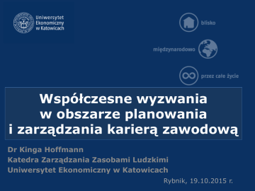 Współczesne wyzwania w obszarze planowania i zarządzania karierą zawodową Dr Kinga Hoffmann Katedra Zarządzania Zasobami Ludzkimi Uniwersytet Ekonomiczny w Katowicach Rybnik, 19.10.2015 r. Plan prezentacji 1. Planowanie a zarządzanie karierą zawodową 2. Wyzwania stojące przed pracownikami oraz ich pracodawcami w obszarze kariery zawodowej 3. Jak studenci Uniwersytetu Ekonomicznego planują swoją karierę zawodową? 4. Wyniki badania opinii studentów Uniwersytetu Ekonomicznego w Katowicach Planowanie a zarządzanie karierą Planowanie kariery – proces ustalania przez daną osobę celów w obszarze jej kariery zawodowej oraz sposobów ich realizacji Zarządzanie karierą w organizacji odnosi się do działań podejmowanych przez przedsiębiorstwo prowadzący do połączenia dróg osiągania celów organizacji i jej pracowników w ramach mniej lub bardziej sformalizowanego programu Uwarunkowania wpływające na karierę (MSCI – my system of career influences) [M. McMahon, M. Watson, W. Patton, 2003, 2013] Czynniki wewnętrzne Wiek Płeć Narodowość Wyznanie Sytuacja rodzinna Kompetencje (wiedza, umiejętności, zdolności, cechy osobowości, kondycja fizyczna, psychiczna, motywacja, zainteresowania) Czynniki zewnętrzne Sytuacja gospodarcza (w tym rynek pracy, rozwój przedsiębiorczości, polityka społeczna, funkcjonowanie sektora bankowości i finansów w kraju, współpraca z zagranicą itp.) Sytuacja prawno-polityczna Rozwój techniki i technologii Uwarunkowania społeczno-kulturowe Sytuacja demograficzna Wyzwania w obszarze planowania kariery Poruszanie się po współczesnym rynku pracy (aplikowanie o pracę, przygotowanie do rozmowy kwalifikacyjnej itd.) Umiejętności komunikowania się z przedstawicielami różnych pokoleń Równowaga praca-życie i jej umiejscowienie w planie kariery Praca w środowisku międzynarodowym Rozwój kompetencji poprzez kształcenie, pracę zawodową, samorozwój oraz nowoczesne formy np. coaching, tutoring, mentoring Wyzwania z perspektywy pracodawcy Zarządzanie różnorodnością (pokoleniową, kulturową, narodowościową, płciową itd.) Kreowanie wizerunku pracodawcy z wyboru (employer branding) Zmiana metodyki w obszarze rekrutacji (media społecznościowe, systemy wspomagające rekrutację, grywalizacja, scouting itp.) Współpraca ze szkołami kształcącymi przyszłych pracowników (szkoły zawodowe, średnie oraz wyższe) Tworzenie (alternatywnych) ścieżek rozwoju kariery zawodowej Zarządzanie talentami Empowerment (upełnomocnienie pracowników) Rozsądne korzystanie z nowoczesnej technologii Wytyczne do planowania/zarządzania karierą – próba identyfikacji na podstawie badania opinii studentów Badania opinii wybranych studentów Uniwersytetu Ekonomicznego w Katowicach dotyczących studiowania oraz szeroko rozumianej współpracy uczelni z otoczeniem biznesowym Metoda: sondaż diagnostyczny, Techniki: ankieta oraz 635 Próba badawcza: 71 studentów (52 – pierwszy rok studiów, 19 – drugi rok studiów) Studenci: Są mocno przeświadczeni o konieczności podejmowania pracy zawodowej i zdobywania innych doświadczeń już w trakcie studiów Oczekują wysokiego poziomu praktyczności zajęć oraz ich przydatności w przyszłej pracy zawodowej Mają wiele pomysłów na współpracę uczelni z biznesem, w które chcieliby się angażować (np. praktyki, jako zajęcia obowiązkowe realizowane w każdym tygodniu, zaliczanie pewnych przedmiotów podczas praktyk itp.) Dużą wagę przywiązują do aktywnego uczestniczenia w życiu uczelnianym oraz organizowanych przez uczelnię inicjatywach np. Dni Kariery, Erasmus+, Tydzień przedsiębiorczości czy Europejski Kongres Gospodarczy Oczekują zmiany podejścia ze strony wykładowców do prowadzonych zajęć Mają dużą wiedzę na temat tego, jakich kompetencji poszukują pracodawcy, dlatego chcą mieć większy wybór w zakresie specjalności, przedmiotów Najważniejsze wnioski z przeprowadzonych badań: Uniwersytet Ekonomiczny w Katowicach (jako instytucja oraz jej pracownicy) odgrywa dużą rolę w planowaniu i wspieraniu planowania kariery zawodowej wśród jego studentów Uczelnia może mieć realny wpływ na zarządzanie karierami oraz zarządzanie talentami w przedsiębiorstwach rozwijając z nimi współpracę na szerszą skalę Dziękuję za uwagę. [email protected]