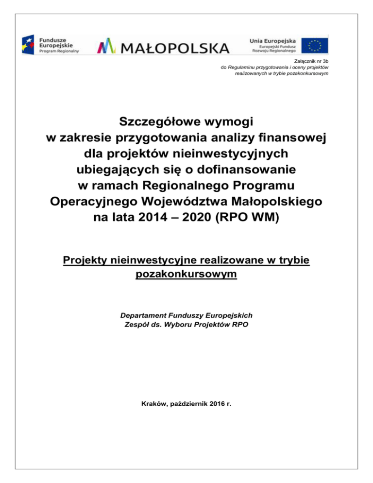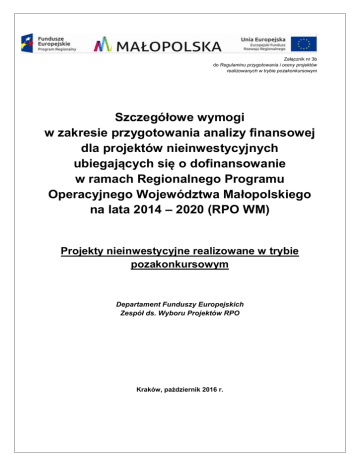 Załącznik nr 3b do Regulaminu przygotowania i oceny projektów realizowanych w trybie pozakonkursowym Szczegółowe wymogi w zakresie przygotowania analizy finansowej dla projektów nieinwestycyjnych ubiegających się o dofinansowanie w ramach Regionalnego Programu Operacyjnego Województwa Małopolskiego na lata 2014 – 2020 (RPO WM) Projekty nieinwestycyjne realizowane w trybie pozakonkursowym Departament Funduszy Europejskich Zespół ds. Wyboru Projektów RPO Kraków, październik 2016 r. Spis treści WPROWADZENIE ................................................................................................................................. 3 SŁOWNIK ............................................................................................................................................... 4 I. ANALIZA ZAŁOŻEŃ FINANSOWYCH .......................................................................................... 5 II. SPOSÓB PREZENTACJI KOSZTÓW PROJEKTU ........................................................................ 5 III. PROGNOZA PRZYCHODÓW W TRAKCIE WDRAŻANIA ...................................................... 6 IV. TRWAŁOŚĆ FINANSOWA PROJEKTU .................................................................................... 7 V. ZASADY DOFINANSOWANIA PROJEKTU NIEINWESTYCYJNEGO ......................................... 8 SPIS ZAŁĄCZNIKÓW ............................................................................................................................ 9 2 WPROWADZENIE Niniejszy dokument odnosi się do projektów nieinwestycyjnych ubiegających się o dofinansowanie w ramach Osi/Działań wdrażanych przez IZ RPO WM, której zadania wykonuje Departament Funduszy Europejskich Urzędu Marszałkowskiego Województwa Małopolskiego, w szczególności w obrębie następujących Działań/Poddziałań: Poddziałanie 6.1.2 Organizacja wydarzeń kulturalnych; Poddziałanie 6.1.3 typ B: Dokumentowanie, zachowanie i upowszechnianie dziedzictwa niematerialnego; Działanie 6.2 typ C: Opracowywanie dokumentów planistycznych dla parków krajobrazowych i rezerwatów przyrody, inwentaryzacja i waloryzacja przyrodnicza gmin. W przypadku zidentyfikowania i zaproszenia do złożenia w trybie pozakonkursowym projektów w ramach powyższych Działań, należy zastosować wymogi określone w niniejszym dokumencie. W dokumencie określono wymagania Instytucji Zarządzającej Regionalnym Programem Operacyjnym Województwa Małopolskiego na lata 2014-2020 w zakresie pożądanej formy części finansowej wniosku o dofinansowanie wobec Wnioskodawców aplikujących o wsparcie w ramach RPO WM na lata 2014 – 2020. Stanowią one narzędzie niezbędne do przygotowania części obliczeniowej w załączniku Excel jak i części opisowej wymaganej w ramach e-wniosku (część M1). Niniejszy dokument stanowi uzupełnienie Regulaminu przygotowania i oceny projektów realizowanych w trybie pozakonkursowym zawierającego podstawowe informacje m.in. dotyczące możliwych typów projektu, rodzaju, poziomu ich dofinansowania oraz obowiązkowych załączników, w tym finansowych Sposób przygotowania części finansowej, podlega weryfikacji w trakcie oceny formalnej i merytorycznej projektów składanych w ramach RPO WM na lata 2014-2020. Szczegółowe wymogi zostały opracowane na podstawie aktualnych uregulowań prawnych, krajowych oraz unijnych. Dopuszczalne jest zastosowanie odmiennych rozwiązań (pod warunkiem ich uzasadnienia), jeżeli tych postulowanych w Wytycznych nie da się zastosować do danego projektu lub ich zastosowanie jest nielogiczne lub niecelowe. W przypadku braku uregulowań w danym zakresie należy skorzystać w szczególności z: 1) Rozporządzenia Parlamentu Europejskiego i Rady (UE) nr 1303/2013 z dnia 17 grudnia 2013 r, dalej Rozporządzenie nr 1303/2013; 2) Wytycznych Ministerstwa Infrastruktury i Rozwoju w zakresie kwalifikowalności wydatków w ramach Europejskiego Funduszu Rozwoju Regionalnego, Europejskiego Funduszu Społecznego oraz Funduszu Spójności na lata 2014-2020; 3) Podręcznika kwalifikowania wydatków objętych dofinansowaniem w ramach Regionalnego Programu Operacyjnego Województwa Małopolskiego na lata 2014-2020. 1 Część e-wniosku odnosząca się do części finansowej projektów. 3 SŁOWNIK Całkowity koszt projektu: suma wydatków kwalifikowalnych i niekwalifikowalnych projektu poniesionych w okresie realizacji projektu, z uwzględnieniem podatku VAT. Całkowity koszt kwalifikowalny projektu: wartość kosztów kwalifikowalnych poniesionych w okresie realizacji projektu, brana pod uwagę przy weryfikacji, czy projekt może zostać zaliczony do kategorii projektów generujących dochód w trakcie wdrażania w przypadku, gdy wartość kosztów kwalifikowanych przekracza równowartość 50 tys. euro2. Okres wdrażania (projekcji finansowych) – okres, za który należy sporządzić prognozę przepływów finansowych w zakresie projektów nieinwestycyjnych. Co do zasady okres ten będzie wyznaczony okresem realizacji projektu wskazanym we wniosku aplikacyjnym. Jedynie w przypadku projektów generujących dochody (przychody) tzn. gdy będą świadczone odpłatne usługi, bądź dostarczane odpłatnie dobra (np. sprzedaż publikacji, biletów, reklama na stronie internetowej), okres ten zgodnie z art. 65 ust. 8 Rozporządzenia nr 1303/2013 kończy się w momencie złożenia przez Beneficjenta wniosku o płatność końcową. Projekt nieinwestycyjny generujący dochód – zgodnie z art. 65 ust. 8 Rozporządzenia nr 1303/2013 jeśli projekt generuje dochód w trakcie wdrażania i nie stosuje się do niego zapisów art. 61 ust. 1- 6 ww. Rozporządzenia, wówczas taki dochód wygenerowany bezpośrednio wyłącznie w trakcie wdrażania, który nie został wzięty pod uwagę przy zatwierdzaniu operacji, odejmuje się od kosztów kwalifikowalnych najpóźniej we wniosku końcowym o płatność. Niniejszy obowiązek nie dotyczy m.in. proj