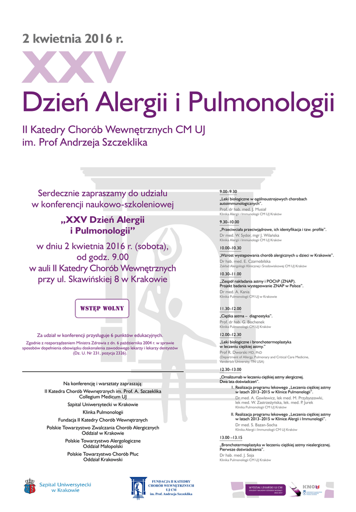 2 kwietnia 2016 r. XXV Dzień Alergii i Pulmonologii II Katedry Chorób Wewnętrznych CM UJ im. Prof Andrzeja Szczeklika Serdecznie zapraszamy do udziału w konferencji naukowo-szkoleniowej 9.00–9.30 „Leki biologiczne w ogólnoustrojowych chorobach autoimmunologicznych”. Prof. dr hab. med. J. Musiał Klinika Alergii i Immunologii CM UJ Kraków „XXV Dzień Alergii i Pulmonologii” 9.30–10.00 „Przeciwciała przeciwjądrowe, ich identyfikacja i tzw. profile”. Dr med. W. Sydor, mgr J. Wilańska w dniu 2 kwietnia 2016 r. (sobota), od godz. 9.00 w auli II Katedry Chorób Wewnętrznych przy ul. Skawińskiej 8 w Krakowie Klinika Alergii i Immunologii CM UJ Kraków 10.00–10.30 „Wzrost występowania chorób alergicznych u dzieci w Krakowie”. Dr hab. med. E. Czarnobilska Zakład Alergologii Klinicznej i Środowiskowej CM UJ Kraków 10.30–11.00 „Zespół nakładania astmy i POChP (ZNAP). Projekt badania występowanie ZNAP w Polsce”. Dr med. A. Kania Klinika Pulmonologii CM UJ w Krakowie WSTĘP WOLNY 11.30–12.00 „Ciężka astma – diagnostyka”. Prof. dr hab. G. Bochenek Klinika Pulmonologii CM UJ Kraków Za udział w konferencji przysługuje 6 punktów edukacyjnych. Zgodnie z rozporządzeniem Ministra Zdrowia z dn. 6 października 2004 r. w sprawie sposobów dopełnienia obowiązku doskonalenia zawodowego lekarzy i lekarzy dentystów (Dz. U. Nr 231, pozycja 2326). 12.00–12.30 „Leki biologiczne i bronchotermoplastyka w leczeniu ciężkiej astmy.” Prof R. Dworski MD, PhD (Department of Allergy, Pulmonary and Critical Care Medicine, Vanderbilt University, TN USA) 12.30–13.00 Na konferencję i warsztaty zapraszają: II Katedra Chorób Wewnętrznych im. Prof. A. Szczeklika Collegium Medicum UJ Szpital Uniwersytecki w Krakowie „Omalizumab w leczeniu ciężkiej astmy alergicznej. Dwa lata doświadczeń”. 1. Realizacja programu lekowego „Leczenia ciężkiej astmy w latach 2013–2015 w Klinice Pulmonologii”. Dr med. A. Gawlewicz, lek med. M. Przybyszowki, lek med. W. Zastrzeżyńska, lek. med. P. Jurek Klinika Pulmonologii CM UJ Kraków Klinka Pulmonologii Fundacja II Katedry Chorób Wewnętrznych Polskie Towarzystwo Zwalczania Chorób Alergicznych Oddział w Krakowie Polskie Towarzystwo Alergologiczne Oddział Małopolski II. Realizacja programu lekowego „Leczenia ciężkiej astmy w latach 2013–2015 w Klinice Alergii i Immunologii”. Dr med. S. Bazan-Socha Klinika Alergii i Immunologii CM UJ Kraków 13.00 –13.15 „Bronchotermoplastyka w leczeniu ciężkiej astmy niealergicznej. Pierwsze doświadczenia”. Dr hab. med. J. Soja Polskie Towarzystwo Chorób Płuc Oddział Krakowski Klinika Pulmonologii CM UJ Kraków FUNDACJA II KATEDRY CHORÓB WEWNĘTRZNYCH UJ CM im. Prof. Andrzeja Szczeklika
