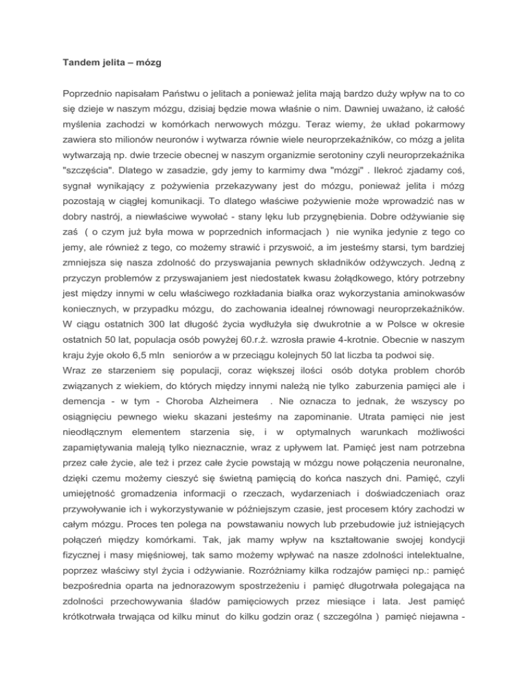 Tandem jelita – mózg Poprzednio napisałam Państwu o jelitach a ponieważ jelita mają bardzo duży wpływ na to co się dzieje w naszym mózgu, dzisiaj będzie mowa właśnie o nim. Dawniej uważano, iż całość myślenia zachodzi w komórkach nerwowych mózgu. Teraz wiemy, że układ pokarmowy zawiera sto milionów neuronów i wytwarza równie wiele neuroprzekaźników, co mózg a jelita wytwarzają np. dwie trzecie obecnej w naszym organizmie serotoniny czyli neuroprzekaźnika "szczęścia". Dlatego w zasadzie, gdy jemy to karmimy dwa "mózgi" . Ilekroć zjadamy coś, sygnał wynikający z pożywienia przekazywany jest do mózgu, ponieważ jelita i mózg pozostają w ciągłej komunikacji. To dlatego właściwe pożywienie może wprowadzić nas w dobry nastrój, a niewłaściwe wywołać - stany lęku lub przygnębienia. Dobre odżywianie się zaś ( o czym już była mowa w poprzednich informacjach ) nie wynika jedynie z tego co jemy, ale również z tego, co możemy strawić i przyswoić, a im jesteśmy starsi, tym bardziej zmniejsza się nasza zdolność do przyswajania pewnych składników odżywczych. Jedną z przyczyn problemów z przyswajaniem jest niedostatek kwasu żołądkowego, który potrzebny jest między innymi w celu właściwego rozkładania białka oraz wykorzystania aminokwasów koniecznych, w przypadku mózgu, do zachowania idealnej równowagi neuroprzekaźników. W ciągu ostatnich 300 lat długość życia wydłużyła się dwukrotnie a w Polsce w okresie ostatnich 50 lat, populacja osób powyżej 60.r.ż. wzrosła prawie 4-krotnie. Obecnie w naszym kraju żyje około 6,5 mln seniorów a w przeciągu kolejnych 50 lat liczba ta podwoi się. Wraz ze starzeniem się populacji, coraz większej ilości osób dotyka problem chorób związanych z wiekiem, do których między innymi należą nie tylko zaburzenia pamięci ale i . Nie oznacza to jednak, że wszyscy po demencja - w tym - Choroba Alzheimera osiągnięciu pewnego wieku skazani jesteśmy na zapominanie. Utrata pamięci nie jest nieodłącznym elementem starzenia się, i w optymalnych warunkach możliwości zapamiętywania maleją tylko nieznacznie, wraz z upływem lat. Pamięć jest nam potrzebna przez całe życie, ale też i przez całe życie powstają w mózgu nowe połączenia neuronalne, dzięki czemu możemy cieszyć się świetną pamięcią do końca naszych dni. Pamięć, czyli umiejętność gromadzenia informacji o rzeczach, wydarzeniach i doświadczeniach oraz przywoływanie ich i wykorzystywanie w późniejszym czasie, jest procesem który zachodzi w całym mózgu. Proces ten polega na powstawaniu nowych lub przebudowie już istniejących połączeń między komórkami. Tak, jak mamy wpływ na kształtowanie swojej kondycji fizycznej i masy mięśniowej, tak samo możemy wpływać na nasze zdolności intelektualne, poprzez właściwy styl życia i odżywianie. Rozróżniamy kilka rodzajów pamięci np.: pamięć bezpośrednia oparta na jednorazowym spostrzeżeniu i pamięć długotrwała polegająca na zdolności przechowywania śladów pamięciowych przez miesiące i lata. Jest pamięć krótkotrwała trwająca od kilku minut do kilku godzin oraz ( szczególna ) pamięć niejawna - odpowiedzialna za wykonywanie przez nas w sposób odruchowy określonych czynności, np. zamykanie drzwi - o fakcie tym często nie wiemy i mamy kłopoty z jego przypomnieniem sobie, czyli nie wiemy że ..., ale wiemy jak... Wytworzenie zdolności zapamiętywania jest jednym z największych osiągnięć ewolucji i jedną z najwspanialszych właściwości mózgu człowieka. Całość operacji umysłowych, obejmujących: myślenie, pamięć i zdolności poznawcze, procesy postrzegania i językowe, funkcje wzrokowo - przestrzenne oraz wykonawcze, składa się na nasz intelekt. Większość ludzi uważa, że inteligencja jest wrodzona i nie można nic zrobić aby ją zmienić. Wprawdzie istnieje wyraźny - wrodzony wskaźnik inteligencji, ale psycholodzy twierdzą, że wykorzystujemy tylko mniej niż 1% naszych intelektualnych możliwości a tymczasem, codziennie w naszych głowach powstają tysiące ( około 60 tys. ) myśli, z których znaczną część stanowią powtórzenia a każda pojedyncza myśl, która pojawia się w naszej głowie wzbudza "falę" aktywności w sieci wyspecjalizowanych komórek nerwowych o których była już mowa - neuronów, których mamy sto miliardów a każdy z nich łączy się z tysiącami innych. Neurony mają "ramiona" zwane dendrytami , na końcu każdego z nich znajduje się akson. W miejscu, gdzie akson spotyka się z drugim neuronem, występuje szczelina ( jak szczelina w świecy samochodowej pozwalająca na przeskok iskry ) - miejsce to nazywa się synapsą. Przez nie przesyłane są sygnały - w rzeczywistości substancje chemiczne, zwane neuroprzekaźnikami - z jednego neuronu do drugiego. "Stacje" nadające i odbierające sygnały, zwane receptorami, zbudowane są z niezbędnych kwasów tłuszczowych, fosfolipidów i aminokwasów. Zamiana aminokwasu w neuroprzekaźnik nie jest prostym zadaniem. Dokonuje się to dzięki enzymom w mózgu, zależnym od składników odżywczych "inteligencji". Zaliczają się do nich witaminy, biopierwiastki oraz specyficzne aminokwasy. Każdy z nas może więc zapytać: skąd mam więc wiedzieć , czy istnieje u mnie niedobór niezbędnych dla dobrego funkcjonowania mózgu składników odżywczych ? Jednym ze sposobów zorientowania się w tym względzie jest szybkość przebiegu procesów myślowych. Zdrowy mózg przetwarza myśl w 320 milisekund, czyli mniej więcej w 1/3 sekundy. U osób z osłabioną pamięcią związaną z wiekiem trwa to 489 milisekund tj. niemal pół sekundy - ludzie w podobnym wieku, ale bez osłabienia pamięci, przetwarzają myśl w ciągu 396 milisekund. Wydaje się, że wiek spowalnia myślenie, ale dalece mniej niż proces chorobowy, który często prowadzi do choroby Alzheimera, co do której istnieje przekonanie