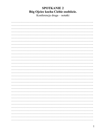 SPOTKANIE 2 Bóg Ojciec kocha Ciebie osobiście. Konferencja druga – notatki ………………………………………………………………………. ………………………………………………………………………. ………………………………………………………………………. ………………………………………………………………………. ………………………………………………………………………. ………………………………………………………………………. ………………………………………………………………………. ………………………………………………………………………. ………………………………………………………………………. ………………………………………………………………………. ………………………………………………………………………. ………………………………………………………………………. ………………………………………………………………………. ………………………………………………………………………. ………………………………………………………………………. ………………………………………………………………………. ………………………………………………………………………. ………………………………………………………………………. ………………………………………………………………………. ………………………………………………………………………. ………………………………………………………………………. ………………………………………………………………………. ………………………………………………………………………. ………………………………………………………………………. ………………………………………………………………………. ………………………………………………………………………. ………………………………………………………………………. ………………………………………………………………………. ………………………………………………………………………. ………………………………………………………………………. ………………………………………………………………………. ………………………………………………………………………. 1 ………………………………………………………………………. ………………………………………………………………………. ………………………………………………………………………. ………………………………………………………………………. ………………………………………………………………………. ………………………………………………………………………. ………………………………………………………………………. ………………………………………………………………………. ………………………………………………………………………. ………………………………………………………………………. ………………………………………………………………………. ………………………………………………………………………. ………………………………………………………………………. ………………………………………………………………………. ………………………………………………………………………. ………………………………………………………………………. ………………………………………………………………………. ………………………………………………………………………. ………………………………………………………………………. ………………………………………………………………………. ………………………………………………………………………. ………………………………………………………………………. ………………………………………………………………………. ………………………………………………………………………. ………………………………………………………………………. ………………………………………………………………………. ………………………………………………………………………. ………………………………………………………………………. ………………………………………………………………………. ………………………………………………………………………. ………………………………………………………………………. ………………………………………………………………………. ………………………………………………………………………. ………………………………………………………………………. ………………………………………………………………………. ………………………………………………………………………. ……………………………………………………………………….. 2 Nie lękaj się, bo cię wykupiłem, wezwałem cię po imieniu; tyś moim! (...) Drogi jesteś w oczach moich (...) i Ja cię miłuję. (Iz 43, 1-4) Ojciec niebieski pragnie, abyś w tym ty