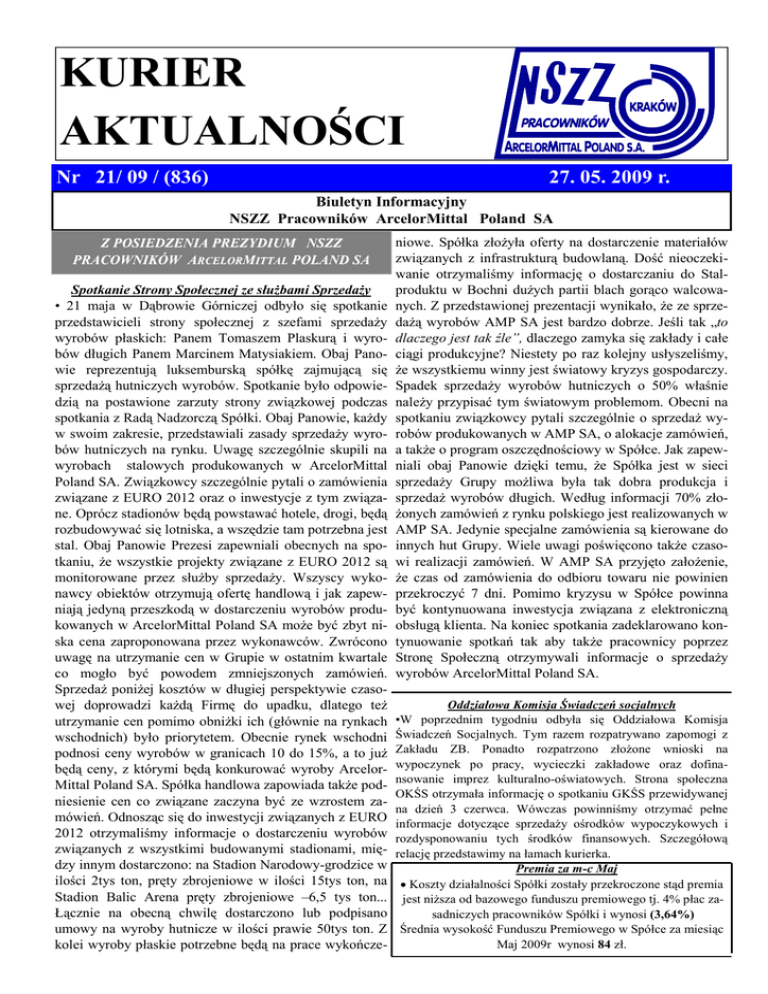 KURIER AKTUALNOŚCI Nr 21/ 09 / (836) 27. 05. 2009 r. Biuletyn Informacyjny NSZZ Pracowników ArcelorMittal Poland SA Z POSIEDZENIA PREZYDIUM NSZZ PRACOWNIKÓW ARCELORMITTAL POLAND SA Spotkanie Strony Społecznej ze słuŜbami SprzedaŜy • 21 maja w Dąbrowie Górniczej odbyło się spotkanie przedstawicieli strony społecznej z szefami sprzedaŜy wyrobów płaskich: Panem Tomaszem Plaskurą i wyrobów długich Panem Marcinem Matysiakiem. Obaj Panowie reprezentują luksemburską spółkę zajmującą się sprzedaŜą hutniczych wyrobów. Spotkanie było odpowiedzią na postawione zarzuty strony związkowej podczas spotkania z Radą Nadzorczą Spółki. Obaj Panowie, kaŜdy w swoim zakresie, przedstawiali zasady sprzedaŜy wyrobów hutniczych na rynku. Uwagę szczególnie skupili na wyrobach stalowych produkowanych w ArcelorMittal Poland SA. Związkowcy szczególnie pytali o zamówienia związane z EURO 2012 oraz o inwestycje z tym związane. Oprócz stadionów będą powstawać hotele, drogi, będą rozbudowywać się lotniska, a wszędzie tam potrzebna jest stal. Obaj Panowie Prezesi zapewniali obecnych na spotkaniu, Ŝe wszystkie projekty związane z EURO 2012 są monitorowane przez słuŜby sprzedaŜy. Wszyscy wykonawcy obiektów otrzymują ofertę handlową i jak zapewniają jedyną przeszkodą w dostarczeniu wyrobów produkowanych w ArcelorMittal Poland SA moŜe być zbyt niska cena zaproponowana przez wykonawców. Zwrócono uwagę na utrzymanie cen w Grupie w ostatnim kwartale co mogło być powodem zmniejszonych zamówień. SprzedaŜ poniŜej kosztów w długiej perspektywie czasowej doprowadzi kaŜdą Firmę do upadku, dlatego teŜ utrzymanie cen pomimo obniŜki ich (głównie na rynkach wschodnich) było priorytetem. Obecnie rynek wschodni podnosi ceny wyrobów w granicach 10 do 15%, a to juŜ będą ceny, z którymi będą konkurować wyroby ArcelorMittal Poland SA. Spółka handlowa zapowiada takŜe podniesienie cen co związane zaczyna być ze wzrostem zamówień. Odnosząc się do inwestycji związanych z EURO 2012 otrzymaliśmy informacje o dostarczeniu wyrobów związanych z wszystkimi budowanymi stadionami, między innym dostarczono: na Stadion Narodowy-grodzice w ilości 2tys ton, pręty zbrojeniowe w ilości 15tys ton, na Stadion Balic Arena pręty zbrojeniowe –6,5 tys ton... Łącznie na obecną chwilę dostarczono lub podpisano umowy na wyroby hutnicze w ilości prawie 50tys ton. Z kolei wyroby płaskie potrzebne będą na prace wykończe- niowe. Spółka złoŜyła oferty na dostarczenie materiałów związanych z infrastrukturą budowlaną. Dość nieoczekiwanie otrzymaliśmy informację o dostarczaniu do Stalproduktu w Bochni duŜych partii blach gorąco walcowanych. Z przedstawionej prezentacji wynikało, Ŝe ze sprzedaŜą wyrobów AMP SA jest bardzo dobrze. Jeśli tak „to dlaczego jest tak źle”, dlaczego zamyka się zakłady i całe ciągi produkcyjne? Niestety po raz kolejny usłyszeliśmy, Ŝe wszystkiemu winny jest światowy kryzys gospodarczy. Spadek sprzedaŜy wyrobów hutniczych o 50% właśnie naleŜy przypisać tym światowym problemom. Obecni na spotkaniu związkowcy pytali szczególnie o sprzedaŜ wyrobów produkowanych w AMP SA, o alokacje zamówień, a takŜe o program oszczędnościowy w Spółce. Jak zapewniali obaj Panowie dzięki temu, Ŝe Spółka jest w sieci sprzedaŜy Grupy moŜliwa była tak dobra produkcja i sprzedaŜ wyrobów długich. Według informacji 70% złoŜonych zamówień z rynku polskiego jest realizowanych w AMP SA. Jedynie specjalne zamówienia są kierowane do innych hut Grupy. Wiele uwagi poświęcono takŜe czasowi realizacji zamówień. W AMP SA przyjęto załoŜenie, Ŝe czas od zamówienia do odbioru towaru nie powinien przekroczyć 7 dni. Pomimo kryzysu w Spółce powinna być kontynuowana inwestycja związana z elektroniczną obsługą klienta. Na koniec spotkania zadeklarowano kontynuowanie spotkań tak aby takŜe pracownicy poprzez Stronę Społeczną otrzymywali informacje o sprzedaŜy wyrobów ArcelorMittal Poland SA. Oddziałowa Komisja Świadczeń socjalnych ▪W poprzednim tygodniu odbyła się Oddziałowa Komisja Świadczeń Socjalnych. Tym razem rozpatrywano zapomogi z Zakładu ZB. Ponadto rozpatrzono złoŜone wnioski na wypoczynek po pracy, wycieczki zakładowe oraz dofinansowanie imprez kulturalno-oświatowych. Strona społeczna OKŚS otrzymała informację o spotkaniu GKŚS przewidywanej na dzień 3 czerwca. Wówczas powinniśmy otrzymać pełne informacje dotyczące sprzedaŜy ośrodków wypoczykowych i rozdysponowaniu tych środków finansowych. Szczegółową relację przedstawimy na łamach kurierka. Premia za m-c Maj • Koszty działalności Spółki zostały przekroczone stąd premia jest niŜsza od bazowego funduszu premiowego tj. 4% płac zasadniczych pracowników Spółki i wynosi (3,64%) Średnia wysokość Funduszu Premiowego w Spółce za miesiąc Maj 2009r wynosi 84 zł. 2 KURIER AKTUALNOŚCI NSZZ PRACOWNIKÓW Odpowiedź Ministerstwa Gospodarki na wystąpienie organizacji związkowych do Prezesa Rady Ministrów ▪ Otrzymaliśmy pismo w sprawie wystąpienia organizacji związkowych do Prezesa Rady Ministrów. W swej odpowiedzi ministerstwo gospodarki skupiło się jedynie na kwestiach związanych z importem wyrobów stalowych z Rosji do UE oraz na informacji o kryzysie gospodarczym. Niestety nie otrzymaliśmy nawet wzmianki o planach Rządu, które mogłyby poprawić sytuację Firm działających w Polsce. Slogany cytowane w piśmie są wszystkim znane, a ich powtarzanie staje się nudne. Nie takich informacji oczekiwaliśmy. Wybiórczo przedstawiamy tekst odpowiedzi: …...Kwestie importu wyrobów stalowych z Rosji do UE są uregulowane w dwustronnej umowie zawartej pomiędzy UE i Federacją Rosyjską z dnia 26 października 2007 r. Umowa ta przewiduje limity w dostępie do rynku unijnego dla rosyjskich wyrobów stalowych. Obecnie limit ten dla wszystkich 27 krajów członkowskich UE