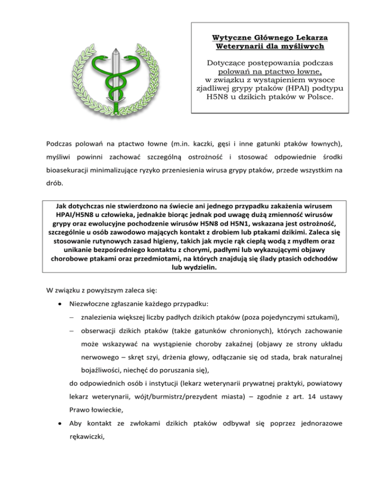 Wytyczne Głównego Lekarza Weterynarii dla myśliwych Dotyczące postępowania podczas polowań na ptactwo łowne, w związku z wystąpieniem wysoce zjadliwej grypy ptaków (HPAI) podtypu H5N8 u dzikich ptaków w Polsce. Podczas polowań na ptactwo łowne (m.in. kaczki, gęsi i inne gatunki ptaków łownych), myśliwi powinni zachować szczególną ostrożność i stosować odpowiednie środki bioasekuracji minimalizujące ryzyko przeniesienia wirusa grypy ptaków, przede wszystkim na drób. Jak dotychczas nie stwierdzono na świecie ani jednego przypadku zakażenia wirusem HPAI/H5N8 u człowieka, jednakże biorąc jednak pod uwagę dużą zmienność wirusów grypy oraz ewolucyjne pochodzenie wirusów H5N8 od H5N1, wskazana jest ostrożność, szczególnie u osób zawodowo mających kontakt z drobiem lub ptakami dzikimi. Zaleca się stosowanie rutynowych zasad higieny, takich jak mycie rąk ciepłą wodą z mydłem oraz unikanie bezpośredniego kontaktu z chorymi, padłymi lub wykazującymi objawy chorobowe ptakami oraz przedmiotami, na których znajdują się ślady ptasich odchodów lub wydzielin. W związku z powyższym zaleca się: Niezwłoczne zgłaszanie każdego przypadku: znalezienia większej liczby padłych dzikich ptaków (poza pojedynczymi sztukami), obserwacji dzikich ptaków (także gatunków chronionych), których zachowanie może wskazywać na wystąpienie choroby zakaźnej (objawy ze strony układu nerwowego – skręt szyi, drżenia głowy, odłączanie się od stada, brak naturalnej bojaźliwości, niechęć do poruszania się), do odpowiednich osób i instytucji (lekarz weterynarii prywatnej praktyki, powiatowy lekarz weterynarii, wójt/burmistrz/prezydent miasta) – zgodnie z art. 14 ustawy Prawo łowieckie, Aby kontakt ze zwłokami dzikich ptaków odbywał się poprzez jednorazowe rękawiczki, Aby po każdym kontakcie z żywymi dzikimi ptakami lub ich zwłokami umyć ręce wodą z mydłem oraz oczyścić i zdezynfekować odpowiednio obuwie i odzież, Aby psy myśliwskie, które biorą udział w polowaniach nie powinny mieć kontaktu z drobiem przez co najmniej 72 godziny od momentu zakończenia polowania, Aby myśliwi, którzy uczestniczyli w polowaniu na ptactwo łowne nie wykonywali czynności związanych z obsługą drobiu w ciągu 72 godzin od zakończenia polowania, Aby odzież, obuwie i inne sprzęty wykorzystane podczas polowania, które mogą być skażone, po zakończeniu polowania zostały poddane oczyszczaniu i dezynfekcji, zanim zostaną wprowadzone do gospodarstwa, w którym utrzymywany jest drób, Umieszczanie znalezionych martwych lub upolowanych ptaków podejrzanych o chorobę w pojemniku lub worku, który zabezpieczy przed ewentualnym rozprzestrzenieniem się wirusa grypy ptaków poprzez krew, wydzieliny lub wydaliny padłych lub odstrzelonych ptaków.