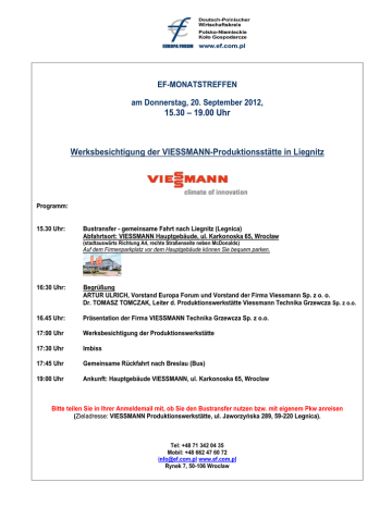 EF-MONATSTREFFEN am Donnerstag, 20. September 2012, 15.30 – 19.00 Uhr Werksbesichtigung der VIESSMANN-Produktionsstätte in Liegnitz Programm: 15.30 Uhr: Bustransfer - gemeinsame Fahrt nach Liegnitz (Legnica) Abfahrtsort: VIESSMANN Hauptgebäude, ul. Karkonoska 65, Wrocław (stadtauswärts Richtung A4, rechte Straßenseite neben McDonalds) Auf dem Firmenparkplatz vor dem Hauptgebäude können Sie bequem parken. 16:30 Uhr: Begrüßung ARTUR ULRICH, Vorstand Europa Forum und Vorstand der Firma Viessmann Sp. z o. o. Dr. TOMASZ TOMCZAK, Leiter d. Produktionswerkstätte Viessmann Technika Grzewcza Sp. z o.o. 16.45 Uhr: Präsentation der Firma VIESSMANN Technika Grzewcza Sp. z o.o. 17:00 Uhr Werksbesichtigung der Produktionswerkstätte 17:30 Uhr Imbiss 17:45 Uhr Gemeinsame Rückfahrt nach Breslau (Bus) 19:00 Uhr Ankunft: Hauptgebäude VIESSMANN, ul. Karkonoska 65, Wrocław Bitte teilen Sie in Ihrer Anmeldemail mit, ob Sie den Bustransfer nutzen bzw. mit eigenem Pkw anreisen (Zieladresse: VIESSMANN Produktionswerkstätte, ul. Jaworzyńska 289, 59-220 Legnica). Tel: +48 71 342 04 35 Mobil: +48 662 47 60 72 [email protected] www.ef.com.pl Rynek 7, 50-106 Wrocław SPOTKANIE EUROPA FORUM w czwartek, 20 września 2012 godz. 15.30 – 19.00 Zwiedzanie Zakładu Produkcyjnyjnego firmy VIESSMANN w Legnicy Program: godz. 15.30: Zorganizowany przejazd autokarem do Legnicy Odjazd: Centrala VIESSMANN, ul. Karkonoska 65, Wrocław Możliwość zaparkowania auta na parkingu firmy. godz. 16:30 Powitanie ARTUR ULRICH, Zarząd Europa Forum i Prezes Viessmann Sp. z o.o. dr TOMASZ TOMCZAK, Dyrektor Zakł. Produkcyjnego Viessmann Technika Grzewcza Sp. z o.o. godz. 16:45 Prezentacja firmy Viessmann Technika Grzewcza Sp. z o.o. godz. 17:00 Zwiedzanie zakładu produkcyjnego godz. 17:30 Poczęstunek godz. 17:45 Wspólny powrót autokarem do Wrocławia godz. 19:00 Przyjazd: Centrala VIESSMANN, ul. Karkonoska 65, Wrocław Prosimy o informację zwrotną, czy korzystają Państwo z przejazdu autokarem czy dojazd we własnym zakresie (adres docelowy: Zakład Produkcyjny VIESSMANN, ul. Jaworzyńska 289, 59-220 Legnica) Tel.: +48 71 342 04 35 Kom.: +48 662 47 60 72 [email protected] www.ef.com.pl Rynek 7, 50-106 Wrocław
