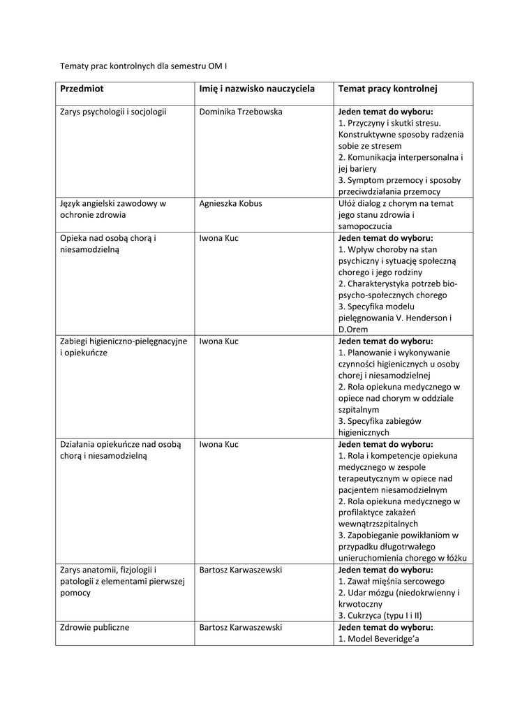 Przedmiot Imię i nazwisko nauczyciela Temat pracy kontrolnej