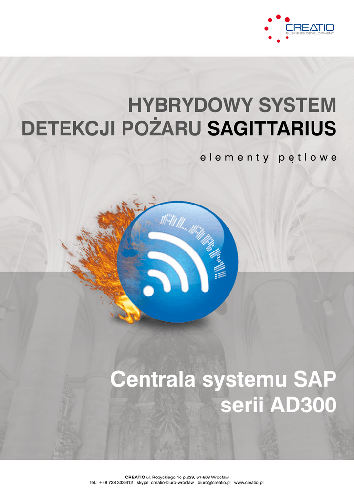 HYBRYDOWY SYSTEM DETEKCJI POŻARU SAGITTARIUS elementy pętlowe Centrala systemu SAP serii AD300 CREATIO ul. Różyckiego 1c p.229, 51-608 Wrocław tel.: +48 728 333 612 skype: creatio-biuro-wroclaw [email protected] www.creatio.pl elementy pętlowe Centrala systemu SAP serii AD300 Wersje wyposażenia: AD301C: centrala obsługująca 1 pętlę AD302C: centrala obsługująca 2 pętle AD332: karta ze złączem RS232 AD385: karta ze złączem RS485 AD3IP: karta ze złączem sieci lokalnej TCP/IP Cechy i zalety urządzenia: • zaprojektowane zgodnie z normami EN54-2 oraz EN54-4 • obsługuje do 240 urządzeń Opis urządzenia: Centrale serii AD300 firmy Advantronic są doskonałym rozwiązaniem dla małych i średnich instalacji alarmowych. Każda pętla obsługuje do 240 urządzeń i posiada komunikację dwukierunkową. • obsługuje 20 sekcji alarmowych z sygnalizacją ich stanu diodami LED • 2 programowalne obwody sygnalizacji dźwiękowej • 2 programowalne przekaźniki Centrale ochrony p.poż. serii AD300 wyposażone są w nowoczesne algorytmy wykrywania pożaru, pozwalające na minimalizację liczby fałszywych alarmów, a tym samym na precyzyjną sygnalizację rzeczywistych zdarzeń. • wyświetlacz LCD zawierający 4 wiersze po 40 znaków każdy Połączenie powyżej opisanych cech wraz z szeroką gamą dostępnych interfejsów czyni centrale serii AD 300 bardzo uniwersalnymi i niezawodnymi urządzeniami o ugruntowanej pozycji na rynku europejskim. • złącze USB Centrale alarmowe serii AD 300 są kompatybilne z bezprzewodowymi i pętlowymi urządzeniami serii Sagittarius, Altair oraz Vega. AD 300 –1– • pojemność pamięci: 1000 zdarzeń • programowanie z poziomu centrali lub przy pomocy dedykowanego oprogramowania • opcjonalne karty RS232, RS485 i TCP/IP • możliwość współpracy z 32 centralami podłączonymi do karty RS485 • opcjonalny modem GSM z możliwością sygnalizacji alarmu oraz komunikatu błędu • CPD: 0370-CPD-1096 CREATIO ul. Różyckiego 1c p.229, 51-608 Wrocław tel.: +48 728 333 612 skype: creatio-biuro-wroclaw e-mail: [email protected] elementy pętlowe Centrale ochrony p.poż. serii AD300 dostępne są w dwóch wersjach: z obsługą jednej lub dwóch pętli alarmowych. Mogą pracować w sieci oraz współpracować z drukarkami i systemami wizualizacji (np. Advantronic ASG300, GEMOS). • złącze USB pozwala na zapis i odczyt konfiguracji urządzenia na komputer PC oraz na eksport historii zdarzeń oraz terminów obsługi serwisowej. • porty COM1 i COM2 oferują możliwość podłączenia poprzez interfejsy: – RS232 (maksymalna prędkość połączenia 9600 Bd), – RS485 (do 32 central, maksymalna długość połączenia 1200 m) – TCP/IP • centrala jest w pełni kompatybilna z bezprzewodowymi i pętlowymi urządzeniami serii SG, V oraz A produkcji firmy Argus Security, m.in.: SG100, SG200, SG350, SGWE100, SGCP100, SGMC200, SGMI200, VW2W100, VBLE100, VCP100, VLS100, VMC100, VMI100, A1000, A2000, V3500 oraz ich odmianami. Specyfikacja techniczna centrali: napięcie zasilania 220 VAC pobór mocy 100 W prąd na wyjściu sygnalizacji dźwiękowej max. 300 mA wyjścia przekaźników 30 V, 1 A zasilanie pomocnicze 24 VDC max. 400 mA 12 VDC/7 Ah (2 szt.) akumulator liczba obsługiwanych pętli liczba urządzeń w pętli 240 napięcie w pętli 24 VDC długość kabla pojedynczej pętli 2000 m temperatura pracy -5°C ... +50°C wilgotność w miejscu pracy (bez kondensacji) 27,6 VDC AD 300 –2– > 95% stopień ochrony IP30 wymiary obudowy napięcie ładowania akumulatora 1 lub 2 420×360×85 mm waga (bez akumulatorów) CREATIO ul. Różyckiego 1c p.229, 51-608 Wrocław tel.: +48 728 333 612 skype: creatio-biuro-wroclaw e-mail: [email protected] 4,5 kg